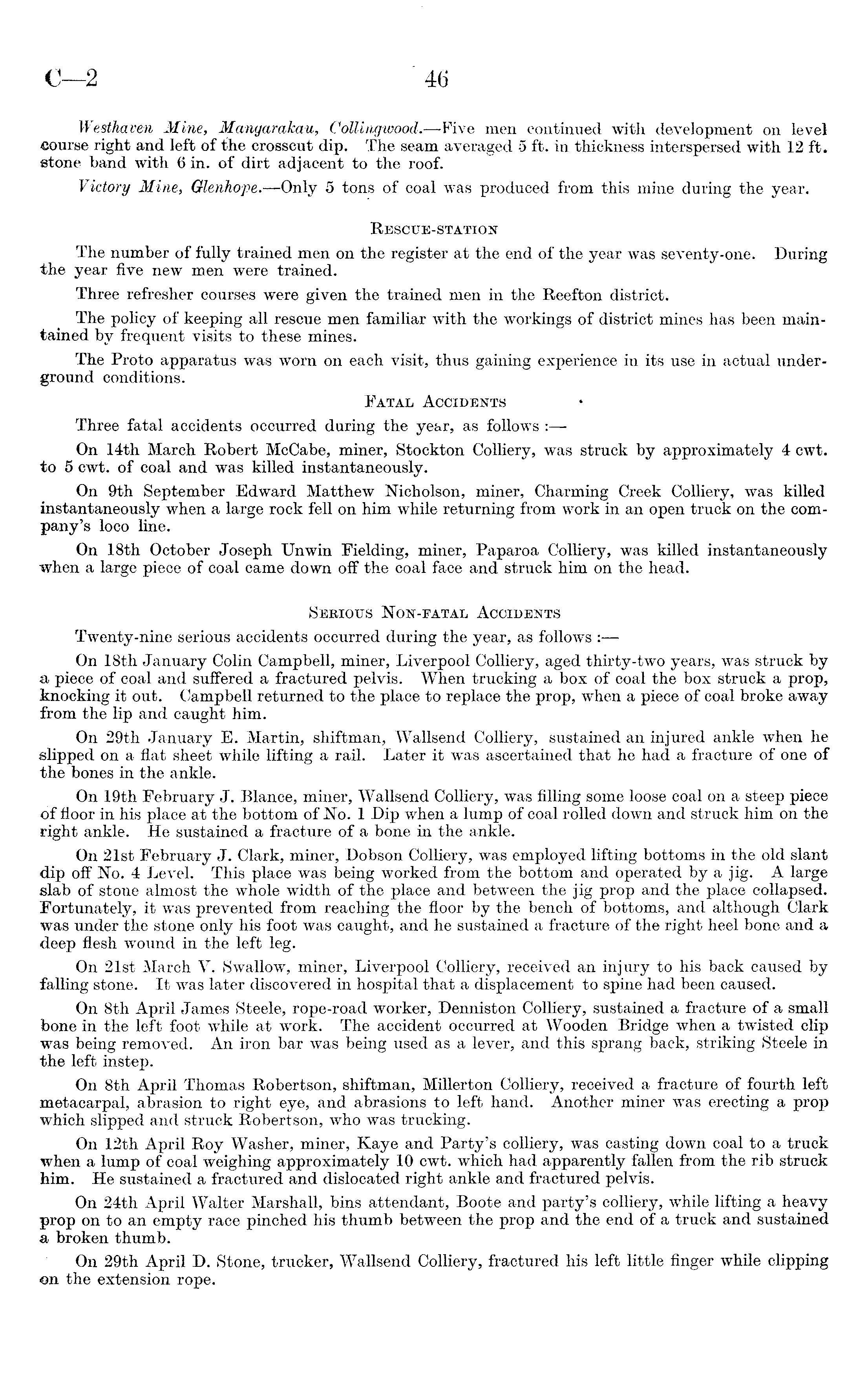 Westhaven Mine, Mangarakau, Gollingwood.—Five men continued with development on level course right and left of the crosscut dip. The seam averaged 5 ft. in thickness interspersed with 12 ft, etone band with 6 in. of dirt adjacent to the roof. Victory Mine, Glenhope.—Only 5 tons of coal was produced from this mine during the year. Rescue-station The number of fully trained men on the register at the end of the year was seventy-one. During the year five new men were trained. Three refresher courses were given the trained men in the Reefton district. The policy of keeping all rescue men familiar with the workings of district mines has been maintained by frequent visits to these mines. The Proto apparatus was worn on each visit, thus gaining experience in its use in actual underground conditions. Fatal Accidents Three fatal accidents occurred during the year, as follows : On 14th March Robert McCabe, miner, Stockton Colliery, was struck by approximately 4 cwt. to 5 cwt. of coal and was killed instantaneously. On 9th September Edward Matthew Nicholson, miner, Charming Creek Colliery, was killed instantaneously when a large rock fell on him while returning from work in an open truck on the company's loco line. On 18th October Joseph Unwin Fielding, miner, Paparoa Colliery, was killed instantaneously when a large piece of coal came down off the coal face and struck him on the head. Serious Non-fatal Accidents Twenty-nine serious accidents occurred during the year, as follows : On 18th January Colin Campbell, miner, Liverpool Colliery, aged thirty-two years, was struck by a, piece of coal and suffered a fractured pelvis. When trucking a box of coal the box struck a prop, knocking it out. Campbell returned to the place to replace the prop, when a piece of coal broke away from the lip and caught him. On 29th January E. Martin, shiftman, Wallsend Colliery, sustained an injured ankle when he slipped on a flat sheet while lifting a rail. Later it was ascertained that he had a fracture of one of the bones in the ankle. On 19th February J. Blance, miner, Wallsend Colliery, was filling some loose coal on a steep piece of floor in his place at the bottom of No. 1 Dip when a lump of coal rolled down and struck him on the right ankle. He sustained a fracture of a bone in the ankle. On 21st February J. Clark, miner, Dobson Colliery, was employed lifting bottoms in the old slant dip off No. 4 Level. This place was being worked from the bottom and operated by a jig. A large slab of stone almost the whole width of the place and between the jig prop and the place collapsed. Fortunately, it was prevented from reaching the floor by the bench of bottoms, and although Clark was under the stone only his foot was caught, and he sustained a fracture of the right heel bone and a deep flesh wound in the left leg. On 21st March V. Swallow, miner, Liverpool Colliery, received an injury to his back caused by falling stone. It was later discovered in hospital that a displacement to spine had been caused. On Bth April James Steele, rope-road worker, Denniston Colliery, sustained a fracture of a small bone in the left foot while at work. The accident occurred at Wooden Bridge when a twisted clip was being removed. An iron bar was being used as a lever, and this sprang back, striking Steele in the left instep. On Bth April Thomas Robertson, shiftman, Millerton Colliery, received a fracture of fourth left metacarpal, abrasion to right eye, and abrasions to left hand. Another miner was erecting a prop which slipped and struck Robertson, who was trucking. On 12th April Roy Washer, miner, Kaye and Party's colliery, was casting down coal to a truck when a lump of coal weighing approximately 10 cwt. which had apparently fallen from the rib struck him. He sustained a fractured and dislocated right ankle and fractured pelvis. On 24th April Walter Marshall, bins attendant, Boote and party's colliery, while lifting a heavy prop on to an empty race pinched his thumb between the prop and the end of a truck and sustained a broken thumb. On 29th April D. Stone, trucker, Wallsend Colliery, fractured his left little finger while clipping en the extension rope.