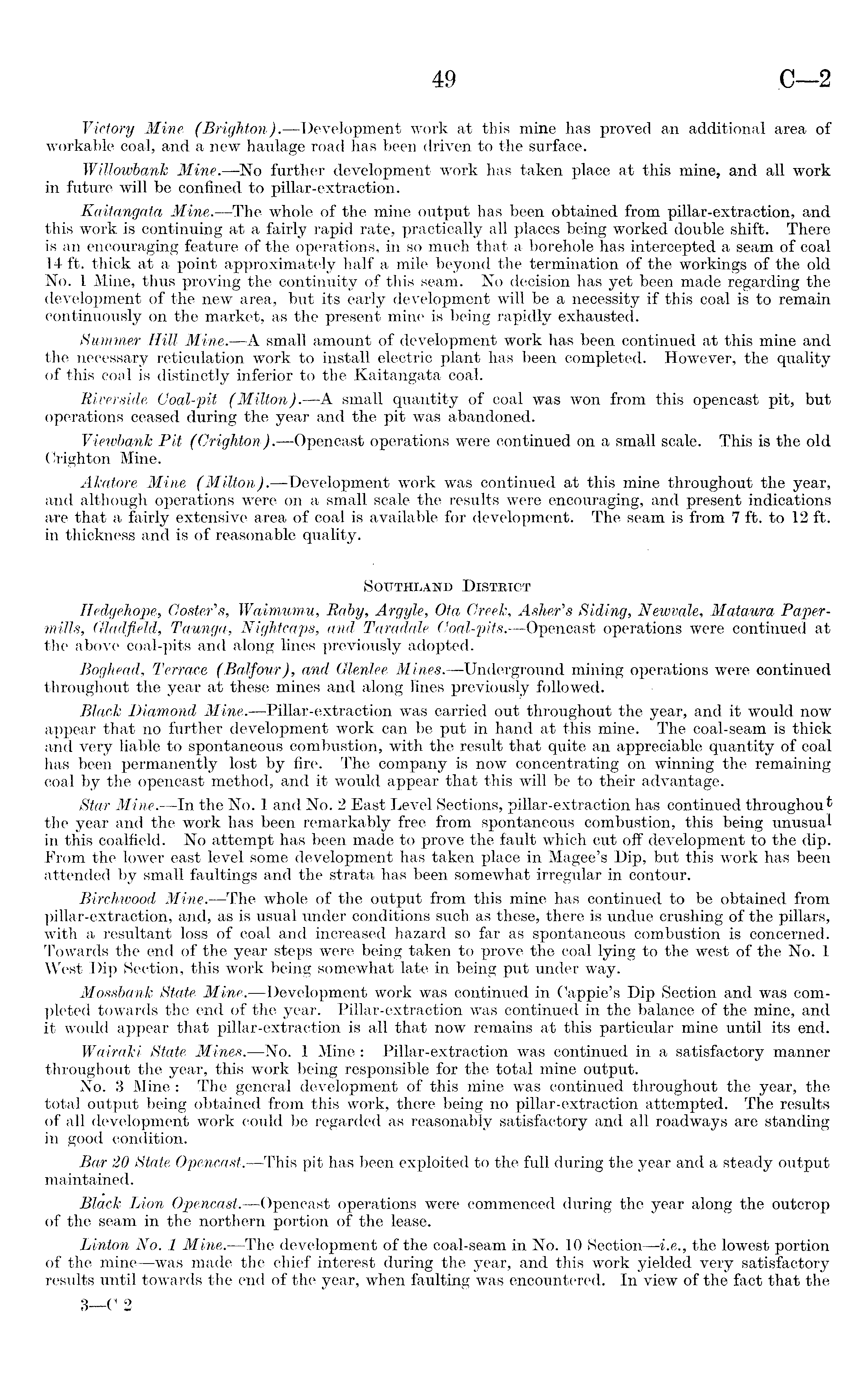 Victory Mine (Brighton).—Development work at this mine has proved an additional area of workable coal, and a new haulage road has been driven to the surface. Willowbank Mine. —No further development work has taken place at this mine, and all work in future will be confined to pillar-extraction. Kaitangata Mine.—The whole of the mine output has been obtained from pillar-extraction, and this work is continuing at a fairly rapid rate, practically all places being worked double shift. There is an encouraging feature of the operations, in so much that a borehole has intercepted a seam of coal 14 ft. thick at a point approximately half a mile beyond the termination of the workings of the old No. 1 Mine, thus proving the continuity of this seam. No decision has yet been made regarding the development of the new area, but its early development will be a necessity if this coal is to remain continuously on the market, as the present mine is being rapidly exhausted. Summer Hill Mine. —A small amount of development work has been continued at this mine and the necessary reticulation work to install electric plant has been completed. However, the quality of this coal is distinctly inferior to the Kaitangata coal. Riverside Goal-pit (Milton). —A small quantity of coal was won from this opencast pit, but operations ceased during the year and the pit was abandoned. Viewbank Pit (Crighton).—Opencast operations were continued on a small scale. This is the old Crighton Mine. Akatore Mine (Milton). —Development work was continued at this mine throughout the year, and although operations were on a small scale the results were encouraging, and present indications are that a fairly extensive area of coal is available for development. The seam is from 7 ft. to 12 ft. in thickness and is of reasonable quality. Southland District Hedgehope, Coster's, Waimumu, Raby, Argyle, Ota Greek, A sherds Siding, Newvale, Mataura Papermills, Gladfield, Taunga, Nightcaps, and Taradale Goal-pits.—Opencast operations were continued at the above coal-pits and along lines previously adopted. Boghead, Terrace (Balfour), and Glenlee Mines. —Underground mining operations were continued throughout the year at these mines and along lines previously followed. Black Diamond Mine. —Pillar-extraction was carried out throughout the year, and it would now appear that no further development work can be put in hand at this mine. The coal-seam is thick and very liable to spontaneous combustion, with the result that quite an appreciable quantity of coal has been permanently lost by fire. The company is now concentrating on winning the remaining coal by the opencast method, and it would appear that this will be to their advantage. Star Mine.—ln the No. 1 and No. 2 East Level Sections, pillar-extraction has continued throughout the year and the work has been remarkably free from spontaneous combustion, this being unusual in this coalfield. No attempt has been made to prove the fault which cut o£F development to the dip. From the lower east level some development has taken place in Magee's Dip, but this work has been attended by small faultings and the strata has been somewhat irregular in contour. Birchwood Mine. —The whole of the output from this mine has continued to be obtained from pillar-extraction, and, as is usual under conditions such as these, there is undue crushing of the pillars, with a resultant loss of coal and increased hazard so far as spontaneous combustion is concerned. Towards the end of the year steps were being taken to prove the coal lying to the west of the No. 1 West Dip Section, this work being somewhat late in being put under way. Mossbank State Mine.—Development work was continued in Cappie's Dip Section and was completed towards the end of the year. Pillar-extraction was continued in the balance of the mine, and it would appear that pillar-extraction is all that now remains at this particular mine until its end. Wairaki State Mines. —No. 1 Mine : Pillar-extraction was continued in a satisfactory manner throughout the year, this work being responsible for the total mine output. No. 3 Mine : The general development of this mine was continued throughout the year, the total output being obtained from this work, there being no pillar-extraction attempted. The results of all development work could be regarded as reasonably satisfactory and all roadways are standing in good condition. Bar 20 State Opencast.—This pit has been exploited to the full during the year and a steady output maintained. Black Lion Opencast.—Opencast operations were commenced during the year along the outcrop of the seam in the northern portion of the lease. Linton No. 1 Mine. —The development of the coal-seam in No. 10 Section—i.e., the lowest portion of the mine—was made the chief interest during the year, and this work yielded very satisfactory results until towards the end of the year, when faulting was encountered. In view of the fact that the