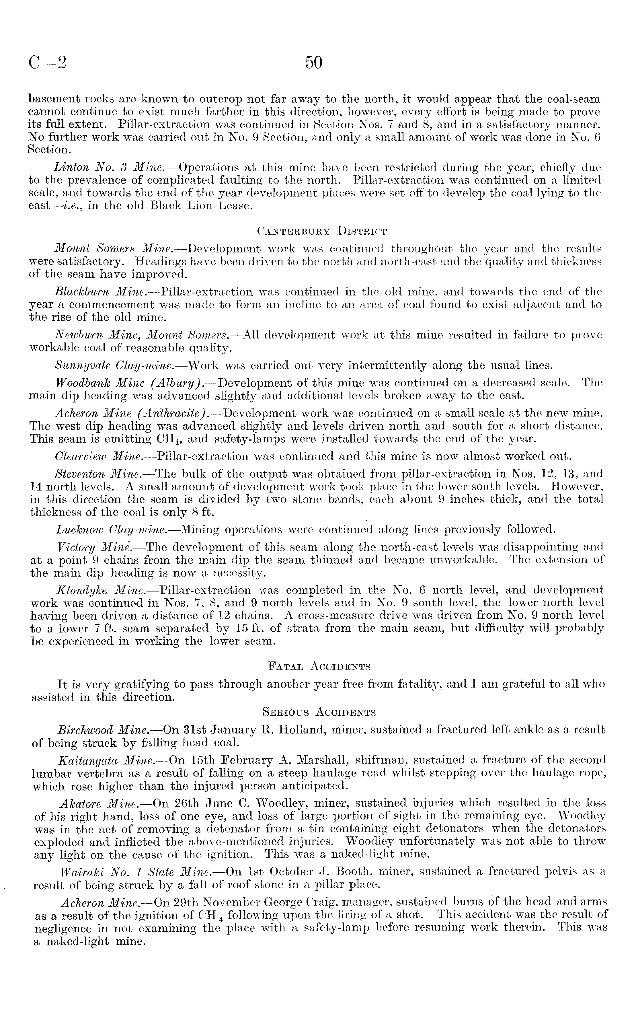 basement rocks are known to outcrop not far away to the north, it would appear that the coal-seam cannot continue to exist much farther in this direction, however, every effort is being made to prove its full extent. Pillar-extraction was continued in Section Nos. 7 and 8, and in a satisfactory manner. No further work was carried out in No. 9 Section, and only a small amount of work was done in No. 6 Section. Linton No. 3 Mine.—Operations at this mine have been restricted during the year, chiefly due to the prevalence of complicated faulting to the north. Pillar-extraction was continued on a limited scale, and towards the end of the year development places were set off to develop the coal lying to the east —i.e., in the old Black Lion Lease. Canterbury District Mount Somers Mine.—Development work was continued throughout the year and the results were satisfactory. Headings have been driven to the north and north-east and the quality and thickness of the seam have improved. Blackburn Mine. —Pillar-extraction was continued in the old mine, and towards the end of the year a commencement was made to form an incline to an area of coal found to exist adjacent and to the rise of the old mine. Newburn Mine, Mount Somers.—All development work at this mine resulted in failure to prove workable coal of reasonable quality. Sunnyvale Clay-mine.—Work was carried out very intermittently along the usual lines. Woodbank Mine (Albury).—Development of this mine was continued on a decreased scale. The main dip heading was advanced slightly and additional levels broken away to the east. Acheron Mine (Anthracite). —Development work was continued on a small scale at the new mine. The west dip heading was advanced slightly and levels driven north and south for a short distance. This seam is emitting CH4, and safety-lamps were installed towards the end of the year. Clearview Mine.—Pillar-extraction was continued and this mine is now almost worked out. Steventon Mine. —The bulk of the output was obtained from pillar-extraction in Nos. 12, 13, and 14 north levels. A small amount of development work took place in the lower south levels. However, in this direction the seam is divided by two stone bands, each about 9 inches thick, and the total thickness of the coal is only 8 ft. Lucknow Clay-mine.—Mining operations were continued along lines previously followed. Victory Mine.—The development of this seam along the north-east levels was disappointing and at a point 9 chains from the main dip the seam thinned and became unworkable. The extension of the main dip heading is now a necessity. KlondyTce Mine.—Pillar-extraction was completed in the No. 6 north level, and development work was continued in Nos. 7, 8, and 9 north levels and in No. 9 south level, the lower north level having been driven a distance of 12 chains. A cross-measure drive was driven from No. 9 north level to a lower 7 ft. seam separated by 15 ft. of strata from the main seam, but difficulty will probably be experienced in working the lower seam. Fatal Accidents It is very gratifying to pass through another year free from fatality, and I am grateful to all who assisted in this direction. Serious Accidents Birchwood Mine. —On 31st January R. Holland, miner, sustained a fractured left ankle as a result of being struck by falling head coal. Kaitangata Mine. —On 15th February A. Marshall, shiftman, sustained a fracture of the second lumbar vertebra as a result of falling on a steep haulage road whilst stepping over the haulage rope, which rose higher than the injured person anticipated. ATcatore Mine.—On 26th June C. Woodley, miner, sustained injuries which resulted in the loss of his right hand, loss of one eye, and loss of large portion of sight in the remaining eye. Woodley was in the act of removing a detonator from a tin containing eight detonators when the detonators exploded and inflicted the above-mentioned injuries. Woodley unfortunately was not able to throw any light on the cause of the ignition. This was a naked-light mine. Wairaki No. 1 State Mine. —On Ist October J. Booth, miner, sustained a fractured pelvis as a result of being struck by a fall of roof stone in a pillar place. Acheron Mine.—On 29th November George Craig, manager, sustained burns of the head and arms as a result of the ignition of CH 4 following upon the firing of a shot. This accident was the result of negligence in not examining the place with a safety-lamp before resuming work therein. This was a naked-light mine.