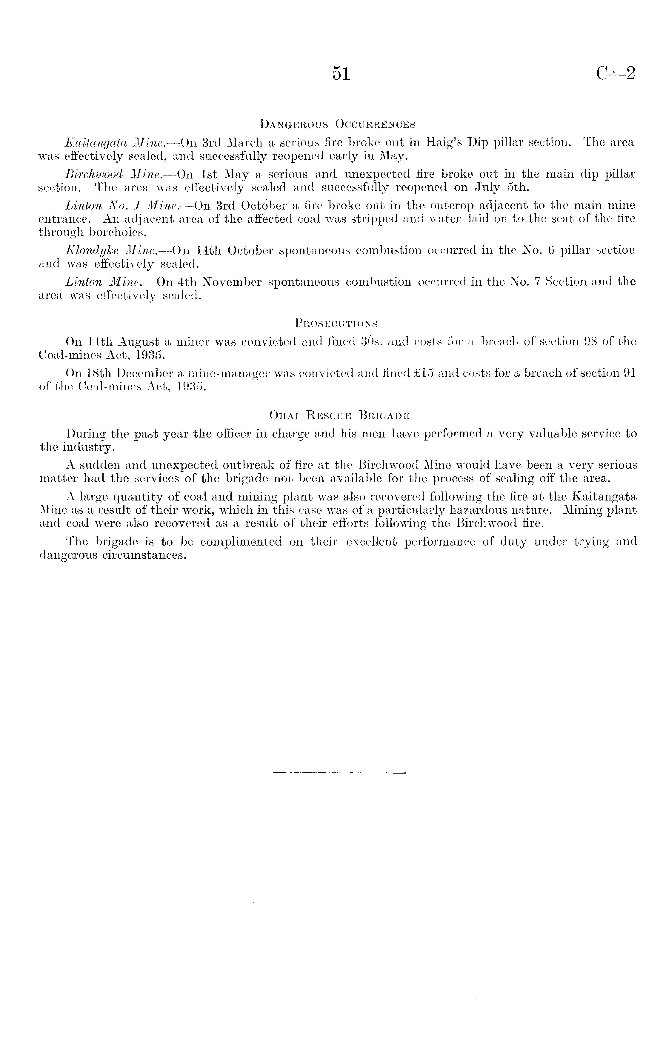 Dangerous Occurrences Kaitangata Mine.—On 3rd March a serious fire broke out in Haig's Dip pillar section. The area was effectively sealed, and successfully reopened early in May. Birchwood Mine.—On Ist May a serious and unexpected fire broke out in the main dip pillar section. The area was effectively sealed and successfully reopened on July sth. Linton No. 1 Mine.—On 3rd October a fire broke out in the outcrop adjacent to the main mine entrance. An adjacent area of the affected coal was stripped and water laid on to the seat of the fire through boreholes. Klondyke Mine. —On 14th October spontaneous combustion occurred in the No. 6 pillar section and was effectively sealed. Linton Mine.—On 4th November spontaneous combustion occurred in the No. 7 Section and the area was effectively sealed. Prosecutions On 14th August a miner was convicted and fined 30s. and costs for a breach of section 98 of the Coal-mines Act, 1935. On 18th December a mine-manager was convicted and fined £l5 and costs for a breach of section 91 of the Coal-mines Act, 1935. Ohai Rescue Brigade During the past year the officer in charge and his men have performed a very valuable service to the industry. A sudden and unexpected outbreak of fire at the Birchwood Mine would have been a very serious matter had the services of the brigade not been available for the process of sealing off the area. A large quantity of coal and mining plant was also recovered following the fire at the Kaitangata Mine as a result of their work, which in this case was of a particularly hazardous nature. Mining plant and coal were also recovered as a result of their efforts following the Birchwood fire. The brigade is to be complimented on their excellent performance of duty under trying and dangerous circumstances.