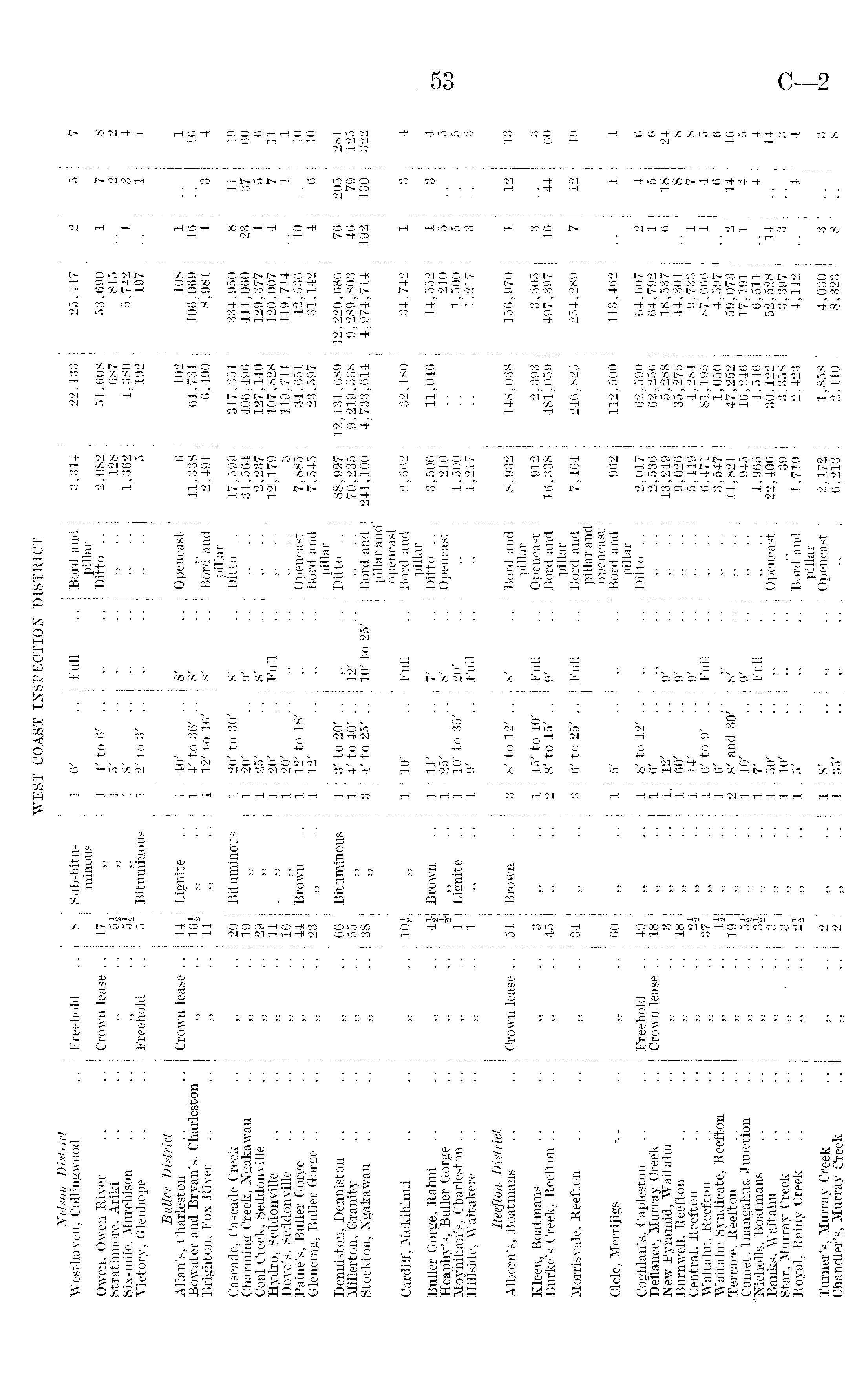 WEST COAST INSPECTION DISTRICT Nelson District I III Westhaven, Collingwood .. Freehold .. 8 Sub-bitu- 16' .. Full .. Bord and 3,314 22,133 25,447 2 5 7 urinous pillar Owen, Owen River .. .. Crown lease ..17 ,, 1 4'to 6' .. ,, .. Ditto .. 2,082 51,608 53,690 1 7 8 Strathmore, Ariki .. .. ,, .. 5£ „ 15' ,, .. „ 128 I 687 815 .. 2 2 Six-mile, Murehison .. .. ,, 5| ,, 18' ,, .. ,, 1,362 1 4,380 5,742 1 3 4 Victory, Glenhope .. .. Freehold .. 5 Bituminous 1 2'to 3' .. ,, .. ,, .. 5 192 197 .. 1 1 Butter District Allan's, Charleston .. .. Crown lease .. 14 Lignite .. 1 40' 8' .. Opencast 6 I 102 108 1 1 Bowater and Bryan's, Charleston „ .. 16| „ .. 1 4'to 36' .. 8' .. „ 41,338 64,731 106;069 16 16 Brighton, Fox River .. .. „ ..14 „ ..1 12' to 16' 8' .. Bord and 2,491 6,490 8,981 1 3 4 pillar Cascade, Cascade Creek .. ,, ..20 Bituminous 1 20' to 30' 8' .. Ditto .. 17,599 317,351 834,950 8 11 19 Charming Creek, Ngakawau .. ,, ..19 ,, 1 20' ..9' .. „■ 34,564 406,496 441,060 23 37 60 Coal Creek, Seddonville .. „ ..29 „ 1 25' ..8' .. „ 2,237 127,140 129,377 1 5 6 Hydro, Seddonville .. .. „ .. 11 1 20' .. Full .. „ .. ! 12,179 107,828 120,007 4 7 11 Dove's, Seddonville .. .. ,, ..16 ,, 1 20' „ .. . 3 119,711 119,714 .. 1 1 Paine's, Buller Gorge .. .. ,, ..44 Brown .. 1 12' to 18' ,, .. Opencast | 7,885 34,651 42,536 10 .. 10 Glencrag, Buller Gorge .. .. „ .. 23 1 12' ■ ■ „ ! Bord and 7,545 23,597 31,142 4 6 10 pillar Denniston, Denniston .. .. ,, ..66 Bituminous 1 3'to 20' .. ,, .. Ditto .. 88,997 12,131,689 12,220,686 76 205 281 Millerton, Granity .. .. „ ..55 „ 1 4' to 40' .. 12' .. „ 70,235 9,219,568 9,289,803 46 79 125 Stockton, Ngakawau .. .. „ ..38 „ 3 4'to 25' . . 10' to 25' Bord and 241,100 4,733,614 4,974,714 192 130 322 pillar and opencast Cardiff, Mokihinui .. ... ,, .. 10J „ 1 10' .. Full .. Bord and 2,562 32,180 34,742 1 3 4 pillar Buller Gorge, Rahui .. .. „ .. 4| Brown .. 1 11' ..7' .. Ditto .. 3,506 11,046 14,552 1 3 4 Heaphy's, Buller Gorge .. „ .. | 1 25' .. 8' .. Opencast 210 .. 210 5 5 Moynihan's, Charleston .. .. ,, ..1 Lignite .. 1 10' to 35' 20' .. ,, 1,500 .. 1,500 5 5 Hillside, Waitakere .. .. ,, ..1 ,, ..19' .. Full .. ,, 1,217 .. 1,217 3 3 Reefton District Albom's, Boatmans .. .. Crown lease .. 51 Brown .. 3 8'to 12' .. 8' .. Bord and 8,932 148,038 156,970 1 12 13 pillar Kleen, Boatmans .. .. ,, ..3 ,, ..1 15' to 40' Full .. Opencast 912 2,393 3,305 3 3 Burke's Creek, Reefton .. .. „ ..45 „ .. 2 8'to 15' .. 9' .. Bord and 16,338 481,059 497,397 16 44 60 pillar Morrisvale, Reefton .. .. „ ..34 „ .. 3 *6' to 25'.. Full .. Bord and 7,464 246,825 254,289 7 12 19 pillar and opencast Clele, Merrijigs . .. „ ..60 „ ..15' . . .. Bord and 962 112,500 113,462 .. 1 1 pillar Coghlan's, Capleston .. .. Freehold ..49 „ .. 1 8'to 12' .. ,, .. Ditto .. 2,017 62,590 64,607 2 4 6 Defiance, Murray Creek .. Crown lease ..18 ,, .. 16' .. ,, .. ,, 2,536 62,256 64,792 1 5 6 New Pyramid, Waitahu .. ,, .. 3 ,, .. 1. 12' ..9' .. ,, 13,249 5,288 18,537 6 18 24 Burnwell, Reefton .. .. ,, ..18 ,, ..1 60' ..9' .. ,, .. 9,026 35,275 44,301 .. 8 8 Central, Reefton .. .. „ .. 2J „ 1 14' ..9' .. „ .. 5,449 4,284 9,733 1 7 8 Waitahu, Reefton .. .. „ ..37 ,, .. 1 6'to 9' . . Full .. ,, .. 1 6,471 81,195 87,666 1 4 5 Waitahu Syndicate, Reefton .. ,, .. 1J ,, .. 16' .. ,, .. ,, .. 3,547 1,050 4,597 .. 6 6 Terrace, Reefton .. .. „ ..19 ,, ..2 8'and 30' 8' .. ,, .. 11,821 47,252 59,073 2 14 16 Comet, Inangahua Junction .. ,, .. 5| ,, .. 1 10' ..9' .. ,, 945 16,246 17,191 1 4 5 Nicholls, Boatmans .. .. „ 3J „ ..17' .. Full .. ,, .. 1,965 4,546 6,511 .. 4 4 Banks, Waitahu .. .. „ 3 1 50' .. .. Opencast 22,406 30,122 52,528 14 .. 14 Star, Murray Creek .. .. . 3 ,, 1 10' ,, .. "1 39 3,358 3,397 3 3 Royal, Rainy Creek .. .. ,, 2£ „ ..15' „ .. Bord and 1,719 2,423 4,142 .. 4 4 pillar Turner's, Murray Creek .. » ..2 ,, ..18' .. .. Opencast 2,172 1,858 4,030 3 3 Chandler's, Murray Creek .. ,, ..2 ,, 1 35' ,, .. ,, ■ | 6,213 2,110 ' 8,323 8' 8
