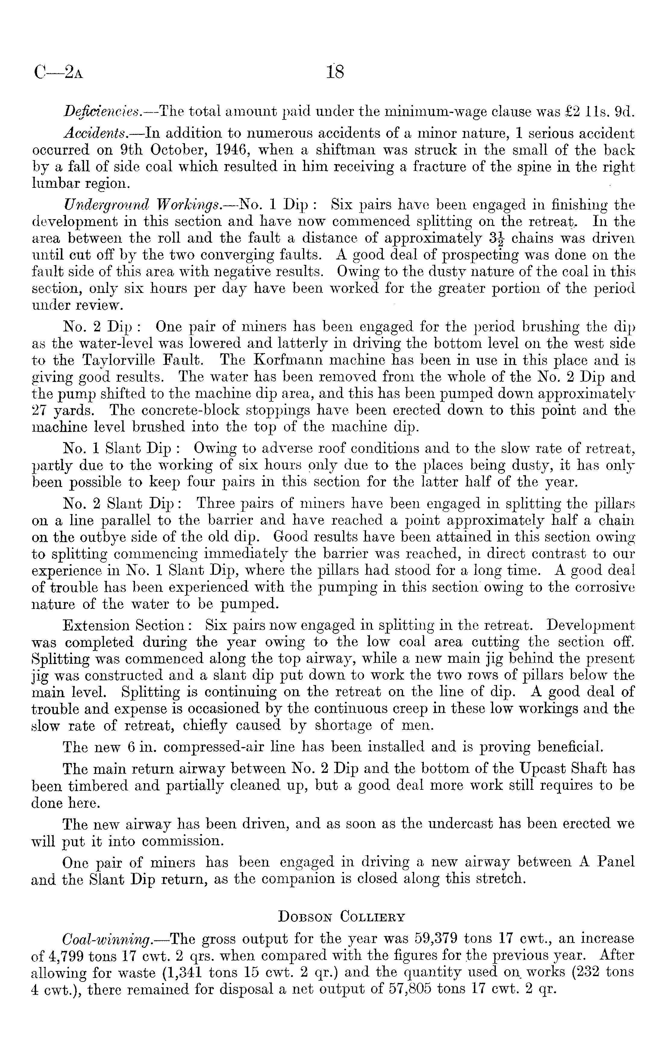 Deficiencies. —The total amount paid under the minimum-wage clause was £2 lis. 9d. Accidents.—ln addition to numerous accidents of a minor nature, 1 serious accident occurred on 9th October, 1946, when a shiftman was struck in the small of the back by a fall of side coal which resulted in him receiving a fracture of the spine in the right lumbar region. Underground Workings.—No. 1 Dip : Six pairs have been engaged in finishing the development in this section and have now commenced splitting on the retreat, In the area between the roll and the fault a distance of approximately 3|- chains was driven until cut off by the two converging faults. A good deal of prospecting was done on the fault side of this area with negative results. Owing to the dusty nature of the coal in this section, only six hours per day have been worked for the greater portion of the period under review. No. 2 Dip : One pair of miners has been engaged for the period brushing the dip as the water-level was lowered and latterly in driving the bottom level on the west side to the Taylorville Faults The Korfmann machine has been in use in this place and is giving good results. The water has been removed from the whole of the No. 2 Dip and the pump shifted to the machine dip area, and this has been pumped down approximately 27 yards. The concrete-block stoppings have been erected down to this point and the machine level brushed into the top of the machine dip. No. 1 Slant Dip : Owing to adverse roof conditions and to the slow rate of retreat, partly due to the working of six hours only due to the places being dusty, it has only been possible to keep four pairs in this section for the latter half of the year. No. 2 Slant Dip: Three pairs of miners have been engaged in splitting the pillars on a line parallel to the barrier and have reached a point approximately half a chain on the outbye side of the old dip. Good results have been attained in this section owing to splitting commencing immediately the barrier was reached, in direct contrast to our experience in No. 1 Slant Dip, where the pillars had stood for a long time. A good deal of trouble has been experienced with the pumping in this section owing to the corrosive nature of the water to be pumped. Extension Section: Six pairs now engaged in splitting in the retreat. Development was completed during the year owing to the low coal area cutting the section off. Splitting was commenced along the top airway, while a new main jig behind the present jig was constructed and a slant dip put down to work the two rows of pillars below the main level. Splitting is continuing on the retreat on the line of dip. A good deal of trouble and expense is occasioned by the continuous creep in these low workings and the slow rate of retreat, chiefly caused by shortage of men. The new 6 in. compressed-air line has been installed and is proving beneficial. The main return airway between No. 2 Dip and the bottom of the Upcast Shaft has been timbered and partially cleaned up, but a good deal more work still requires to be done here. The new airway has been driven, and as soon as the undercast has been erected we will put it into commission. One pair of miners has been engaged in driving a new airway between A Panel and the Slant Dip return, as the companion is closed along this stretch. Dobson Colliery Goal-winning.—The gross output for the year was 59,379 tons 17 cwt., an increase of 4,799 tons 17 cwt. 2 qrs. when compared with the figures for the previous year. After allowing for waste {1,341 tons 15 cwt. 2 qr.) and the quantity used on works (232 tons 4 cwt.), there remained for disposal a net output of 57,805 tons 17 cwt. 2 qr.