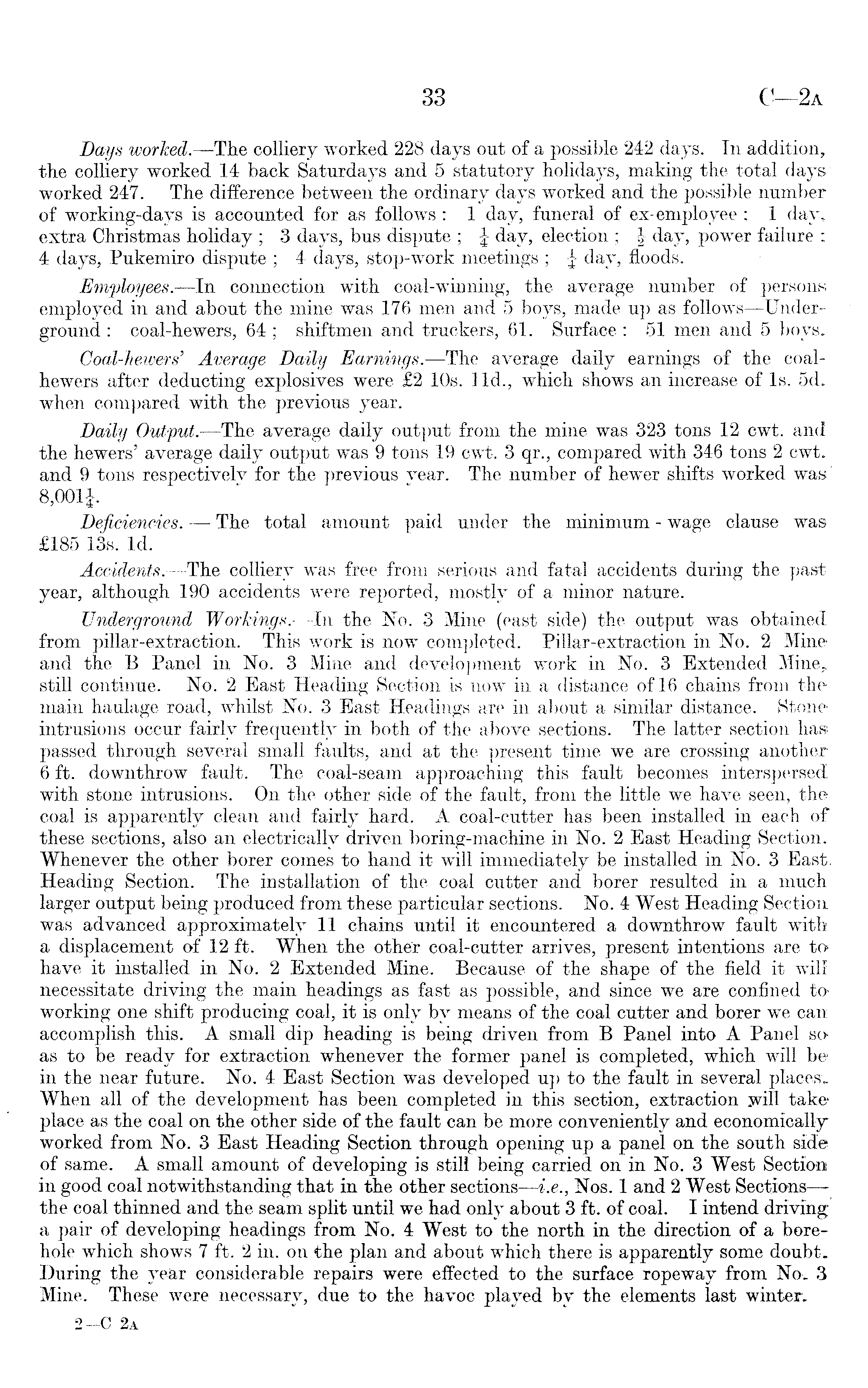 Days worked. —The colliery worked 228 days out of a possible 242 days. In addition, the colliery worked 14 back Saturdays and 5 statutory holidays, making the total days worked 247. The difference between the ordinary days worked and the possible number' of working-days is accounted for as follows : 1 day, funeral of ex-employee ; 1 day, extra Christmas holiday ; 3 days, bus dispute ; £ day, election ; day, power failure ; 4 days, Pukemiro dispute ; 4 days, stop-work meetings ; \ day, floods. Employees.—ln connection with coal-winning, the average number of persons employed in and about the mine was 176 men and 5 boys, made up as follows —Underground : coal-hewers, 64 ; shiftmen and truckers, 61. Surface : 51 men and 5 boys. Coal-hewers' Average Daily Earnings.—The average daily earnings of the coalhewers after deducting explosives were £2 10s. lid., which shows an increase of Is. sd. when compared with the previous year. Daily Output.—The average daily output from the mine was 323 tons 12 cwt. and the hewers' average daily output was 9 tons 19 cwt. 3 qr., compared with 346 tons 2 cwt. and 9 tons respectively for the previous year. The number of hewer shifts worked was 8,0011. Deficiencies. The total amount paid under the minimum - wage clause was £lB5 13s. Id. Accidents.—The colliery was free from serious and fatal accidents during the past year, although 190 accidents were reported, mostly of a minor nature. Underground Workings.—ln the No. 3 Mine (east side) the output was obtained from pillar-extraction. This work is now completed. Pillar-extraction in No. 2 Mine and the B Panel in No. 3 Mine and development work in No. 3 Extended Mine, still continue. No. 2 East Heading Section is now in a distance of 16 chains from the main haulage road, whilst No. 3 East Headings are in about a similar distance. Stone intrusions occur fairly frequently in both of the above sections. The latter section has passed through several small faults, and at the present time we are crossing another 6 ft. downthrow fault. The coal-seam approaching this fault becomes interspersed with stone intrusions. On the other side of the fault, from the little we have seen, the coal is apparently clean and fairly hard. A coal-cutter has been installed in each of these sections, also an electrically driven boring-machine in No. 2 East Heading Section. Whenever the other borer comes to hand it will immediately be installed in No. 3 East. Heading Section. The installation of the coal cutter and borer resulted in a much larger output being produced from these particular sections. No. 4 West Heading Section was advanced approximately 11 chains until it encountered a downthrow fault with a displacement of 12 ft. When the other coal-cutter arrives, present intentions are to have it installed in No. 2 Extended Mine. Because of the shape of the field it will necessitate driving the main headings as fast as possible, and since we are confined to working one shift producing coal, it is only by means of the coal cutter and borer we can accomplish this. A small dip heading is being driven from B Panel into A Panel so> as to be ready for extraction whenever the former panel is completed, which will be in the near future. No. 4 East Section was developed up to the fault in several places. When all of the development has been completed in this section, extraction will take place as the coal on the other side of the fault can be more conveniently and economically worked from No. 3 East Heading Section through opening up a panel on the south side of same. A small amount of developing is still being carried on in No. 3 West Section in good coal notwithstanding that in the other sections —i.e., Nos. 1 and 2 West Sections — the coal thinned and the seam split until we had only about 3 ft. of coal. I intend driving a pair of developing headings from No. 4 West to the north in the direction of a borehole which shows 7 ft. 2 in. on the plan and about which there is apparently some doubt. During the year considerable repairs were effected to the surface ropeway from No. 3 Mine. These were necessary, due to the havoc played by the elements last winter.