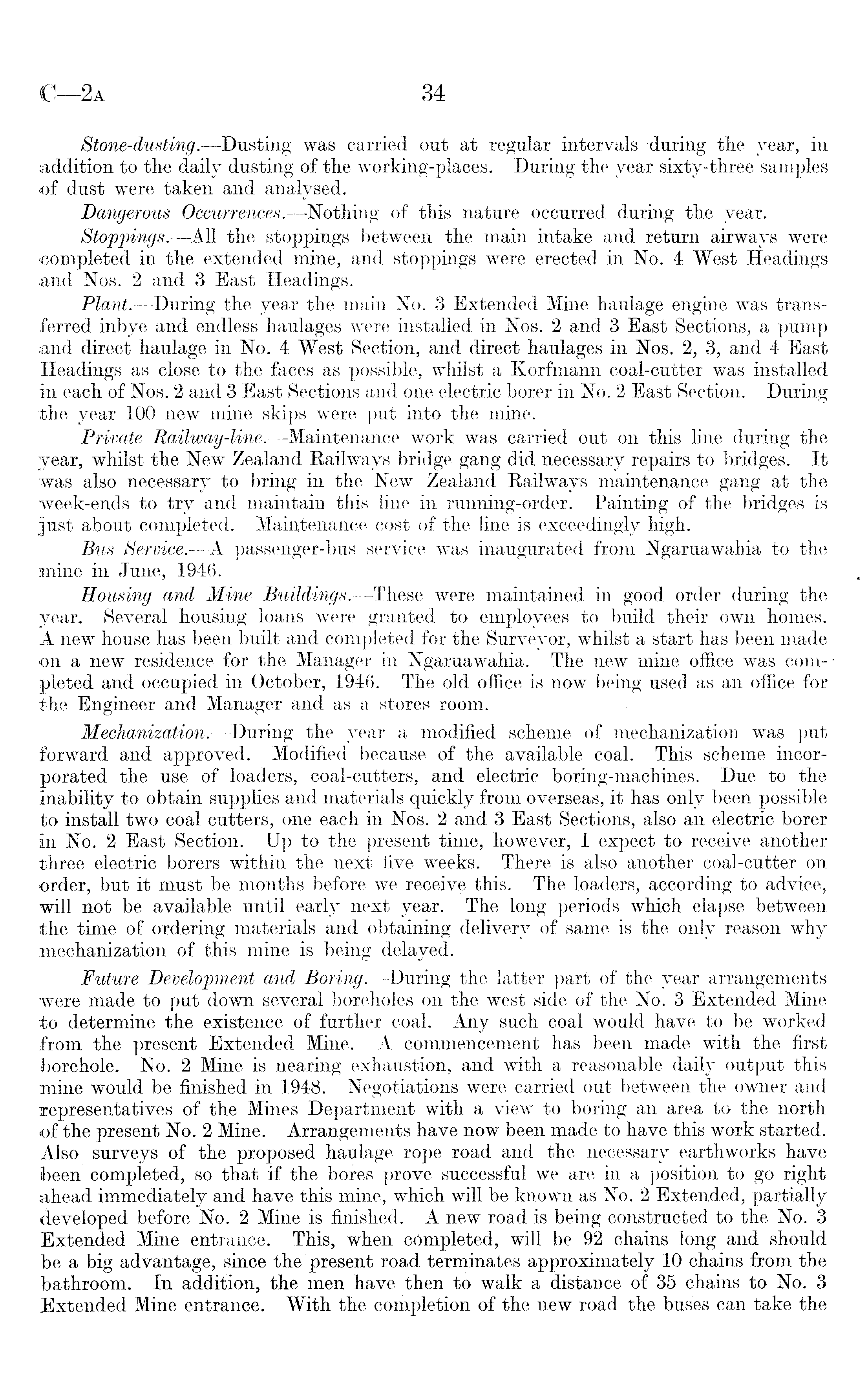 Stone-dusting.—Dusting was carried out at regular intervals during the year, in addition to the daily dusting of the working-places. During the year sixty-three samples of dust were taken and analysed. Dangerous Occurrences. —Nothing of this nature occurred during the year. Stoppings. —All the stoppings between the main intake and return airways were completed in the extended mine, and stoppings were erected in No. 4 West Headings and Nos. 2 and 3 East Headings. Plant.—During the year the main No. 3 Extended Mine haulage engine was transferred inbye and endless haulages were installed in Nos. 2 and 3 East Sections, a pump and direct haulage in No. 4 West Section, and direct- haulages in Nos. 2, 3, and 4 East Headings as close to the faces as possible, whilst a Korfmann coal-cutter was installed in each of Nos. 2 and 3 East Sections and one electric borer in No. 2 East Section. During the year 100 new mine skips were put into the mine. Private Railway-line.—Maintenance work was carried out on this line during the year, whilst the New Zealand Railways bridge gang did necessary repairs to bridges. It was also necessary to bring in the New Zealand Railways maintenance gang at the week-ends to try and maintain this line in running-order. Painting of the bridges is just about completed. Maintenance cost of the line is exceedingly high. Bus Service. —A passenger-bus service was inaugurated from Ngaruawahia to the mine in June, 1946. Housing and Mine Buildings.—These were maintained in good order during the year. Several housing loans were granted to employees to build their own homes. A new house has been built and completed for the Surveyor, whilst a start has been made on a new residence for the Manager in Ngaruawahia. The new mine office was completed and occupied in October, 1946. The old office is now being used as an office for the Engineer and Manager and as a stores room. Mechanization. —During the year a modified scheme of mechanization was put forward and approved. Modified because of the available coal. This scheme incorporated the use of loaders, coal-cutters, and electric boring-machines. Due to the inability to obtain supplies and materials quickly from overseas, it has only been possible to install two coal cutters, one each in Nos. 2 and 3 East Sections, also an electric borer in No. 2 East Section. Up to the present time, however, I expect to receive another three electric borers within the next five weeks. There is also another coal-cutter on order, but it must be months before we receive this. The loaders, according to advice, will not be available until early next year. The long periods which elapse between the time of ordering materials and obtaining delivery of same is the only reason why mechanization of this mine is being delayed. Future Development and Boring.—During the latter part of the year arrangements were made to put down several boreholes on the west side of the No. 3 Extended Mine to determine the existence of further coal. Any such coal would have to be worked from the present Extended Mine. A commencement has been made with the first borehole. No. 2 Mine is nearing exhaustion, and with a reasonable daily output this mine would be finished in 1948. Negotiations were carried out between the owner and representatives of the Mines Department with a view to boring an area to the north of the present No. 2 Mine. Arrangements have now been made to have this work started. Also surveys of the proposed haulage rope road and the necessary earthworks have been completed, so that if the bores prove successful we are in a position to go right ahead immediately and have this mine, which will be known as No. 2 Extended, partially developed before No. 2 Mine is finished. A new road is being constructed to the No. 3 Extended Mine entrance. This, when completed, will be 92 chains long and should be a. big advantage, since the present road, terminates approximately 10 chains from the bathroom. In addition, the men have then to walk a distance of 35 chains to No. 3 Extended Mine entrance. With the completion of the new road the buses can take the