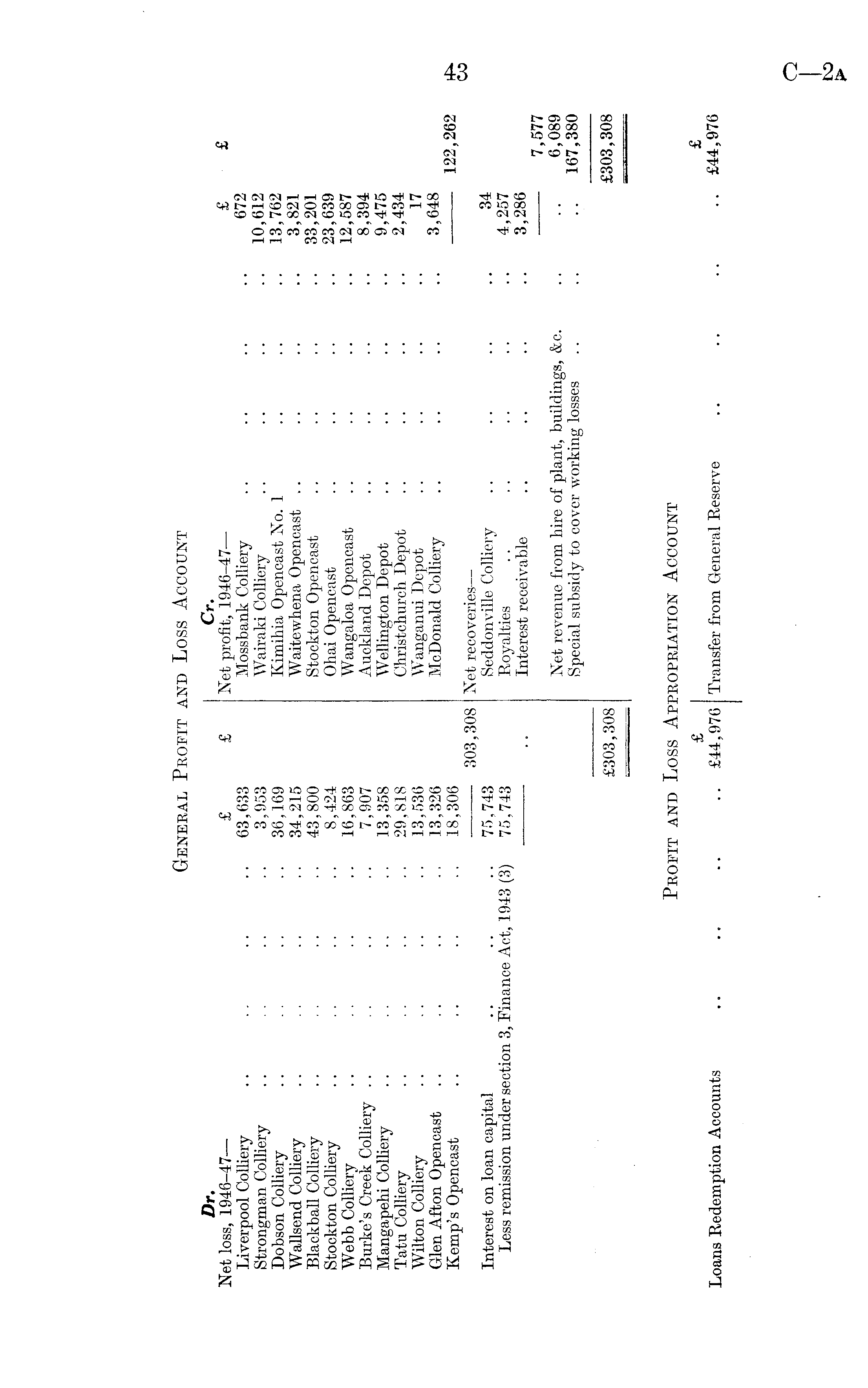 General Profit and Loss Account Dr. Cr. Net loss, 1946-47— £ £ Net profit, 1946-47— £ £ Liverpool Colliery .. .. .. .. 63,633 Mossbank Colliery .. .. .. .. 672 Strongman Colliery .. .. .. .. 3,953 Wairaki Colliery .. .. .. .. 10,612 Dobson Colliery .. .. .. 36,169 Kimihia Opencast No. 1 .. .. .. 13,762 Wallsend Colliery .. .. .. .. 34,215 Waitewhena Opencast .. .. .. .. 3,821 Blackball Colliery .. .. .. .. 43,800 Stockton Opencast .. .. .. .. 33,201 Stockton Colliery .. . . .. .. 8,424 Ohai Opencast .. .. .. .. 23,639 Webb Colliery .. .. .. .. 16,863 Wangaloa Opencast .. .. .. .. 12,587 Burke's Creek Colliery .. .. .. .. 7,907 Auckland Depot .. .. .. .. 8,394 Mangapehi Colliery .. .. .. .. 13,358 Wellington Depot .. .. .. .. 9,475 Tatu Colliery .. .. .. .. 29,818 Christchurch Depot .. .. .. .. 2,434 Wilton Colliery .. .. .. .. 13,536 Wanganui Depot .. .. .. .. 17 Glen Afton Opencast .. .. .. .. 13,326 McDonald Colliery .. .. .. .. 3,648 Kemp's Opencast .. .. .. .. 18,306 122,262 30 3,308 Net recoveries— Interest on loan capital .. .. .. 75,743 Seddonville Colliery .. .. .. .. 34 Less remission under section 3, Finance Act, 1943 (3) 75,743 Royalties .. .. .. .. .. 4,257 .. Interest receivable ~ .. .. .. 3,286 7,577 Net revenue from hire of plant, buildings, &c. .. .. 6,089 Special subsidy to cover working losses .. .. .. 167, 380 £303,308 £303,308 Profit and Loss Appropriation Account £ I £ Loans Redemption Accounts .. .. .. .. £44,976 Transfer from General Reserve .. .. .. £44,976