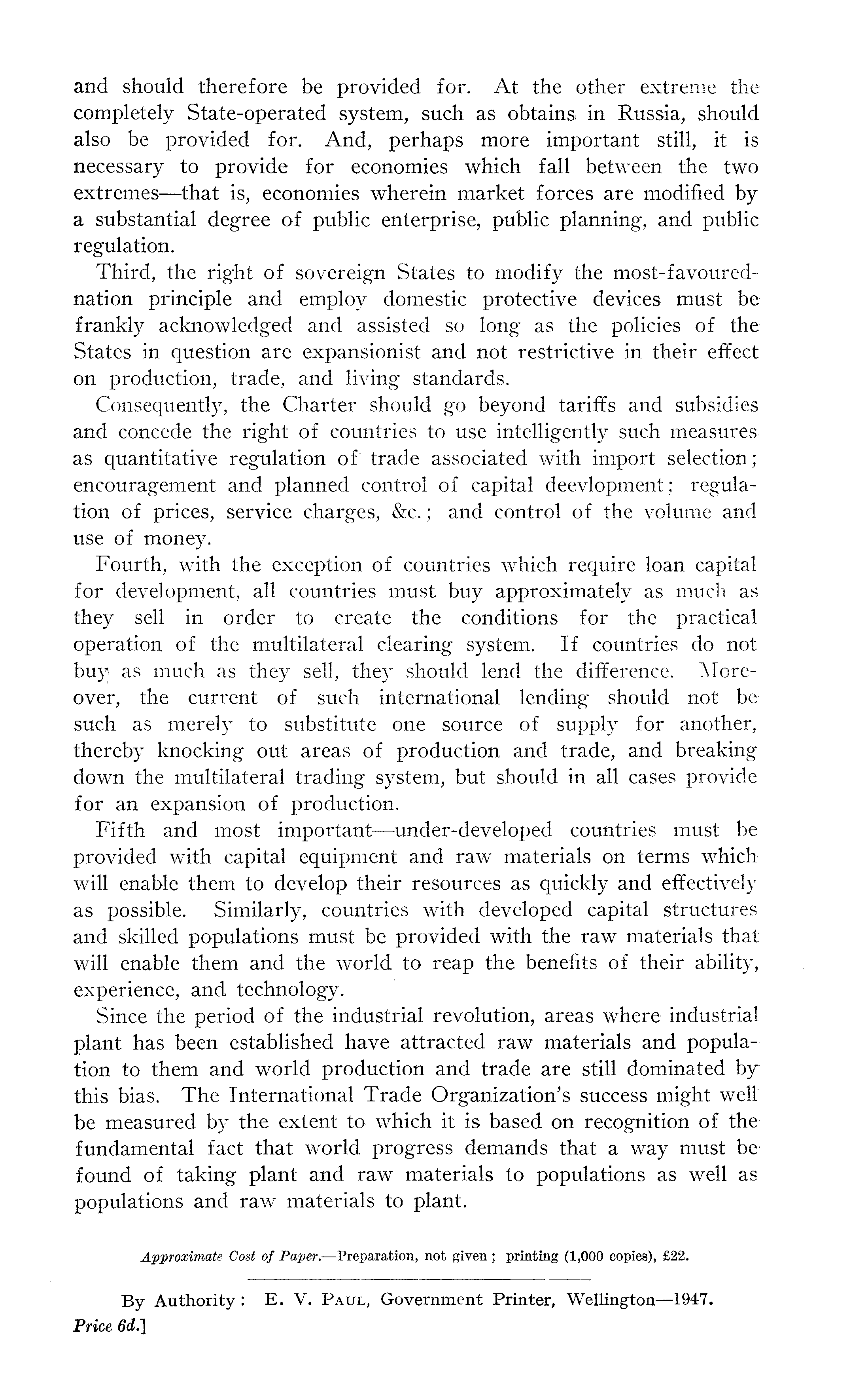 and should therefore be provided for. At the other extreme the completely State-operated system, such as obtains, in Russia, should also be provided for. And, perhaps more important still, it is necessary to provide for economies which fall between the two extremes —that is, economies wherein market forces are modified by a substantial degree of public enterprise, public planning, and public regulation. Third, the right of sovereign States to modify the most-favoured-nation principle and employ domestic protective devices must be frankly acknowledged and assisted so long as the policies of the States in question are expansionist and not restrictive in their effect on production, trade, and living standards. Consequently, the Charter should go beyond tariffs "and subsidies and concede the right of countries to use intelligently such measures as quantitative regulation of trade associated with import selection; encouragement and planned control of capital deevlopment; regulation of prices, service charges, &c.; and control of the volume and use of money. Fourth, with the exception of countries which require loan capital for development, all countries must buy approximately as much as they sell in order to create the conditions for the practical operation of the multilateral clearing system. If countries do not buyj as much as they sell, they should lend the difference. Moreover, the current of such international lending should not be such as merely to substitute one source of supply for another, thereby knocking out areas of production and trade, and breaking down the multilateral trading system, but should in all cases provide for an expansion of production. Fifth and most important —under-developed countries must be provided with capital equipment and raw materials on terms which will enable them to develop their resources as quickly and effectively as possible. Similarly, countries with developed capital structures and skilled populations must be provided with the raw materials that will enable them and the world to reap the benefits of their ability, experience, and technology. Since the period of the industrial revolution, areas where industrial plant has been established have attracted raw materials and population to them and world production and trade are still dominated by this bias. The International Trade Organization's success might well' be measured by the extent to which it is based on recognition of the fundamental fact that world progress demands that a way must be found of taking plant and raw materials to populations as well as populations and raw materials to plant. Approximate Cost of Paper. —Preparation, not given; printing (1,000 copies), £22. By Authority: E. V. Paul, Government Printer, Wellington—l 947. Price 6d.]
