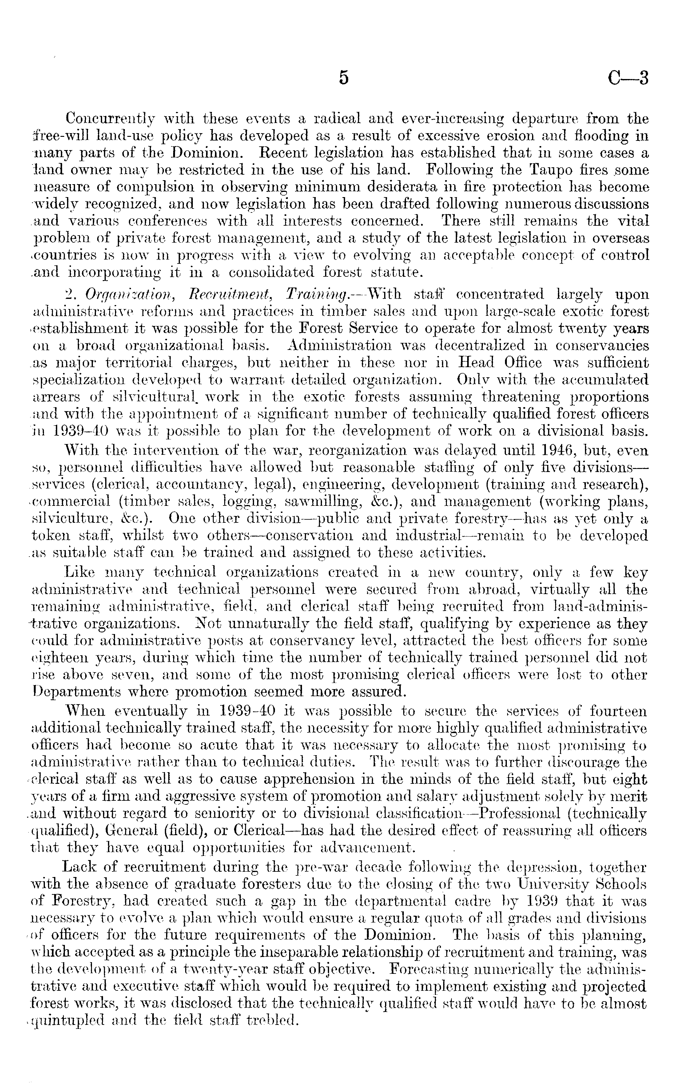 Concurrently with these events a radical and ever-increasing departure from, the free-will land-use policy has developed as a result of excessive erosion and flooding in many parts of the Dominion. Recent legislation has established that in some cases a land owner may be restricted in the use of his land. Following the Taupo fires .some measure of compulsion in observing minimum desiderata in fire protection has become widely recognized, and now legislation has been drafted following numerous discussions .and various conferences with all interests concerned. There still remains the vital problem of private forest management, and a study of the latest legislation in overseas •countries is now in progress with a view to evolving an acceptable concept of control .and incorporating it in a consolidated forest statute. 2. Organization, Recruitment, Training.-—With staff concentrated largely upon administrative reforms and practices in timber sales and upon large-scale exotic forest it was possible for the Forest Service to operate for almost twenty years on a broad organizational basis. Administration was decentralized in conservancies .as major territorial charges, but neither in these nor in Head Office was sufficient specialization developed to warrant detailed organization. Only with the accumulated arrears of silvicultural. work in the exotic forests assuming threatening proportions and with the appointment of a significant number of technically qualified forest officers in 1939-40 was it possible to plan for the development of work on a divisional basis. With the intervention of the war, reorganization was delayed until 1946, but, even so, personnel difficulties have allowed but reasonable staffing of only five divisions—.services (clerical, accountancy, legal), engineering, development (training and research), commercial (timber sales, logging, sawmilling, &c.), and management (working plans, silviculture, &c.). One other division—public and private forestry—has as yet only a token staff, whilst two others—conservation and industrial —remain to be developed as suitable staff can be trained and assigned to these activities. Like many technical organizations created in a new country, only a few key administrative and technical personnel were secured from abroad, virtually all the remaining administrative, field, and clerical staff being recruited from land-adminis--trative organizations. Not unnaturally the field staff, qualifying by experience as they could for administrative posts at conservancy level, attracted the best officers for some eighteen years, during which time the number of technically trained personnel did not rise above seven, and some of the most promising clerical officers were lost to other Departments where promotion seemed more assured. When eventually in 1939-40 it was possible to secure the services of fourteen additional technically trained staff, the necessity for more highly qualified administrative officers had become so acute that it was necessary to allocate the most promising to administrative rather than to technical duties. The result was to further discourage the -clerical staff as well as to cause apprehension in the minds of the field staff, but eight years of a firm and aggressive system of promotion and salary adjustment solely by merit .and without regard to seniority or to divisional classification—Professional (technically • qualified), General (field), or Clerical —has had the desired effect of reassuring all officers that they have equal opportunities for advancement. Lack of recruitment during the pre-war decade following the depression, together with the absence of graduate foresters due to the closing of the two University Schools of Forestry, had created such a gap in the departmental cadre by 1939 that it was necessary to evolve a plan which would ensure a regular quota of all grades and divisions -of officers for the future requirements of the Dominion. The basis of this planning, which accepted as a principle the inseparable relationship of recruitment and training, was the development of a twenty-year staff objective. Forecasting numerically the administrative and executive staff which would be required to implement existing and projected forest works, it was disclosed that the technically qualified staff would have to be almost and the field staff trebled.