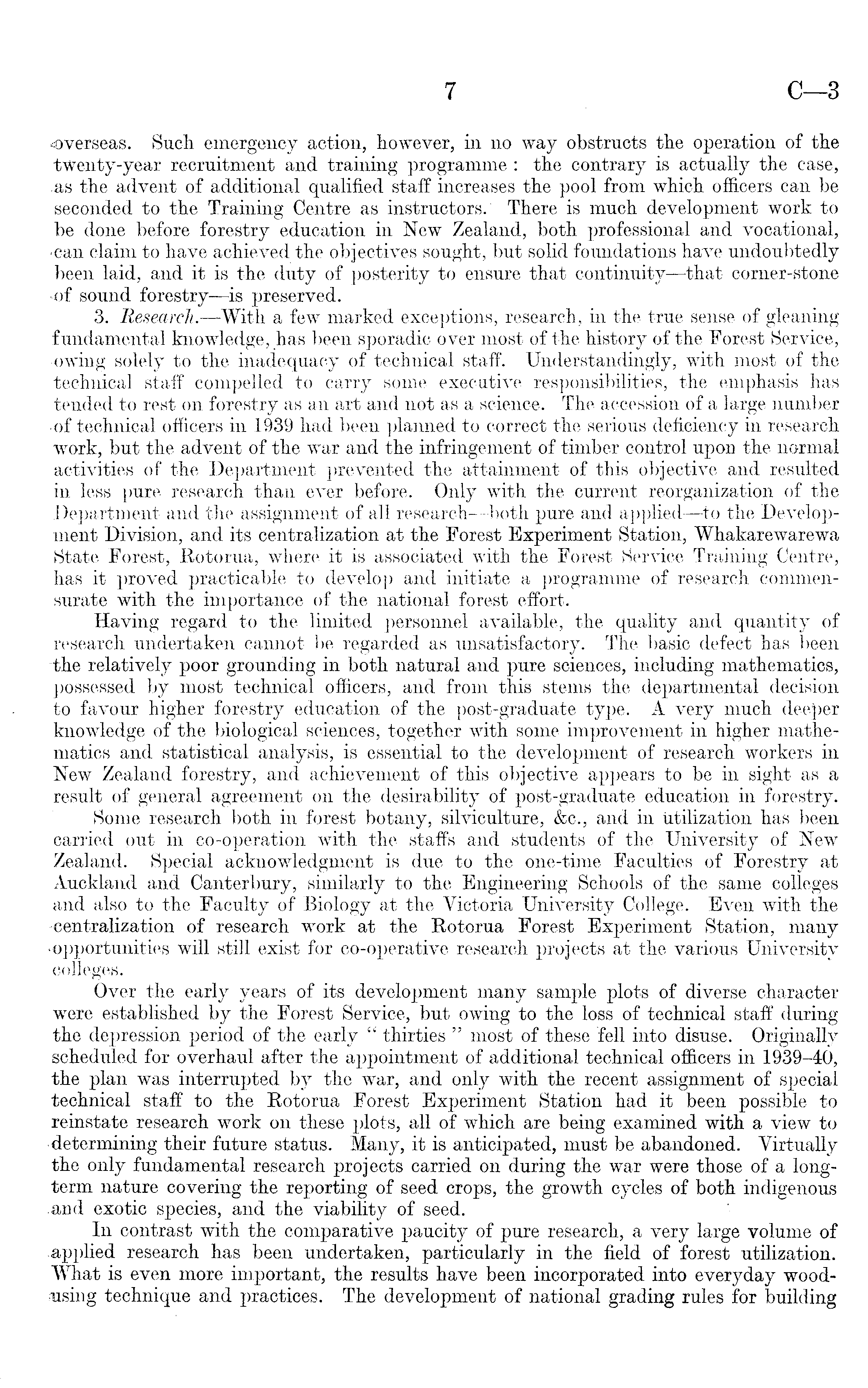overseas. Such emergency action, however, in no way obstructs the operation of the twenty-year recruitment and training programme : the contrary is actually the case, as the advent of additional qualified staff increases the pool from which officers can be seconded to the Training Centre as instructors. There is much development work to be done before forestry education in New Zealand, both professional and vocational, ■can claim to have achieved the objectives sought, but solid foundations have undoubtedly been laid, and it is the duty of posterity to ensure that continuity—that corner-stone •of sound forestry—is preserved. 3. Research. —With a few marked exceptions, research, in the true sense of gleaning fundamental knowledge, has been sporadic over most of the history of the Forest Service, owing solely to the inadequacy of technical staff. Understandingly, with most of the technical staff compelled to carry some executive responsibilities, the emphasis has tended to rest on forestry as an art and not as a science. The accession of a large number ■of technical officers in 1939 had been planned to correct the serious deficiency in research work, but the advent of the war and the infringement of timber control upon the normal -activities of the Department prevented the attainment of this objective and resulted in less pure research than ever before. Only with the current reorganization of the Department and the assignment of all research —both pure and applied—to the Development Division, and its centralization at the Forest Experiment Station, Whakarewarewa State Forest, Rotorua, where it is associated with the Forest Service Training Centre, has it proved practicable to develop and initiate a programme of research commensurate with the importance of the national forest effort. Having regard to the limited personnel available, the quality and quantity of research undertaken cannot be regarded as unsatisfactory. The basic 'defect has been the relatively poor grounding in both natural and pure sciences, including mathematics, possessed by most technical officers, and from this stems the departmental decision to favour higher forestry education of the post-graduate type. A very much deeper knowledge of the biological sciences, together with some improvement in higher mathematics and statistical analysis, is essential to the development of research workers in New Zealand forestry, and achievement of this objective appears to be in sight as a result of general agreement on the desirability of post-graduate education in forestry. Some research both in forest botany, silviculture, &c., and in Utilization has been carried out in co-operation with the staffs and students of the University of New Zealand. Special acknowledgment is due to the one-time Faculties of Forestry at Auckland and Canterbury, similarly to the Engineering Schools of the same colleges and also to the Faculty of Biology at the Victoria University College. Even with the •centralization of research work at the Rotorua Forest Experiment Station, many ■opportunities will still exist for co-operative research projects at the various University colleges. Over the early years of its development many sample plots of diverse character were established by the Forest Service, but owing to the loss of technical staff during the depression period of the early " thirties " most of these fell into disuse. Originally scheduled for overhaul after the appointment of additional technical officers in 1939-40, the plan was interrupted by the war, and only with the recent assignment of special technical staff to the Rotorua Forest Experiment Station had it been possible to reinstate research work on these plots, all of which are being examined with a view to •determining their future status. Many, it is anticipated, must be abandoned. Virtually the only fundamental research projects carried on during the war were those of a longterm nature covering the reporting of seed crops, the growth cycles of both indigenous .and exotic species, and the viability of seed. In contrast with the comparative paucity of pure research, a very large volume of .applied research has been undertaken, particularly in the field of forest utilization. What is even more important, the results have been incorporated into everyday woodfusing technique and practices. The development of national grading rules for building