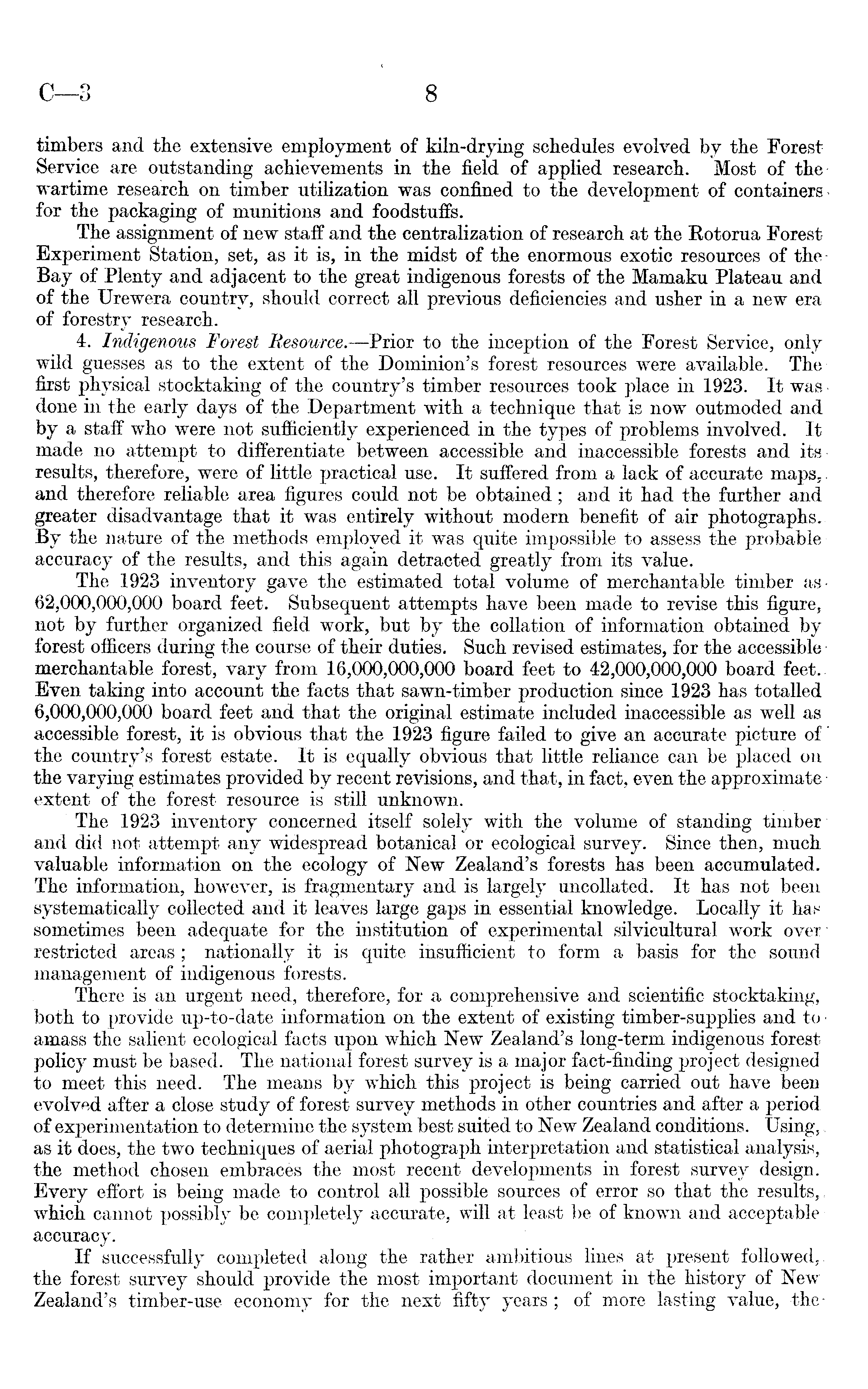 timbers and the extensive employment of kiln-drying schedules evolved by the Forest Service are outstanding achievements in the field of applied research. Most of thewartime research on timber utilization was confined to the development of containers - for the packaging of munitions and foodstuffs. The assignment of new staff and the centralization of research at the Kotorua Forest Experiment Station, set, as it is, in the midst of the enormous exotic resources of the Bay of Plenty and adjacent to the great indigenous forests of the Mamaku Plateau and of the Urewera country, should correct all previous deficiencies and usher in a new era of forestry research. 4. Indigenous Forest Resource. —Prior to the inception of the Forest Service, only wild guesses as to the extent of the Dominion's forest resources were available. The first physical stocktaking of the country's timber resources took place in 1923. It was done in the early days of the Department with a technique that is now outmoded and by a staff who were not sufficiently experienced in the types of problems involved. It made no attempt to differentiate between accessible and inaccessible forests and its results, therefore, were of little practical use. It suffered from a lack of accurate maps,, and therefore reliable area figures could not be obtained; and it had the further and greater disadvantage that it was entirely without modem benefit of air photographs. By the nature of the methods employed it was quite impossible to assess the probable accuracy of the results, and this again detracted greatly from its value. The 1923 inventory gave the estimated total volume of merchantable timber as--62,000,000,000 board feet. Subsequent attempts have been made to revise this figure, not by further organized field work, but by the collation of information obtained by forest officers during the course of their duties. Such revised estimates, for the accessible merchantable forest, vary from 16,000,000,000 board feet to 42,000,000,000 board feet. Even taking into account the facts that sawn-timber production since 1923 has totalled 6,000,000,000 board feet and that the original estimate included inaccessible as well as accessible forest, it is obvious that the 1923 figure failed to give an accurate picture of' the country's forest estate. It is equally obvious that little reliance can be placed on the varying estimates provided by recent revisions, and that, in fact, even the approximate • extent of the forest resource is still unknown. The 1923 inventory concerned itself solely with the volume of standing timber and did not attempt any widespread botanical or ecological survey. Since then, much valuable information on the ecology of New Zealand's forests has been accumulated. The information, however, is fragmentary and is largely uncollated. It has not been systematically collected and it leaves large gaps in essential knowledge. Locally it has sometimes been adequate for the institution of experimental silvicultural work over restricted areas ; nationally it is quite insufficient to form a basis for the sound management of indigenous forests. There is an urgent need, therefore, for a comprehensive and scientific stocktaking, both to provide up-to-date information on the extent of existing timber-supplies and to - amass the salient ecological facts upon which New Zealand's long-term indigenous forest policy must be based. The national forest survey is a major fact-finding project designed to meet this need. The means by which this project is being carried out have been evolved after a close study of forest survey methods in other countries and after a period of experimentation to determine the system best suited to New Zealand conditions. Using,, as it does, the two techniques of aerial photograph interpretation and statistical analysis, the method chosen embraces the most recent developments in forest survey design. Every effort is being made to control all possible sources of error so that the results,, which cannot possibly be completely accurate, will at least be Of known and acceptable accuracy. If successfully completed along the rather ambitious lines at present followed,the forest survey should provide the most important document in the history of New Zealand's timber-use economy for the next fifty years ; of more lasting value, the-