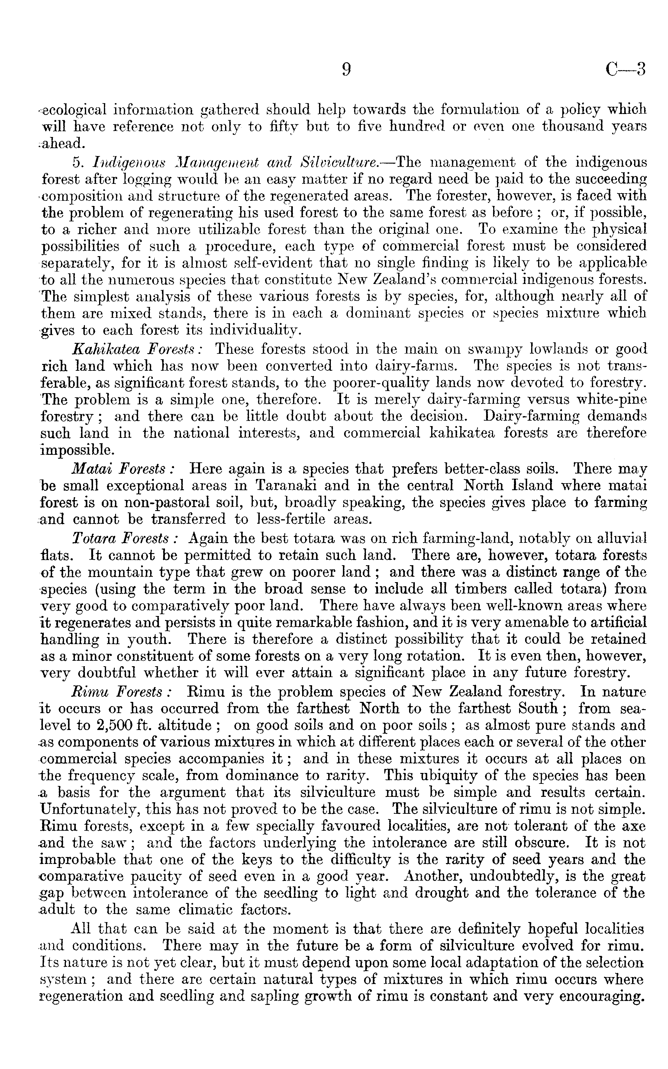 -ecological information gathered should help towards the formulation of a policy which will have reference not only to fifty but to five hundred or even one thousand years -ahead. 5. Indigenous Management and Silviculture. —The management of the indigenous forest after logging would be an easy matter if no regard need be paid to the succeeding •composition and structure of the regenerated areas. The forester, however, is faced with the problem of regenerating his used forest to the same forest as before ; or, if possible, to a richer and more utilizable forest than the original one. To examine the physical possibilities of such a procedure, each type of commercial forest must be considered separately, for it is almost self-evident that no single finding is likely to be applicable to all the numerous species that constitute New Zealand's commercial indigenous forests. The simplest analysis of these various forests is by species, for, although nearly all of them are mixed stands, there is in each a dominant species or species mixture which gives to each forest its individuality. Kahikatea Forests: These forests stood in the main on swampy lowlands or good rich land which has now been converted into dairy-farms. The species is not transferable, as significant forest stands, to the poorer-quality lands now devoted to forestry. The problem is a simple one, therefore. It is merely dairy-farming versus white-pine forestry; and there can be little doubt about the decision. Dairy-farming demands such land in the national interests, and commercial kahikatea forests are therefore impossible. Matai Forests: Here again is a species that prefers better-class soils. There may Tie small exceptional areas in Taranaki and in the central North Island where matai forest is on non-pastoral soil, but, broadly speaking, the species gives place to farming and cannot be transferred to less-fertile areas. Totara Forests : Again the best totara was on rich farming-land, notably on alluvial fiats. It cannot be permitted to retain such land. There are, however, totara forests of the mountain type that grew on poorer land ; and there was a distinct range of the species (using the term in the broad sense to include all timbers called totara) from very good to comparatively poor land. There have always been well-known areas where It regenerates and persists in quite remarkable fashion, and it is very amenable to artificial handling in youth. There is therefore a distinct possibility that it could be retained as a minor constituent of some forests on a very long rotation. It is even then, however, very doubtful whether it will ever attain a significant place in any future forestry. Rimu Forests: Rimu is the problem species of New Zealand forestry. In nature it occurs or has occurred from the farthest North to the farthest South; from sealevel to 2,500 ft. altitude ; on good soils and on poor soils ; as almost pure stands and .as components of various mixtures in which at different places each or several of the other commercial species accompanies it; and in these mixtures it occurs at all places on "the frequency scale, from dominance to rarity. This übiquity of the species has been •a basis for the argument that its silviculture must be simple and results certain. Unfortunately, this has not proved to be the case. The silviculture of rimu is not simple. Rimu forests, except in a few specially favoured localities, are not tolerant of the axe and the saw; and the factors underlying the intolerance are still obscure. It is not improbable that one of the keys to the difficulty is the rarity of seed years and the comparative paucity of seed even in a good year. Another, undoubtedly, is the great gap between intolerance of the seedling to light and drought and the tolerance of the adult to the same climatic factors. All that can be said at the moment is that there are definitely hopeful localities and conditions. There may in the future be a form of silviculture evolved for rimu. Its nature is not yet clear, but it must depend upon some local adaptation of the selection system; and there are certain natural types of mixtures in which rimu occurs where regeneration and seedling and sapling growth of rimu is constant and very encouraging.