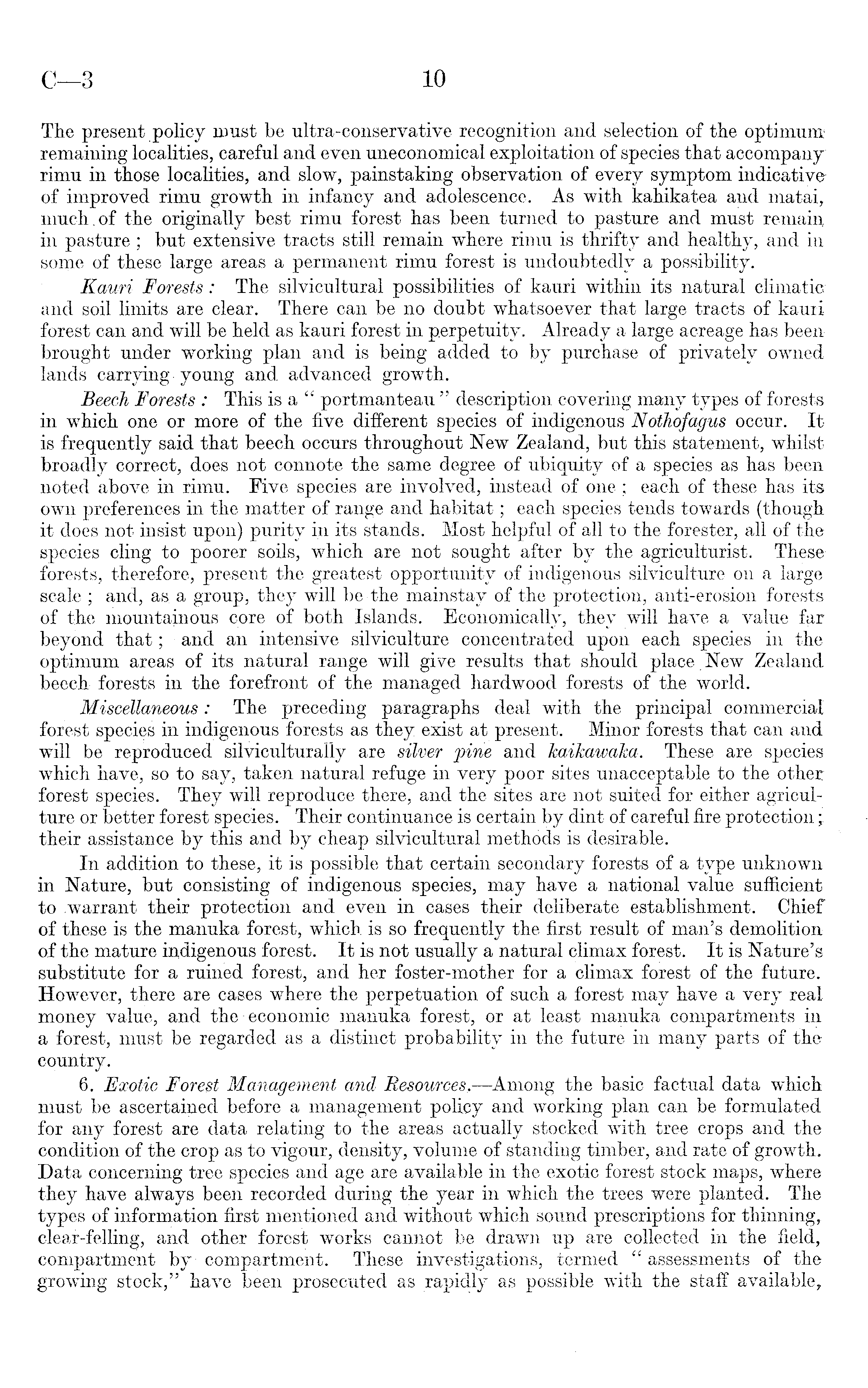The present policy must be ultra-conservative recognition and selection of the optimum remaining localities, careful and even uneconomical exploitation of species that accompany rimu in those localities, and slow, painstaking observation of every symptom indicative of improved rimu growth in infancy and adolescence. As with kahikatea and matai, much.of the originally best rimu forest has been turned to pasture and must remain in pasture; but extensive tracts still remain where rimu is thrifty and healthy, and in some of these large areas a permanent rimu forest is undoubtedly a possibility. Kauri Forests: The silvicultural possibilities of kauri within its natural climatic and soil limits are clear. There can be no doubt whatsoever that large tracts of kauri forest can and will be held as kauri forest in perpetuity. Already a large acreage has been brought under working plan and is being added to by purchase of privately owned lands carrying young and advanced growth. Beech Forests : This is a " portmanteau " description covering many types of forestsin which one or more of the five different species of indigenous Nothofagus occur. It is frequently said that beech occurs throughout New Zealand, but this statement, whilst broadly correct, does not connote the same degree of übiquity of a species as has been noted above in rimu. Five species are involved, instead of one; each of these has itsown preferences in the matter of range and habitat; each species tends towards (though it does not insist upon) purity in its stands. Most helpful of all to the forester, all of the species cling to poorer soils, which are not sought after by the agriculturist. These forests, therefore, present the greatest opportunity of indigenous silviculture on a large scale ; and, as a group, they will be the mainstay of the protection, anti-erosion forests of the mountainous core of both Islands. Economically, they will have a value far beyond, that; and an intensive silviculture concentrated upon each species in the optimum areas of its natural range will give results that should place New Zealand beech forests in the forefront of the managed hardwood forests of the world. Miscellaneous: The preceding paragraphs deal with the principal commercial forest species in indigenous forests as they exist at present. Minor forests that can and will be reproduced silviculturally are silver jrlne and kaikawaka. These are species which have, so to say, taken natural refuge in very poor sites unacceptable to the other forest species. They will reproduce there, and the sites are not suited for either agriculture or better forest species. Their continuance is certain by dint of careful fire protection j their assistance by this and by cheap silvicultural methods is desirable. In addition to these, it is possible that certain secondary forests of a type unknown in Nature, but consisting of indigenous species, may have a national value sufficient to warrant their protection and even in cases their deliberate establishment. Chief of these is the manuka forest, which is so frequently the first result of man's demolition of the mature indigenous forest. It is not usually a natural climax forest. It is Nature's substitute for a ruined forest, and her foster-mother for a climax forest of the future. However, there are cases where the perpetuation of such a forest may have a very real money value, and the economic manuka forest, or at least manuka compartments in a forest, must be regarded as a distinct probability in the future in many parts of the country. 6. Exotic Forest Management and Resources, —Among the basic factual data which must be ascertained before a management policy and working plan can be formulated for any forest are data relating to the areas actually stocked with tree crops and the condition of the crop as to vigour, density, volume of standing timber, and rate of growth. Data concerning tree species and age are available in the exotic forest stock maps, where they have always been recorded during the year in which the trees were planted. The types of information first mentioned and without which sound prescriptions for thinning, clear-felling, and other forest works cannot be drawn up are collected in the field, compartment by-compartment. These investigations, termed "assessments of the growing stock," have been prosecuted as rapidly ,as possible with the staff available,