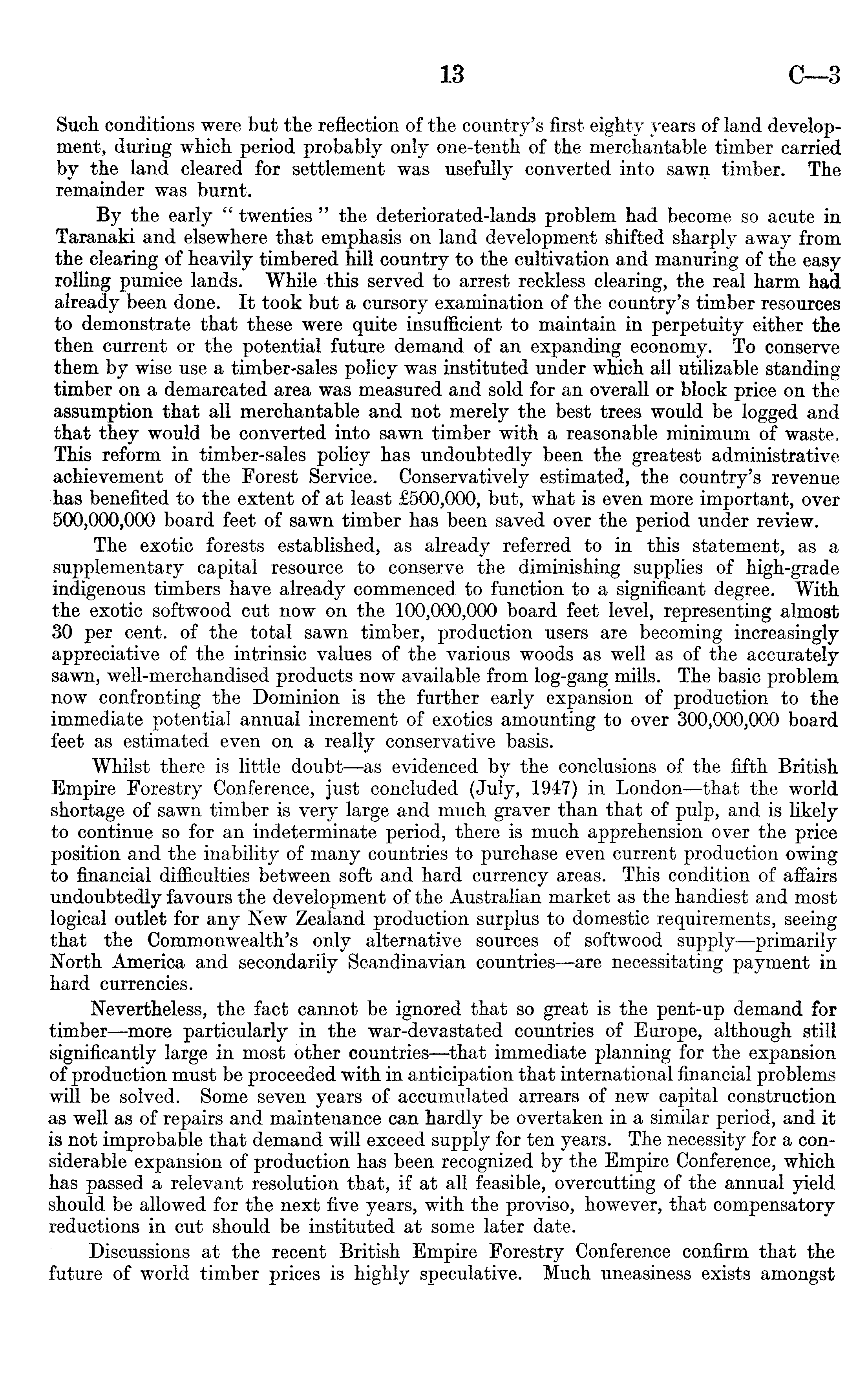 Such conditions were but the reflection of the country's first eighty years of land development, during which period probably only one-tenth of the merchantable timber carried by the land cleared for settlement was usefully converted into sawn timber. The remainder was burnt. By the early " twenties " the deteriorated-lands problem had become so acute in Taranaki and elsewhere that emphasis on land development shifted sharply away from the clearing of heavily timbered hill country to the cultivation and manuring of the easy rolling pumice lands. While this served to arrest reckless clearing, the real harm had already been done. It took but a cursory examination of the country's timber resources to demonstrate that these were quite insufficient to maintain in perpetuity either the then current or the potential future demand of an expanding economy. To conserve them by wise use a timber-sales policy was instituted under which all utilizable standing timber on a demarcated area was measured and sold for an overall or block price on the assumption that all merchantable and not merely the best trees would be logged and that they would be converted into sawn timber with a reasonable minimum of waste. This reform in timber-sales policy has undoubtedly been the greatest administrative achievement of the Forest Service. Conservatively estimated, the country's revenue has benefited to the extent of at least £500,000, but, what is even more important, over 500,000,000 board feet of sawn timber has been saved over the period under review. The exotic forests established, as already referred to in this statement, as a supplementary capital resource to conserve the diminishing supplies of high-grade indigenous timbers have already commenced to function to a significant degree. With the exotic softwood cut now on the 100,000,000 board feet level, representing almost 30 per cent, of the total sawn timber, production users are becoming increasingly appreciative of the intrinsic values of the various woods as well as of the accurately sawn, well-merchandised products now available from log-gang mills. The basic problem now confronting the Dominion is the further early expansion of production to the immediate potential annual increment of exotics amounting to over 300,000,000 board feet as estimated even on a really conservative basis. Whilst there is little doubt—as evidenced by the conclusions of the fifth British Empire Forestry Conference, just concluded (July, 1947) in London—that the world shortage of sawn timber is very large and much graver than that of pulp, and is likely to continue so for an indeterminate period, there is much apprehension over the price position and the inability of many countries to purchase even current production owing to financial difficulties between soft and hard currency areas. This condition of affairs undoubtedly favours the development of the Australian market as the handiest and most logical outlet for any New Zealand production surplus to domestic requirements, seeing that the Commonwealth's only alternative sources of softwood supply—primarily North America and secondarily Scandinavian countries —are necessitating payment in hard currencies. Nevertheless, the fact cannot be ignored that so great is the pent-up demand for timber—more particularly in the war-devastated countries of Europe, although still significantly large in most other countries —that immediate planning for the expansion of production must be proceeded with in anticipation that international financial problems will be solved. Some seven years of accumulated arrears of new capital construction as well as of repairs and maintenance can hardly be overtaken in a similar period, and it is not improbable that demand will exceed supply for ten years. The necessity for a considerable expansion of production has been recognized by the Empire Conference, which has passed a relevant resolution that, if at all feasible, overcutting of the annual yield should be allowed for the next five years, with the proviso, however, that compensatory reductions in cut should be instituted at some later date. Discussions at the recent British Empire Forestry Conference confirm that the future of world timber prices is highly speculative. Much uneasiness exists amongst