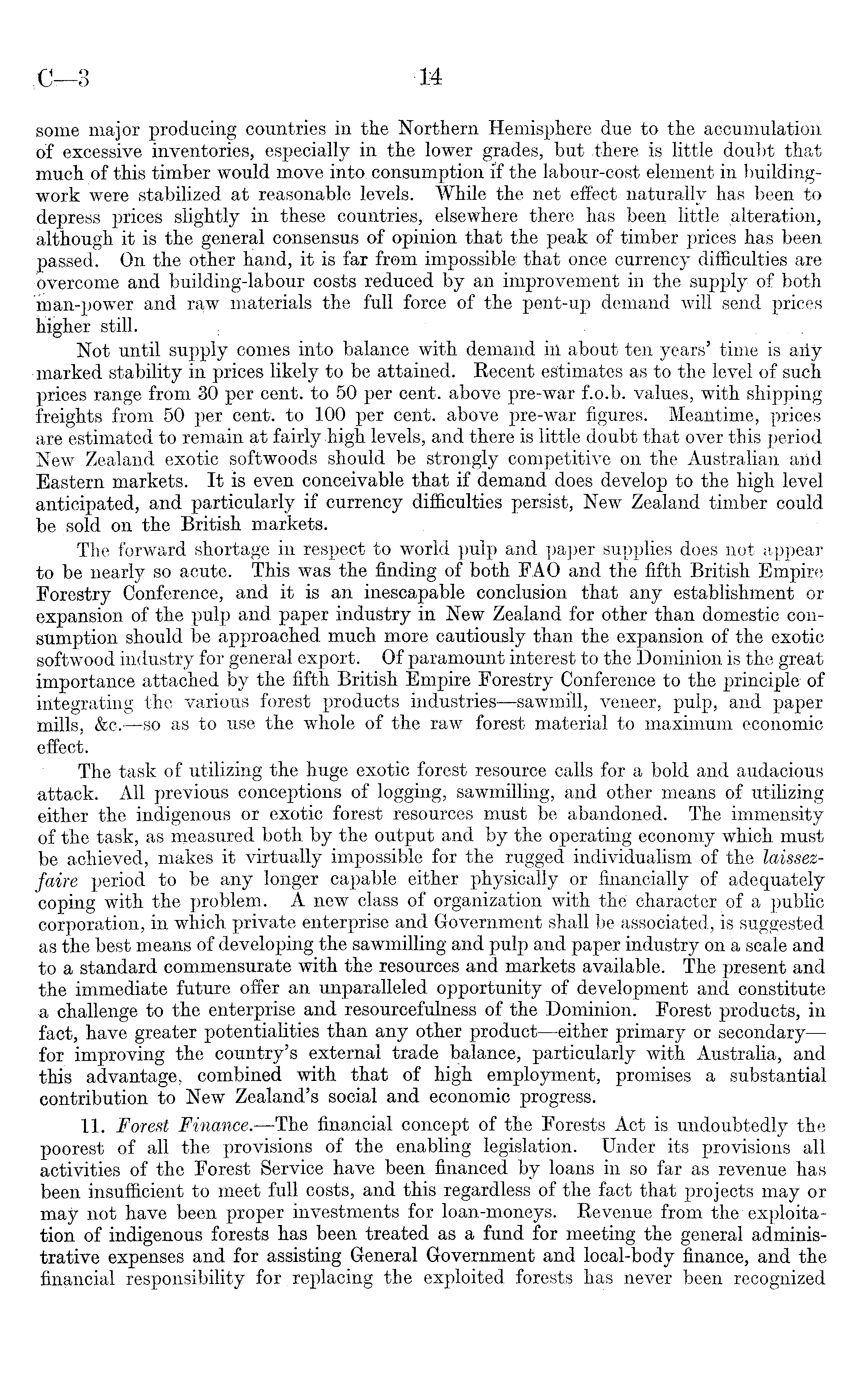 some major producing countries in the Northern Hemisphere due to the accumulation of excessive inventories, especially in the lower grades, but .there is little doubt that much of this timber would move into consumption if the labour-cost element in buildingwork were stabilized at reasonable levels. While the net effect naturally has been to depress prices slightly in these countries, elsewhere there has been little alteration, although it is the general consensus of opinion that the peak of timber prices has been passed. On the other hand, it is far from impossible that once currency difficulties are overcome and building-labour costs reduced by an improvement in the supply of both man-power and raw materials the full force of the pent-up demand will send prices Hgher still. Not Until supply comes into balance with demand in about ten years' time is aiiy marked stability in prices likely to be attained. Recent estimates as to the level of such prices range from 30 per cent, to 50 per cent, above pre-war f.o.b. values, with shipping freights from 50 per cent: to 100 per cent, above pre-war figures. Meantime, prices are estimated to remain at fairly high levels, and there is little doubt that over this period New Zealand exotic softwoods should be strongly competitive on the Australian and Eastern markets. It is even conceivable that if demand does develop to the high level anticipated, and particularly if currency difficulties persist, New Zealand timber could be sold on the British markets. The forward shortage in respect to world pulp and paper supplies does not appear to be nearly so acute. This was the finding of both FAO and the fifth British Empire Forestry Conference, and it is an inescapable conclusion that any establishment or expansion of the pulp and paper industry in New Zealand for other than domestic consumption should be approached much more cautiously than the expansion of the exotic softwood industry for general export. Of paramount interest to the Dominion is the great importance attached by the fifth British Empire Forestry Conference to the principle of integrating the various forest products industries—sawmill, veneer, pulp, and paper mills, &c. —so as to use the whole of the raw forest material to maximum economic effect. The task of utilizing the huge exotic forest resource calls for a bold and audacious attack. All previous conceptions of logging, sawmilling, and other means of utilizing either the indigenous or exotic forest resources must be abandoned. The immensity of the task, as measured both by the output and by the operating economy which must be achieved, makes it virtually impossible for the rugged individualism of the laissezfaire period to be any longer capable either physically or financially of adequately coping with the problem. A new class of organization with the character of a public corporation, in which private enterprise and Government shall be associated, is suggested as the best means of developing the sawmilling and pulp and paper industry on a scale and to a standard commensurate with the resources and markets available. The present and the immediate future offer an unparalleled opportunity of development and constitute a challenge to the enterprise and resourcefulness of the Dominion. Forest products, in fact, have greater potentialities than any other product—either primary or secondary—for improving the country's external trade balance, particularly with Australia, and this advantage, combined with that of high employment, promises a substantial contribution to New Zealand's social and economic progress. 11. Forest Finance. —The financial concept of the Forests Act is undoubtedly the poorest of all the provisions of the enabling legislation. Under its provisions all activities of the Forest Service have been financed by loans in so far as revenue has been insufficient to meet full costs, and this regardless of the fact that projects may or may not have been proper investments for loan-moneys. Revenue from the exploitation of indigenous forests has been treated as a fund for meeting the general administrative expenses and for assisting General Government and local-body finance, and the financial responsibility for. replacing the exploited forests has never been recognized