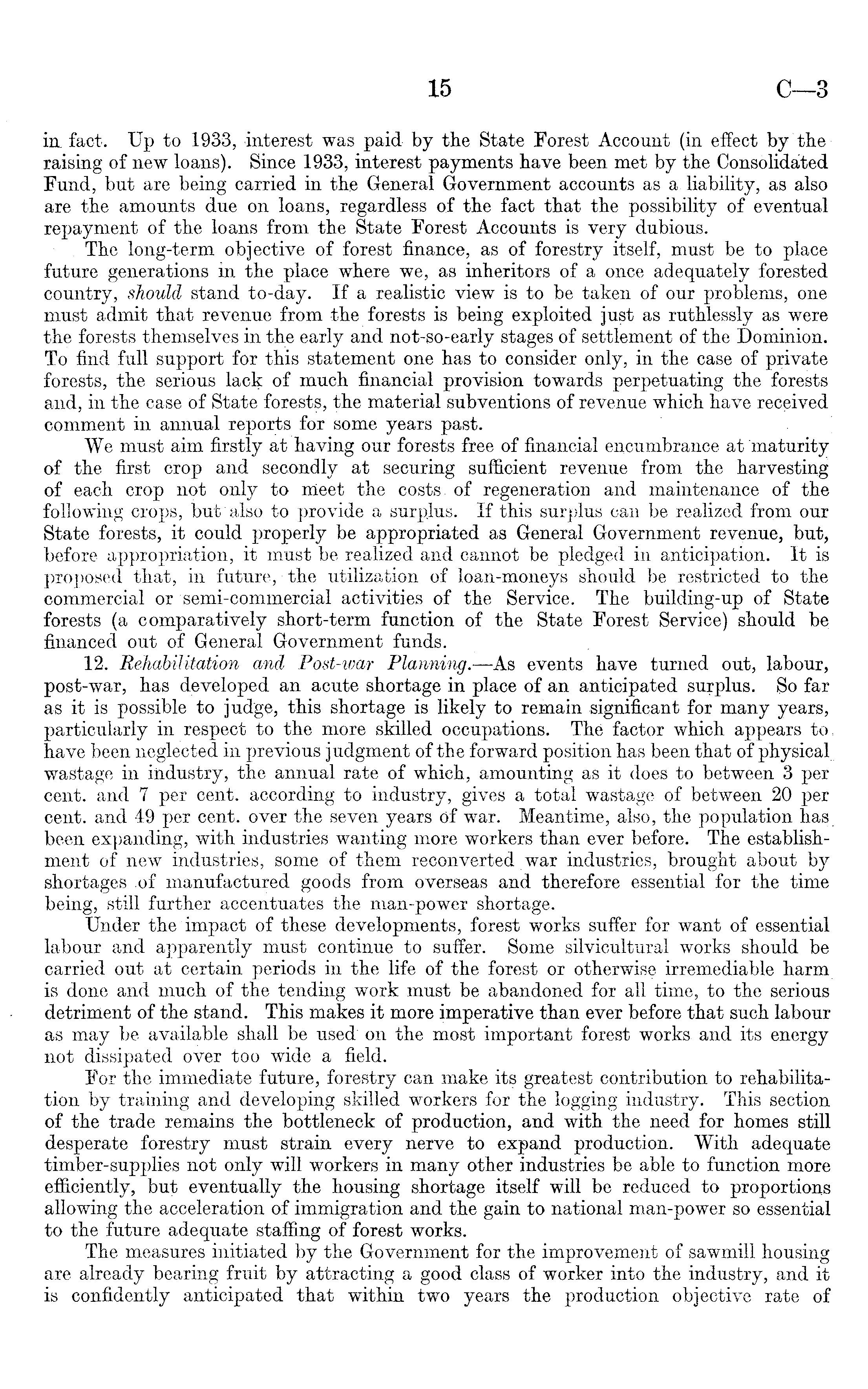 in fact. Up to 1933, interest was paid by the State Forest Account (in effect by the raising of new loans). Since 1933, interest payments have been met by the Consolidated Fund, but are being carried in the General Government accounts as a liability, as also are the amounts due on loans, regardless of the fact that the possibility of eventual repayment of the loans from the State Forest Accounts is very dubious. The long-term objective of forest finance, as of forestry itself, must be to place future generations in the place where we, as inheritors of a once adequately forested country, should stand to-day. If a realistic view is to be taken of our problems, one must admit that revenue from the forests is being exploited just as ruthlessly as were the forests themselves in the early and not-so-early stages of settlement of the Dominion. To find full support for this statement one has to consider only, in the case of private forests, the serious lack of much financial provision towards perpetuating the forests and, in the case of State forests, the material subventions of revenue which have received comment in annual reports for some years past. We must aim firstly at having our forests free of financial encumbrance at maturity of the first crop and secondly at securing sufficient revenue from the harvesting of each crop not only to meet the costs of regeneration and maintenance of the following crops, but also to provide a surplus. If this surplus can be realized from our State forests, it could properly be appropriated as General Government revenue, but, before appropriation, it must be realized and cannot be pledged in anticipation. It is proposed that, in future, the utilization of loan-moneys should be restricted to the commercial or semi-commercial activities of the Service. The building-up of State forests (a comparatively short-term function of the State Forest Service) should be financed out of General Government funds. 12. Rehabilitation and Post-war Planning.—As events have turned out, labour, post-war, has developed an acute shortage in place of an anticipated surplus. So far as it is possible to judge, this shortage is likely to remain significant for many years, particularly in respect to the more skilled occupations. The factor which appears to have been neglected in previous judgment of the forward position has been that of physical wastage in industry, the annual rate of which, amounting as it does to between 3 per cent, and 7 per cent, according to industry, gives a total wastage of between 20 per cent, and 49 per cent, over the seven years of war. Meantime, also, the population has been expanding, with industries wanting more workers than ever before. The establishment of new industries, some of them reconverted war industries, brought about by shortages of - manufactured goods from overseas and therefore essential for the time being, still further accentuates the man-power shortage. Under the impact of these developments, forest works suffer for want of essential labour and apparently must continue to suffer. Some silvicultural works should be carried out at certain periods in the life of the forest or otherwise irremediable harm is done and much of the tending work must be abandoned for all time, to the serious detriment of the stand. This makes it more imperative than ever before that such labour as may be available shall be used on the most important forest works and its energy not dissipated over too wide a field. For the immediate future, forestry can make its greatest contribution to rehabilitation by training and developing skilled workers for the logging industry. This section of the trade remains the bottleneck of production, and with the need for homes still desperate forestry must strain every nerve to expand production. With adequate timber-supplies not only will workers in many other industries be able to function more efficiently, but eventually the housing shortage itself will be reduced to proportions allowing the acceleration of immigration and the gain to national man-power so essential to the future adequate staffing of forest works. The measures initiated by the Government for the improvement of sawmill housing are already bearing fruit by attracting a good class of worker into the industry, and it is confidently anticipated that within two years the production objective rate of