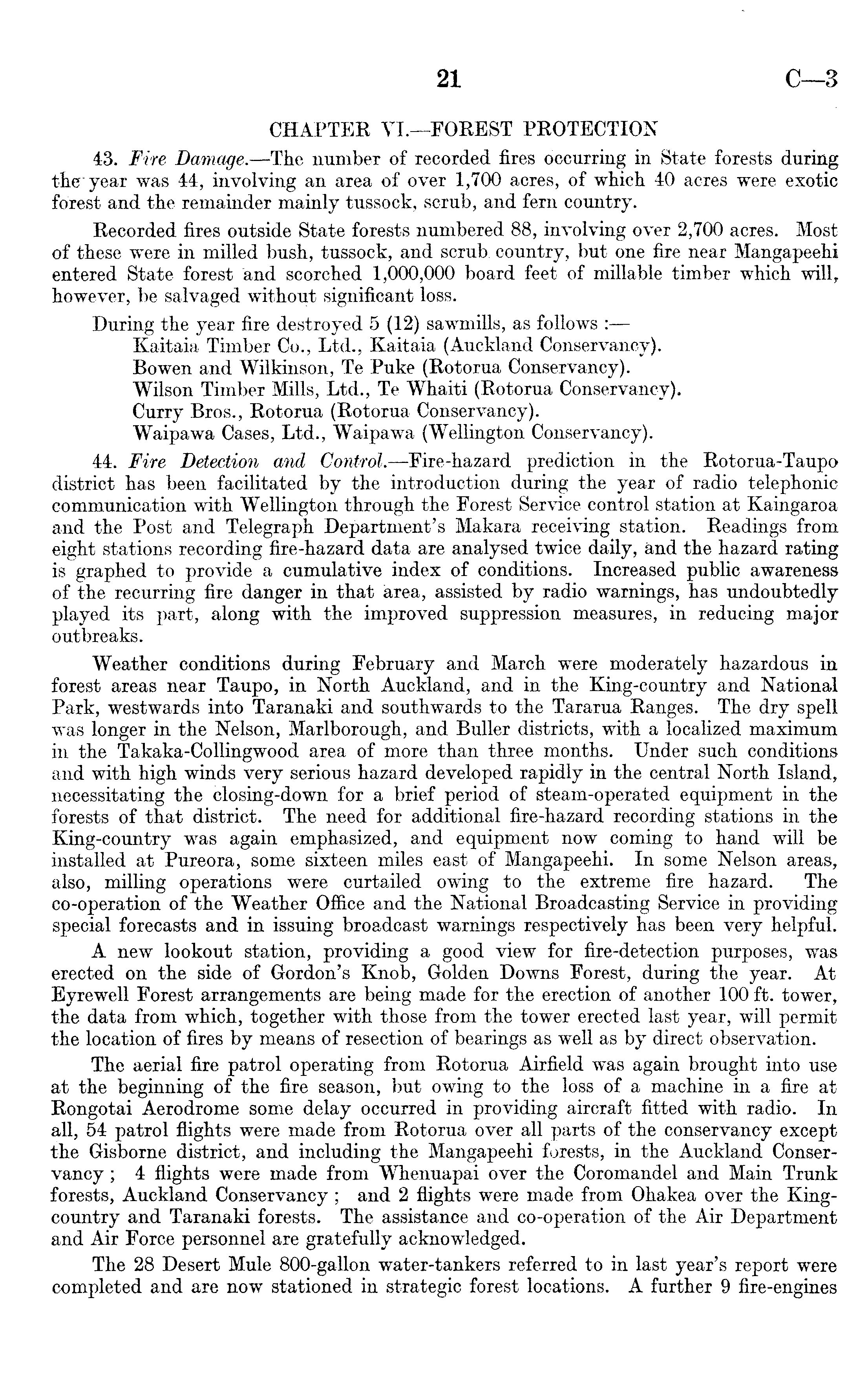 CHAPTER VI.—FOREST PROTECTION 43. Fire Damage.—The number of recorded fires occurring in State forests during the'year was 44, involving an area of over 1,700 acres, of which 40 acres were exotic forest and the remainder mainly tussock, scrub, and fern country. Recorded fires outside State forests numbered 88, involving over 2,700 acres. Most of these were in milled bush, tussock, and scrub, country, but one fire near Mangapeehi entered State forest and scorched 1,000,000 board feet of millable timber which will, however, be salvaged without significant loss. During the year fire destroyed 5 (12) sawmills, as follows : Kaitaia Timber Co., Ltd., Kaitaia (Auckland Conservancy). Bo wen and Wilkinson, Te Puke (Rotorua Conservancy). Wilson Timber Mills, Ltd., Te Whaiti (Rotorua Conservancy). Curry Bros., Rotorua (Rotorua Conservancy). Waipawa Cases, Ltd., Waipawa (Wellington Conservancy). 44. Fire Detection and Control. —Eire-hazard prediction in the Rotorua-Taupo district has been facilitated by the introduction during the year of radio telephonic communication with Wellington through the Forest Service control station at Kaingaroa and the Post and Telegraph Department's Makara receiving station. Readings from eight stations recording fire-hazard data are analysed twice daily, and the hazard rating is graphed to provide a cumulative index of conditions. Increased public awareness of the recurring fire danger in that area, assisted by radio warnings, has undoubtedly played its part, along with the improved suppression measures, in reducing major outbreaks. Weather conditions during February and March were moderately hazardous in forest areas near Taupo, in North Auckland, and in the King-country and National Park, westwards into Taranaki and southwards to the Tararua Ranges. The dry spell was longer in the Nelson, Marlborough, and Buller districts, with a localized maximum in the Takaka-Collingwood area of more than three months. Under such conditions and with high winds very serious hazard developed rapidly in the central North Island, necessitating the closing-down for a brief period of steam-operated equipment in the forests of that district. The need for additional fire-hazard recording stations in the King-country was again emphasized, and equipment now coming to hand will be installed at Pureora, some sixteen miles east of Mangapeehi. In some Nelson areas, also, milling operations were curtailed owing to the extreme fire hazard. The co-operation of the Weather Office and the National Broadcasting Service in providing special forecasts and in issuing broadcast warnings respectively has been very helpful. A new lookout station, providing a good view for fire-detection purposes, was erected on the side of Gordon's Knob, Golden Downs Forest, during the year. At Eyrewell Forest arrangements are being made for the erection of another 100 ft. tower, the data from which, together with those from the tower erected last year, will permit the location of fires by means of resection of bearings as well as by direct observation. The aerial fire patrol operating from Rotorua Airfield was again brought into use at the beginning of the fire season, but owing to the loss of a machine in a fire at Rongotai Aerodrome some delay occurred in providing aircraft fitted with radio. In all, 54 patrol flights were made from Rotorua over all parts of the conservancy except the Gisborne district, and including the Mangapeehi forests, in the Auckland Conservancy ; 4 flights were made from Whenuapai over the Coromandel and Main Trunk forests, Auckland Conservancy; and 2 flights were made from Ohakea over the Kingcountry and Taranaki forests. The assistance and co-operation of the Air Department and Air Force personnel are gratefully acknowledged. The 28 Desert Mule 800-gallon water-tankers referred to in last year's report were completed and are now stationed in strategic forest locations. A further 9 fire-engines