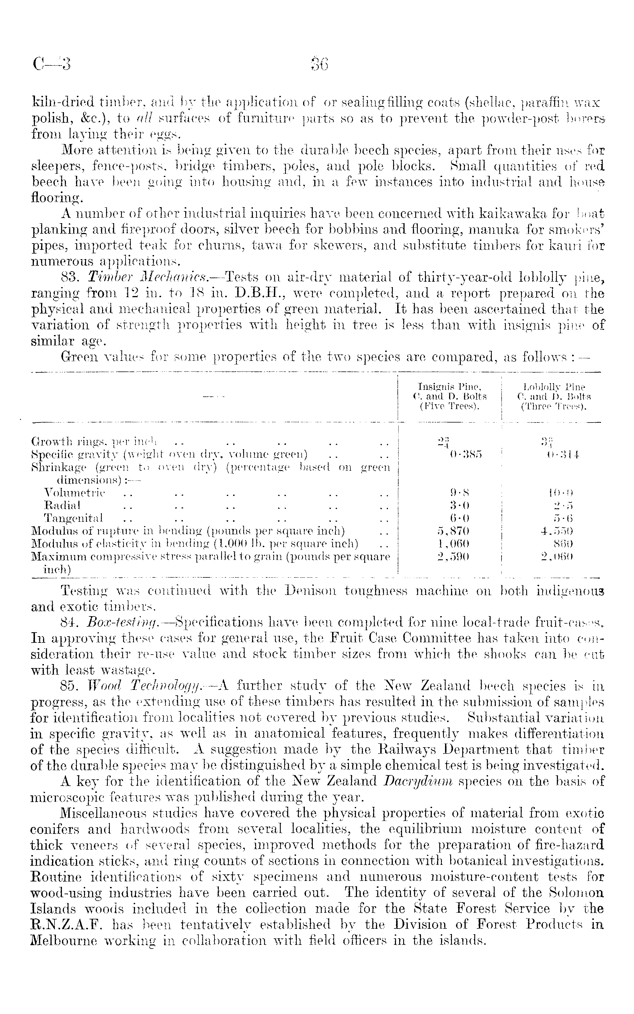 Testing was continued with the Denison toughness machine on both indigenous and exotic timbers. 84. Box-testing.—Specifications have been completed for nine local-trade fruit-cases. In approving these cases for general use, the Fruit Case Committee has taken into consideration their re-use value and stock timber sizes from which the shooks can be cut with least wastage. 85. Wood Technology. —A further study of the New Zealand beech species is in progress, as the extending use of these timbers has resulted in the submission of samples for identification from localities not covered by previous studies. Substantial variation in specific gravity, as well as in anatomical features, frequently makes differentiation of the species difficult. A suggestion made by the Railways Department that timber of the durable species may be distinguished by a simple chemical test is being investigated. A key for the identification of the New Zealand Dacrydium species on the basis of microscopic features was published during the year. Miscellaneous studies have covered the physical properties of material from exotic conifers and hardwoods from several localities, the equilibrium moisture content of thick veneers of several species, improved methods for the preparation of fire-hazard indication sticks, and ring counts of sections in connection with botanical investigations. Routine identifications of sixty specimens and numerous moisture-content tests for wood-using industries have been carried out. The identity of several of the Solomon Islands woods included in the collection made for the State Forest Service by the R.N.Z.A.F. has been tentatively established by the Division of Forest Products in Melbourne working in collaboration with field officers in the islands.