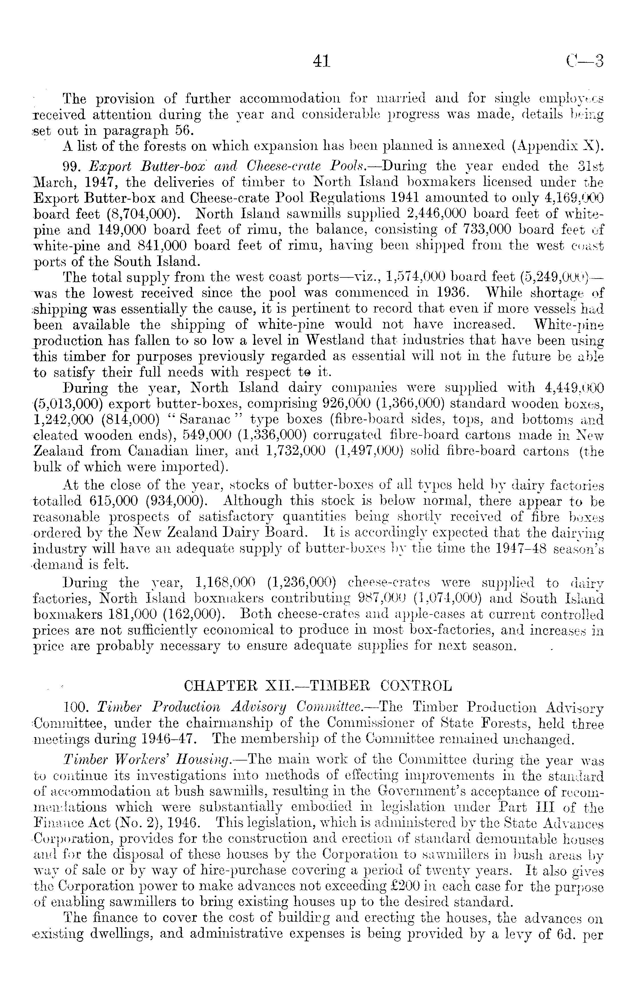 The provision of further accommodation for married and for single employees Teceived attention during the year and considerable progress was made, details being set out in paragraph 56. A list of the forests on which expansion has been planned is annexed (Appendix X), 99. Export Butter-box and Cheese-crate Pools.—During the year ended the 31st March, 1947, the deliveries of timber to North Island boxmakers licensed under the Export Butter-box and Cheese-crate Pool Regulations 1941 amounted to only 4,169,000 board feet (8,704,000). North Island sawmills supplied 2,446,000 board feet of whitepine and 149,000 board feet of rimu, the balance, consisting of 733,000 board feet of white-pine and 841,000 board feet of rimu, having been shipped from the west coast ports of the South Island. The total supply from the west coast ports —viz., 1,574,000 board feet (5,249,000) — was the lowest received since the pool was commenced in 1936. While shortage of shipping was essentially the cause, it is pertinent to record that even if more vessels had been available the shipping of white-pine would not have increased. White-pine production has fallen to so low a level in Westland that industries that have been using this timber for purposes previously regarded as essential will not in the future be able to satisfy their full needs with respect t@ it. During the year, North Island dairy companies were supplied with 4,449,000 -(5,013,000) export butter-boxes, comprising 926,000 (1,366,000) standard wooden boxes, 1,242,000 (814,000) " Saranac " type boxes (fibre-board sides, tops, and bottoms and cleated wooden ends), 549,000 (1,336,000) corrugated fibre-board cartons made in New -Zealand from Canadian liner, and 1,732,000 (1,497,000) solid fibre-board cartons (the bulk of which were imported). At the close of the year, stocks of butter-boxes of all types held by dairy factories "totalled 615,000 (934,000). Although this stock is below normal, there appear to be reasonable prospects of satisfactory quantities being shortly received of fibre boxes •ordered by the New Zealand Dairy Board. It is accordingly expected that the dairying industry will have an adequate supply of butter-boxes by the time the 1947-48 season's •demand is felt. During the year, 1,168,000 (1,236,000) cheese-crates were supplied to dairy factories, North Island boxmakers contributing 987,000 (1,074,000) and South Island boxmakers 181,000 (162,000). Both cheese-crates and apple-cases at current controlled prices are not sufficiently economical to produce in most box-factories, and increases in price are probably necessary to ensure adequate supplies for next season. . • CHAPTER XII.—TIMBER CONTROL 100. Timber Production Advisory Committee.—The Timber Production Advisory Committee, under the chairmanship of the Commissioner of State Forests, held three meetings during 1946-47. The membership of the Committee remained unchanged. Timber Workers' Housing.—The main work of the Committee during the year was to continue its investigations into methods of effecting improvements in the standard of accommodation at bush sawmills, resulting in the Government's acceptance of recommendations which were substantially embodied in legislation under Part 111 of the Finance Act (No. 2), 1946. This legislation, which is administered by the State Advances -Corporation, provides for the construction and erection of standard demountable houses and for the disposal of these houses by the Corporation to sawmillers in bush areas by way of sale or by way of hire-purchase covering a period of twenty years. It also gives the Corporation power to make advances not exceeding £2OO in each case for the purpose of enabling sawmillers to bring existing houses up to the desired standard. The finance to cover the cost of buildirg and erecting the houses, the advances on existing dwellings, and administrative expenses is being provided by a levy of 6d. per