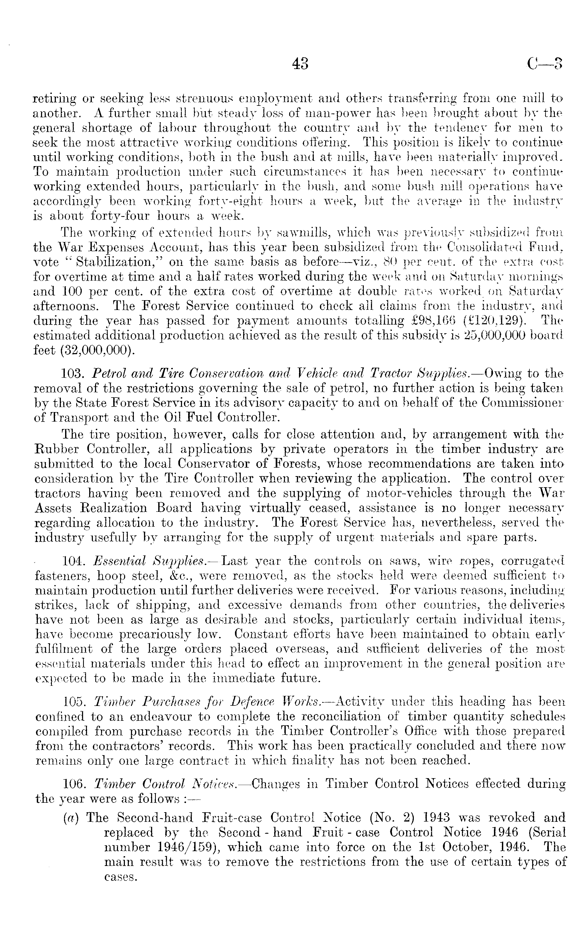 retiring or seeking less strenuous employment and others transferring from one mill to another. A further small but steady loss of man-power has been brought about by the general shortage of labour throughout the country and by the tendency for men to seek the most attractive working conditions offering. This position is likely to continue until working conditions, both in the bush and at mills, have been materially improved. To maintain production under such circumstances it has been necessary to continue working extended hours, particularly in the bush, and some bush mill operations have accordingly been working forty-eight hours a week, but the average in the industry is about forty-four hours a week. The working of extended hours by sawmills, which was previously subsidized from the War Expenses Account, has this year been subsidized from the Consolidated Fund, vote " Stabilization," on the same basis as before —viz., 80 per cent, of the extra cost' for overtime at time and a half rates worked during the week and on Saturday mornings and 100 per cent, of the extra cost of overtime at double rates worked on Saturday afternoons. The Forest Service continued to check all claims from the industry, and during the year has passed for payment amounts totalling £98,166 (£120,129). The estimated additional production achieved as the result of this subsidy is 25,000,000 board feet (32,000,000). 103. Petrol and Tire Conservation and Vehicle and Tractor Supplies.—Owing to the removal of the restrictions governing the sale of petrol, no further action is being taken by the State Forest Service in its advisory capacity to and on behalf of the Commissioner of Transport and the Oil Fuel Controller. The tire position, however, calls for close attention and, by arrangement with the Rubber Controller, all applications by private operators in the timber industry are submitted to the local Conservator of Forests, whose recommendations are taken into consideration by the Tire Controller when reviewing the application. The control over tractors having been removed and the supplying of motor-vehicles through the War Assets Realization Board having virtually ceased, assistance is no longer necessary regarding allocation to the industry. The Forest Service has, nevertheless, served the industry usefully by arranging for the supply of urgent materials and spare parts. 104. Essential Supplies. —Last year the controls on saws, wire ropes, corrugated fasteners, hoop steel, &c., were removed, as the stocks held were deemed sufficient to maintain production until further deliveries were received. For various reasons, including strikes, lack of shipping, and excessive demands from other countries, the deliveries have not been as large as desirable and stocks, particularly certain individual items, have become precariously low. Constant efforts have been maintained to obtain early fulfilment of the large orders placed overseas, and sufficient deliveries of the most essential materials under this head to effect an improvement in the general position are expected to be made in the immediate future. 105. Timber Purchases for Defence Works. —Activity under this heading has been confined to an endeavour to complete the reconciliation of timber quantity schedules compiled from purchase records in the Timber Controller's Office with those prepared from the contractors' records. This work has been practically concluded and there now remains only one large contract in which finality has not been reached. 106. Timber Control Notices. —Changes in Timber Control Notices effected during the year were as follows : (a) The Second-hand Fruit-case Control Notice (No. 2) 1943 was revoked and replaced by the Second - hand Fruit - case Control Notice 1946 (Serial number 1946/159), which came into force on the Ist October, 1946. The main result was to remove the restrictions from the use of certain types of cases.