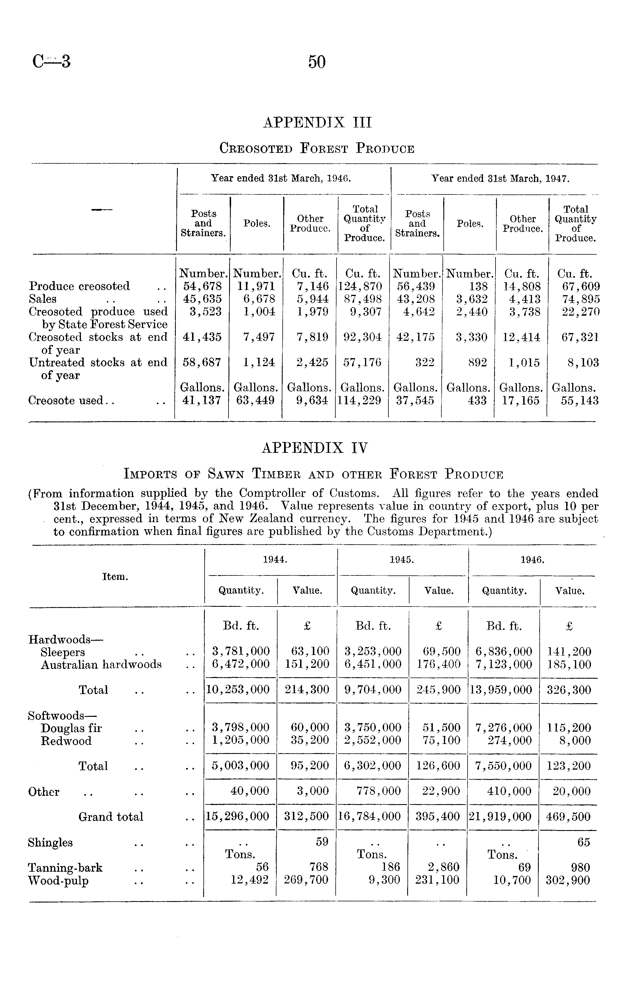 (From information supplied by the Comptroller of Customs. All figures refer to the years ended 31st December, 1944, 1945, and 1946. Value represents value in country of export, plus 10 per . cent., expressed in terms of New Zealand currency. The figures for 1945 and 1946 are subject to confirmation when final figures are published by the Customs Department.) Item. 1944. 1945. 1946. Quantity. Value. Quantity. Value. Quantity. Value. Hardwoods— Sleepers Australian hardwoods Bd. ft. 3,781,000 6,472,000 £ 63,100 151,200 Bd. ft. 3,253,000 6,451,000 £ 69,500 176,400 Bd. ft. 6,836,000 7,123,000 £ 141,200 185,100 Total 10,253,000 214,300 9,704,000 245,900 13,959,000 326,300 Softwoods — Douglas fir Redwood 3,798,000 1,205,000 60,000 35,200 3,750,000 2,552,000 51,500 75,100 7,276,000 274,000 115,200 8,000 Total 5,003,000 95,200 6,302,000 126,600 7,550,000 123,200 Other 40,000 3,000 778,000 22,900 410,000 20,000 Grand total 15,296,000 312,500 16,784,000 395,400 21,919,000 469,500 Shingles Tanning-bark Wood-pulp Tons. 56 12,492 59 768 269,700 Tons. 186 9,300 2,860 231,100 Tons. 69 10,700 65 980 302,900