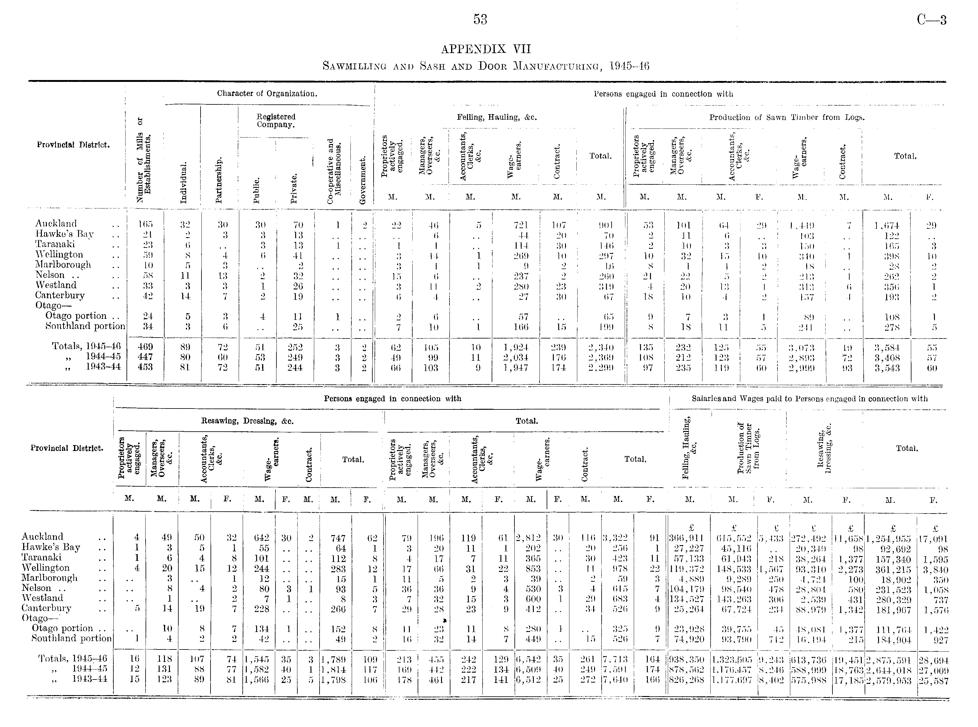 Character of Organization. 1 Persons engaged in connection with o Registered Company. Felling, Hauling, &c. Produc ion of Sawn Timber from Logs. m . •cist So % O —j M M « tu PH 2 a - -S3 . a ° sM go V Provincial District. ~1 si "c« 1* 1 S3 <6 -W §3 ®g <aa U V o a o" o f a g !r So 03 $ is 03 a § s g ■*? d © o Total. S> .2 tc A.J3 bfi 2 S P t-i n CM S3 S JS a |83«j Ho 1 t O O O a «s j § a i so <u 4$ I ta o o Total. § & w ■3 3 a 1 PM 1 PH > 'E PM 15 o CJ M. M. M. M. M. M. M. M. M. F. M. M. M. F. Auckland Hawke's Bay Taranaki Wellington Marlborough Nelson Westland Canterbury Otago— Otago portion .. Southland portion 165 21 23 59 10 58 33 42 24 34 32 2 6 S 5 11 3 14 5 3 30 3 ■i 3 13 3 7 3 6 30 3 3 6 2 1 2 4 70 13 13 41 2 32 26 19 11 25 1 i i ' 22 1 3 3 15 3 6 2 7 46 6 1 14 1 6 11 4 6 10 5 i 1 2 i 721 44 114 269 9 237 280 27 57 166 107 20 30 10 2 2 23 30 is 901 70 146 297 Ifi 260 319 67 65 199 53 2 2 10 8 21 4 18 9 8 101 11 10 32 1 22 20 10 7 18 64 6 3 15 1 5 13 4 3 11 29 3 10 2 2 1 2 1 5 1,449 103 150 340 18 213 313 157 89 241 7 i i 6 4 1,674 122 165 398 28 262 356 193 108 278 29 3 10 2 2 1 2 1 5 Totals, 1945-46 „ 1944-45 „ 1943-44 469 447 453 89 80 81 72 60 72 51 53 51 252 249 244 3 3 3 2 2 2 62 49 66 105 99 103 10 11 9 1,924 2,034 1,947 239 176 174 2,340 2,369 2,299 135 108 97 232 212 235 125 123 119 55 57 60 3,073 2,893 2,999 19 72 93 3,584 3,408 3,543 55 57 60 Persons enga ged in connection with Salaries and Wages paid to Persons ei igaged in connection with Resawing, Dressing, &c. Total. be a ■g g 6 Provincial District. 1 1) I u PH aj 03 > I 1 1! E 8 03 u ib So f .2s J2 "§ u o OQ u 6 & ! CO c$ is > -8 1 o o Total. 01 SH . • O 73 D ■c.S5? |8g a OS > So Js • OQ O 3 2 a> ii Ml" >5 ii O 1 d 3 Total. i ■ a 'SS PH P3' r* bo s.9 ° ■gflw o a lis 1,02 M) 0 $ s PH $ 1 c u a Total M. M. M. P. M. F. M. M. r. M. M. M. F. M. F. M. M. F. M. M »• M. F. H. F. Auckland Hawke's Bay Taranaki Wellington Marlborough Nelson Westland Canterbury Otago— Otago portion .. Southland portion 4 1 1 4 ' *5 "l 49 3 6 20 3 8 1 14 10 4 50 5 4 15 ' 4 i9 8 2 32 1 8 12 1 2 2 7 7 2 642 55 101 244 12 80 7 228 ' 134 42 30 3 1 1 2 747 64 112 283 15 93 8 266 152 49 62 1 8 12 1 5 3 7 8 2 79 3 4 17 11 36 7 29 11 16 196 20 17 66 5 36 32 28 » 23 32 119 11 7 31 2 9 15 23 11 14 61 1 11 22 3 4 3 9 8 7 2,812 202 365 853 39 530 600 412 280 449 30 3 1 1 116 20 30 11 2 4 29 34 15 3,322 256 423 978 59 615 683 526 325 526 91 1 11 22 3 7 4 9 9 7 £ 366,911 27,227 57,133 119,372 4,889 104,179 134,527 25,264 23,928 74,920 £ 615, 45, 61, 148, 9, 98, 143, 67, 39, 93, 552 116 543 533 289 540 263 724 755 790 £ 5,433 2is 1,567 250 478 306 234 45 712 £ 272,492 20,349 38,264 93,310 4,724 28,804 2,539 88,979 48,081. 16,194 £ 1.1,658 98 1,377 2,273 100 580 431 1,342 1,377 215 £ 1,254,955 92,692 157,340 361,215 18,902 231,523 280,329 181,967 111,764 184,904 £ 17,091 98 1,595 3,840 350 1,058 737 1,576 1,422 927 Totals, 1945-46 „ 1944-45 „ 1943-44 16 12 15 118 131 123 107 88 89 74 77 81 1 1 1 545 582 566 35 40 25 3 1 5 1,789 1,814 1,798 109 .117 106 213 169 178 455 442 461 242 222 217 129 134 141 6,542 6,509 6,512 35 40 25 261 249 272 7.713 7.591 7,640 164 174 166 938,350 878,562 826,268 1,323, 1.176, 1.177, >05 157 597 9,243 8,246 8,402 613,736 588,999 575,988 19,451 18,763 17,185 2,875,591 2,644,018 2,579,953 28,694 27,009 25,587