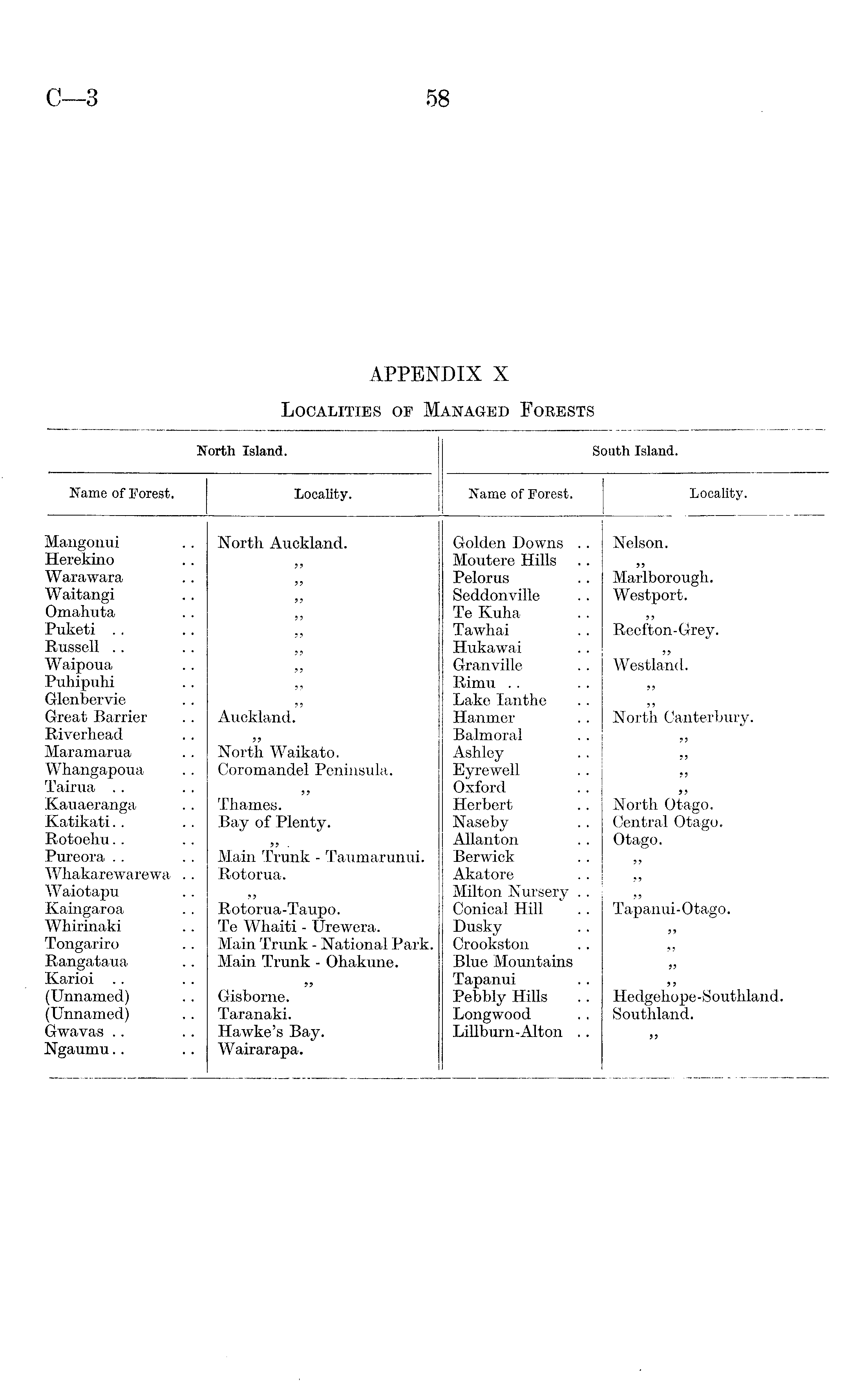 North Island. South Island. Name of Forest. Locality. Name of Forest. Locality. Mangonui North Auckland. Golden Downs . . Nelson. Herekino j j Moutere Hills Warawara 99 Pelorus Marlborough. Waitangi 99 Seddonville Westport. Omahuta 99 Te Kuha Puketi 99 Tawhai Reefton-Grey. Russell 99 Hukawai Waipoua 99 Granville Westland. Puhipuhi 99 Rimu ,, Glenbervie 99 Lake Ianthe Great Barrier Auckland. Hanmer North Canterbury. Riverhead Balmoral Maramarua North Waikato. Ashley 99 Whangapoua Coromandel Peninsula. Eyrewell „ Tairua Oxford 99 Kauaeranga Thames. Herbert North Otago. Katikati Bay of Plenty. Naseby Central Otago. Rotoehu.. Allanton Otago. Pureora .. Main Trunk - Taumarunui. Berwick 5J Whakarewarewa .. Rotorua. Akatore Waiotapu „ Milton Nursery .. Kaingaroa Rotorua-Taupo. Conical Hill Tapanui-Otago. Whirinaki Te Whaiti - Urewera. Dusky 99 Tongariro Main Trunk - National Park. Crookston 99 Rangataua Main Trunk - Ohakune. Blue Mountains 99 Karioi „ Tapanui (Unnamed) Gisborne. Pebbly Hills .. Hedgehope-Southland. (Unnamed) Taranaki. Longwood Southland. Gwavas .. Hawke's Bay. Lillburn-Alton .. Ngaumu Wairarapa.