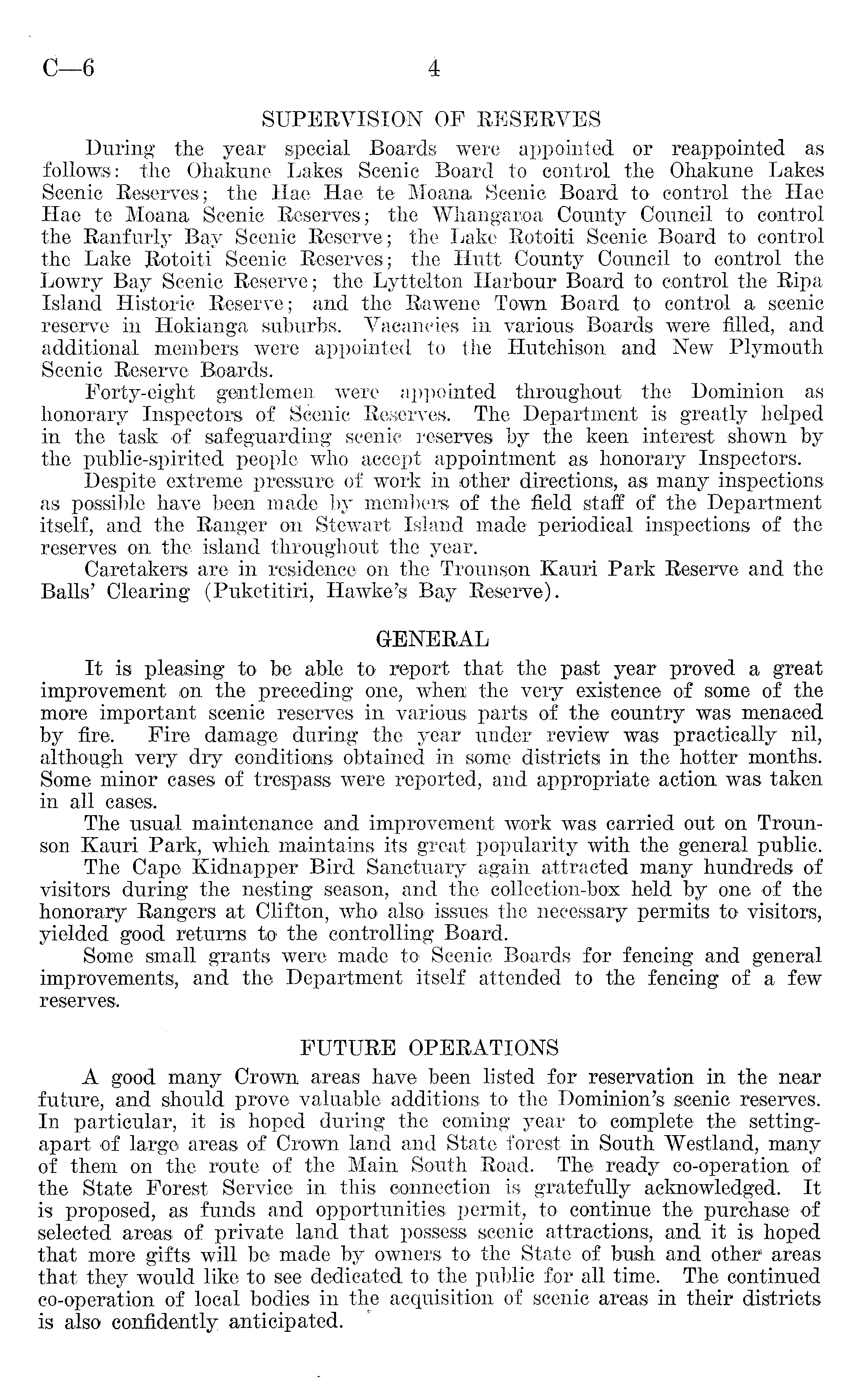 SUPERVISION OF RESERVES During the year special Boards were appointed or reappointed as follows: the Ohakune Lakes Scenic Board to control the Ohakune Lakes Scenic Reserves; the Hae Hae te Moana Scenic Board to control the Hae Hae te Moana Scenic Reserves; the Whangaroa County Council to control the Ranfurly Bay Scenic Reserve; the Lake Rotoiti Scenic Board to control the Lake Rotoiti Scenic Reserves; the Hutt County Council to control the Lowry Bay Scenic Reserve; the Lyttelton Harbour Board to control the Ripa Island Historic Reserve; and the Rawene To-wn Board to control a scenic reserve in Hokianga suburbs. Vacancies in various Boards were filled, and additional members were appointed to the Hutchison and New Plymouth Scenic Reserve Boards. Forty-eight gentlemen were appointed throughout the Dominion as honorary Inspectors of Scenic Reserves. The Department is greatly helped in the task of safeguarding scenic reserves by the keen interest shown by the public-spirited people who accept appointment as honorary Inspectors. Despite extreme pressure of work in other directions, as many inspections as possible have been made by members of the field staff of the Department itself, and the Ranger on Stewart Island made periodical inspections of the reserves on the island throughout the year. Caretakers are in residence on the Trounson Kauri Park Reserve and the Balls' Clearing (Puketitiri, Hawke's Bay Reserve). GENERAL It is pleasing to be able to report that the past year proved a great improvement on the preceding one, when the very existence of some of the more important scenic reserves in various parts of the country was menaced by fire. Fire damage during the year under review was practically nil, although very dry conditions obtained in some districts in the hotter months. Some minor cases of trespass were reported, and appropriate action was taken in all cases. The usual maintenance and improvement work was carried out on Trounson Kauri Park, which maintains its great popularity with the general public. The Cape Kidnapper Bird Sanctuary again attracted many hundreds: of visitors during the nesting season, and the collection-box held by one of the honorary Rangers at Clifton, who also issues the necessary permits to visitors, yielded good returns to the controlling Board. Some small grants were made to Scenic Boards for fencing and general improvements, and the Department itself attended to the fencing of a few reserves. FUTURE OPERATIONS A good many Crown areas have been listed for reservation in the near future, and should prove valuable additions to the Dominion's scenic reserves. In particular, it is hoped during the coming year to complete the settingapart of large areas of Crown land and State forest in South Westland, many of them on the route of the Main South Road. The ready co-operation of the State Forest Service in this connection is gratefully acknowledged. It is proposed, as funds and opportunities permit, to continue the purchase of selected areas of private land that possess scenic attractions, and it is hoped that more gifts will be made by owners to the State of bush and other areas that they would like to see dedicated to the public for all time. The continued co-operation of local bodies in the acquisition of scenic areas in their districts is also confidently anticipated.