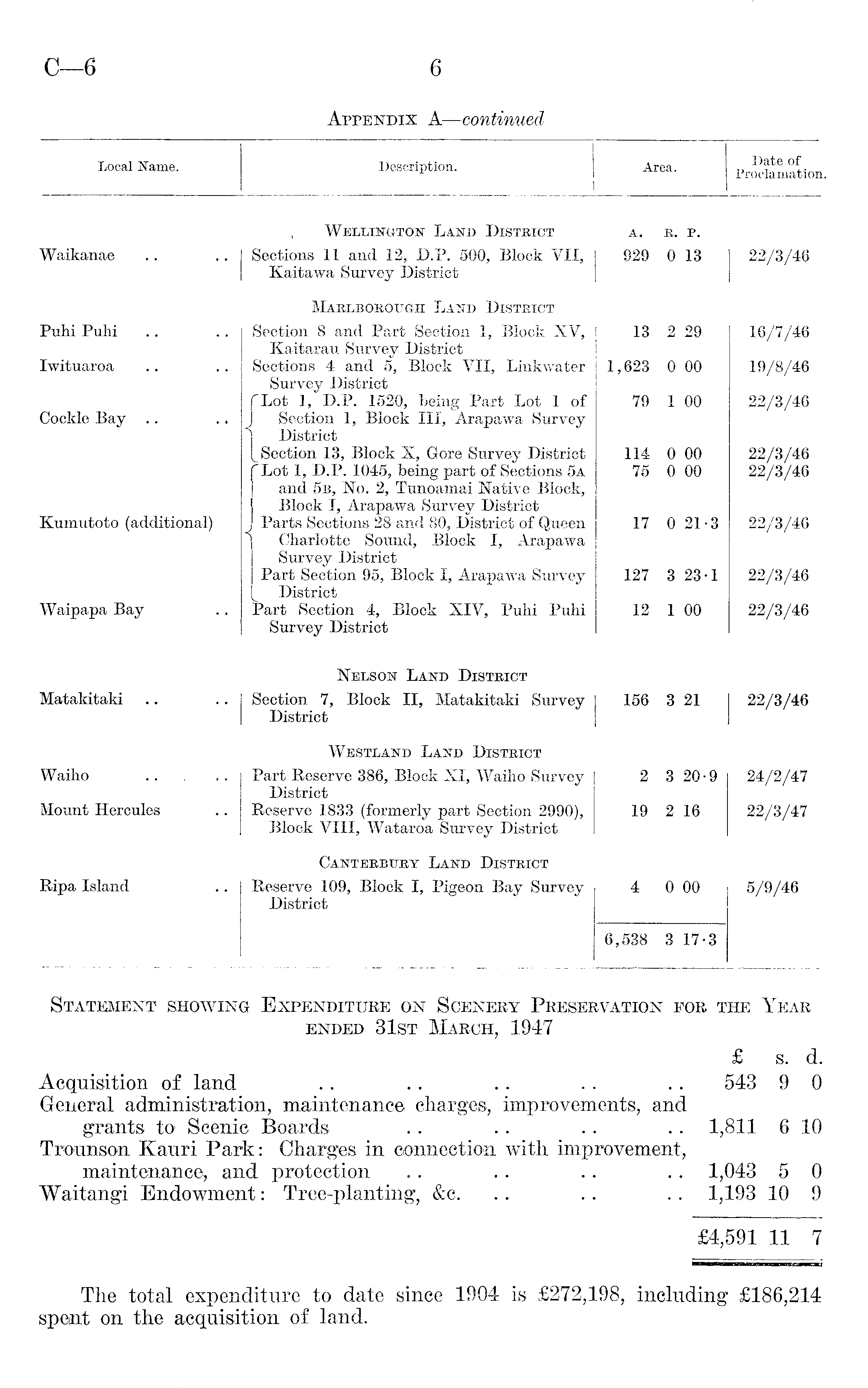 Statement showing Expenditure on Scenery Preservation for the Year ended 31st March, 1947 £ s. d. Acquisition of land .. .. .. .. .. 543 9 0 G-eneral administration, maintenance charges, improvements, and grants to Scenic Boards .. .. .. .. 1,811 610 Trounson Kauri Park: Charges in connection with improvement, maintenance, and protection . . .. .. .. 1,043 5 0 Waitangi Endowment : Tree-planting, &c. .. .. 1,193 10 9 £4,591 11 7 The total expenditure to date since 1904 is £272,198, including £186,214 spent on the acquisition of land.