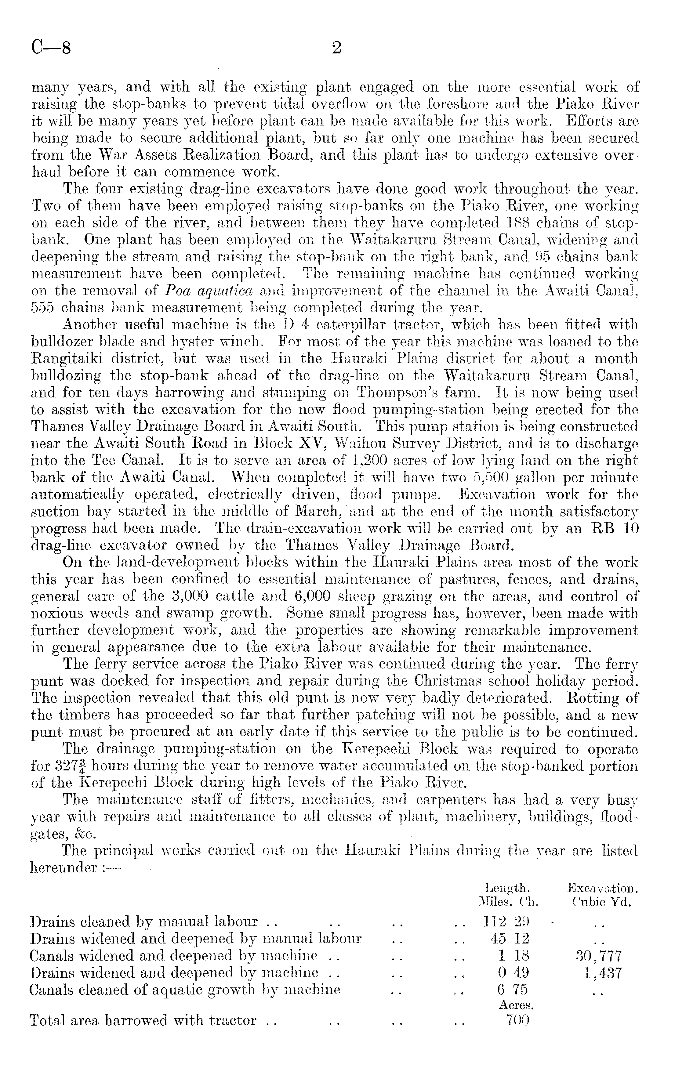 many years, and with all the existing plant engaged on the more essential work of raising the stop-banks to prevent tidal overflow on the foreshore and the Piako River it will be many years yet before plant can be made available for this work. Efforts are being made to secure additional plant, but so far only one machine has been secured from the War Assets Realization Board, and this plant has to undergo extensive overhaul before it can commence work. The four existing drag-line excavators have done good work throughout the year. Two of them have been employed raising stop-banks on the Piako River, one working on each side of the river, and between them they have completed 188 chains of stopbank. One plant has been employed on the Waitakaruru Stream Canal, widening and deepening the stream and raising the stop-bank on the right bank, and 95 chains bank measurement have been completed. The remaining machine has continued working on the removal of Poa aquatica and improvement of the channel in the Awaiti Canal, 555 chains bank measurement being completed during the year. Another useful machine is the D 4 caterpillar tractor, which has been fitted with bulldozer blade and hyster winch. For most of the year this machine was loaned to the Rangitaiki district, but was used in the Hauraki Plains district for about a month bulldozing the stop-bank ahead of the drag-line on the Waitakaruru Stream Canal, and for ten days harrowing and stumping on Thompson's farm. It is now being used to assist with the excavation for the new flood pumping-station being erected for the Thames Valley Drainage Board in Awaiti South. This pump station is being constructed near the Awaiti South Road in Block XV, Waihou Survey District, and is to discharge into the Tee Canal. It is to serve an area of 1,200 acres of low lying land on the right bank of the Awaiti Canal. When completed it will have two 5,500 gallon per minute automatically operated, electrically driven, flood pumps. Excavation work for the suction bay started in the middle of March, and at the end of the month satisfactory progress had been made. The drain-excavation work will be carried out by an RB 10 drag-line excavator owned by the Thames Valley Drainage Board. On the land-development blocks within the Hauraki Plains area most of the work this year has been confined to essential maintenance of pastures, fences, and drains, general care of the 3,000 cattle and 6,000 sheep grazing on the areas, and control of noxious weeds and swamp growth. Some small progress has, however, been made with further development work, and the properties are showing remarkable improvement in general appearance due to the extra labour available for their maintenance. The ferry service across the Piako River was continued during the year. The ferry punt was docked for inspection and repair during the Christmas school holiday period. The inspection revealed that this old punt is now very badly deteriorated. Rotting of the timbers has proceeded so far that further patching will not be possible, and a new punt must be procured at an early date if this service to the public is to be continued. The drainage pumping-station on the Kerepeehi Block was required to operate for 327£ hours during the year to remove water accumulated on the stop-banked portion of the Kerepeehi Block during high levels of the Piako River. The maintenance staff of fitters, mechanics, and carpenters has had a very busy year with repairs and maintenance to all classes of plant, machinery, buildings, floodgates, &c. The principal works carried out on the Hauraki Plains during the year are listed hereunder : Length. Excavation. Miles. Ch. Cubic Yd. Drains cleaned by manual labour .. .. .. 112 29 Drains widened and deepened by manual labour .. .. 45 12 Canals widened and deepened by machine .. .. .. 118 30,777 Drains widened and deepened by machine .. .. .. 0 49 1,437 Canals cleaned of aquatic growth by machine .. .. 6 75 Acres. Total area harrowed with tractor .. .. .. .. 700
