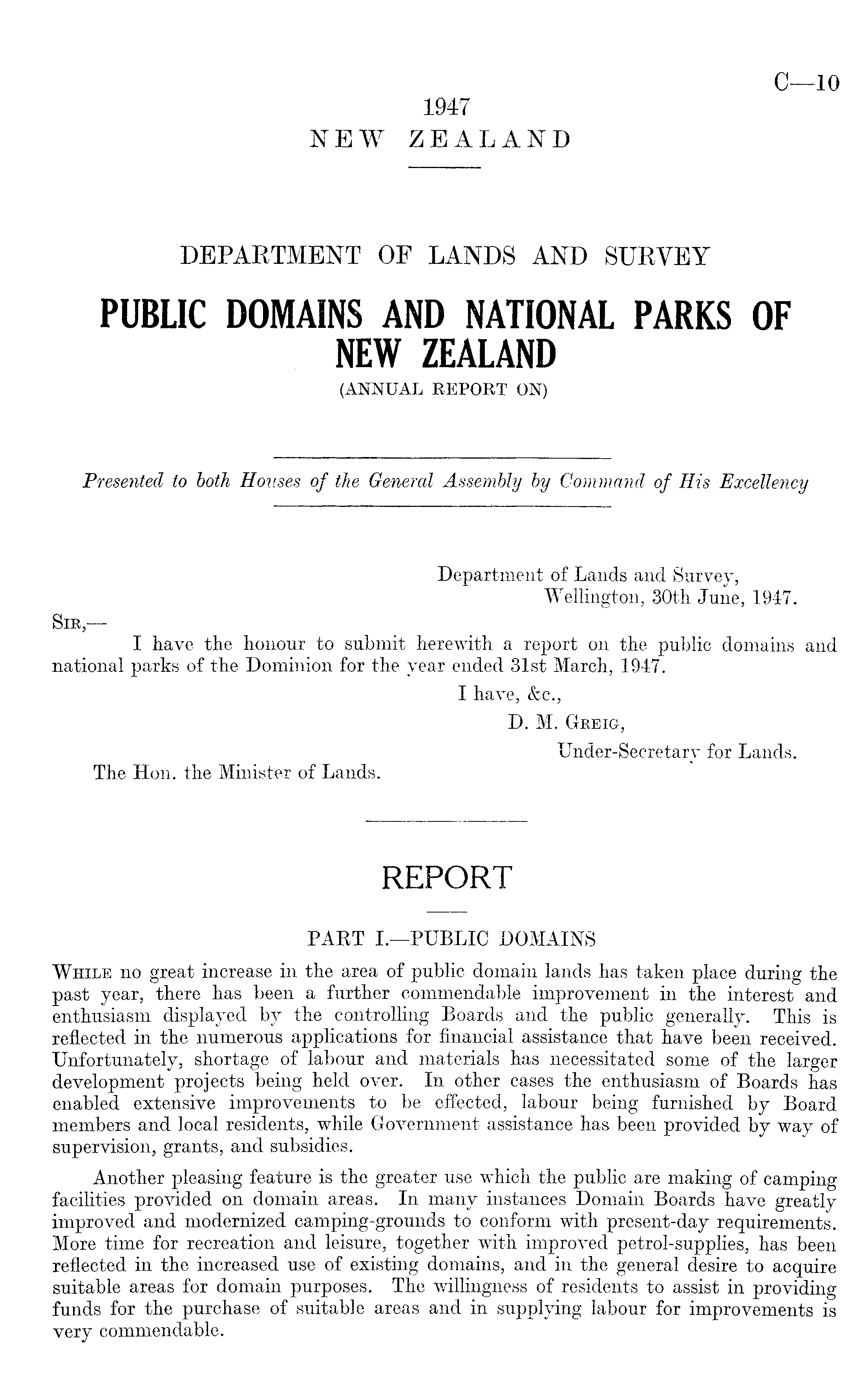 Department of Lands and Survey, Wellington, 30th June, 1947. Sir, — I have the honour to submit herewith a report on the public domains and national parks of the Dominion for the year ended 31st March, 1947. I have, &c., D. M. GrREiG, Under-Secretary for Lands. The Hon. the Minister of Lands.