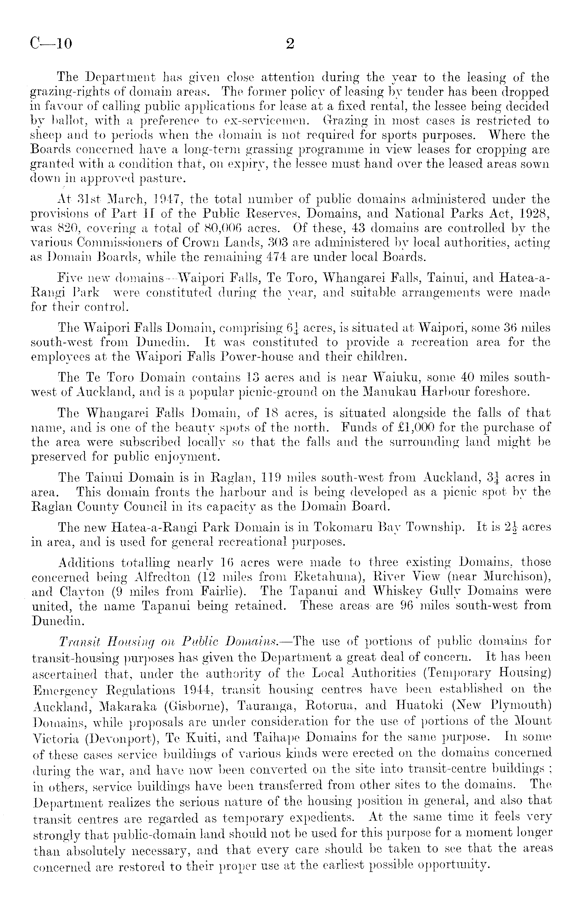 The Department has given close attention during the year to the leasing of the grazing-rights of domain areas. The former policy of leasing by tender has been dropped in favour of calling public applications for lease at a fixed rental, the lessee being decided by ballot, with a preference to ex-servicemen. Grazing in most cases is restricted to sheep and to periods when the domain is not required for sports purposes. Where the Boards concerned have a long-term grassing programme in view leases for cropping are granted with a condition that, on expiry, the lessee must hand over the leased areas sown down in approved pasture. At 31st March, 1947, the total number of public domains administered under the provisions of Part II of the Public Reserves, Domains, and National Parks Act, 1928, was 820, covering a total of 80,006 acres. Of these, 43 domains are controlled by the various Commissioners of Crown Lands, 303 are administered by local authorities, acting as Domain Boards, while the remaining 474 are under local Boards. Five new domains —Waipori Falls, Te Toro, Whangarei Falls, Tainui, and Hatea-a-Rangi Park —were constituted during the year, and suitable arrangements were made for their control. The Waipori Falls Domain, comprising 6J acres, is situated at Waipori, some 36 miles south-west from Dunedin. It was constituted to provide a recreation area for the employees at the Waipori Falls Power-house and their children. The Te Toro Domain contains 13 acres and is near Waiuku, some 40 miles southwest of Auckland, and is a popular picnic-ground on the Manukau Harbour foreshore. The Whangarei Falls Domain, of 18 acres, is situated alongside the falls of that name, and is one of the beauty spots of the north. Funds of £l,OOO for the purchase of the area were subscribed locally so that the falls and the surrounding land might be preserved for public enjoyment. The Tainui Domain is in Raglan, 119 miles south-west from Auckland, 3J acres in area. This domain fronts the harbour and is being developed as a picnic spot by the Raglan County Council in its capacity as the Domain Board. The new Hatea-a-Rangi Park Domain is in Tokomaru Bay Township. It is 2| acres in area, and is used for general recreational purposes. Additions totalling nearly 16 acres were made to three existing Domains, those concerned being Alfredton (12 miles from Eketahuna), River View (near Murchison), and Clayton (9 miles from Fairlie). The Tapanui and Whiskey Gully Domains were united, the name Tapanui being retained. These areas are 96 miles south-west from Dunedin. Transit Housing on Public Domains. —The use of portions of public domains for transit-housing purposes has given the Department a great deal of concern. It has been ascertained that, under the authority of the Local Authorities (Temporary Housing) Emergency Regulations 1944, transit housing centres have been established on the Auckland, Makaraka (Gisborne), Tauranga, Rotorua, and Huatoki (New Plymouth) Domains, while proposals are under consideration for the use of portions of the Mount Victoria (Devonport), Te Kuiti, and Taihape Domains for the same purpose. In some of these cases service buildings of various kinds were erected on the domains concerned during the war, and have now been converted on the site into transit-centre buildings ; in others, service buildings have been transferred from other sites to the domains. The Department realizes the serious nature of the housing position in general, and also that transit centres are regarded as temporary expedients. At the same time it feels very strongly that public-domain land should not be used for this purpose for a moment longer than absolutely necessary, and that every care should be taken to see that the areas concerned are restored to their proper use at the earliest possible opportunity.