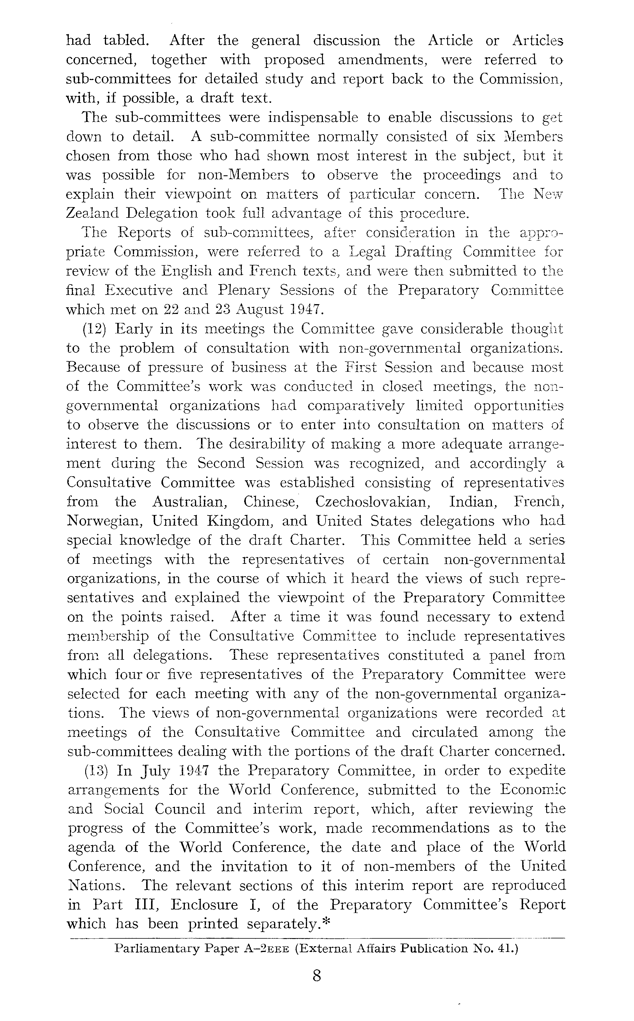 had tabled. After the general discussion the Article or Articles concerned, together with proposed amendments, were referred to sub-committees for detailed study and report back to the Commission, with, if possible, a draft text. The sub-committees were indispensable to enable discussions to get down to detail. A sub-committee normally consisted of six Members chosen from those who had shown most interest in the subject, but it was possible for non-Members to observe the proceedings and to explain their viewpoint on matters of particular concern. The New Zealand Delegation took full advantage of this procedure. The Reports of sub-committees, after consideration in the appropriate Commission, were referred to a Legal Drafting Committee for review of the English and French texts, and were then submitted to the final Executive and Plenary Sessions of the Preparatory Committee which met on 22 and 23 August 1947. (12) Early in its meetings the Committee gave considerable thought to the problem of consultation with non-governmental organizations. Because of pressure of business at the First Session,and because most of the Committee's work was conducted in closed meetings, the nongovernmental organizations had comparatively limited opportunities to observe the discussions or to enter into consultation on matters of interest to them. The desirability of making a more adequate arrangement during the Second Session was recognized, and accordingly a Consultative Committee was established consisting of representatives from the Australian, Chinese, Czechoslovakian, Indian, French, Norwegian, United Kingdom, and United States delegations who had special knowledge of the draft Charter. This Committee held a series of meetings with the representatives of certain non-governmental organizations, in the course of which it heard the views of such representatives and explained the viewpoint of the Preparatory Committee on the points raised. After a time it was found necessary to extend membership of the Consultative Committee to include representatives from all delegations. These representatives constituted a panel from which four or five representatives of the Preparatory Committee were selected for each meeting with any of the non-governmental organizations. The views of non-governmental organizations were recorded at meetings of the Consultative Committee and circulated among the sub-committees dealing with the portions of the draft Charter concerned. (13) In July 1947 the Preparatory Committee, in order to expedite arrangements for the World Conference, submitted to the Economic and Social Council and interim report, which, after reviewing the progress of the Committee's work, made recommendations as to the agenda of the World Conference, the date and place of the World Conference, and the invitation to it of non-members of the United Nations. The relevant sections of this interim report are reproduced in Part 111, Enclosure I, of the Preparatory Committee's Report which has been printed separately.*