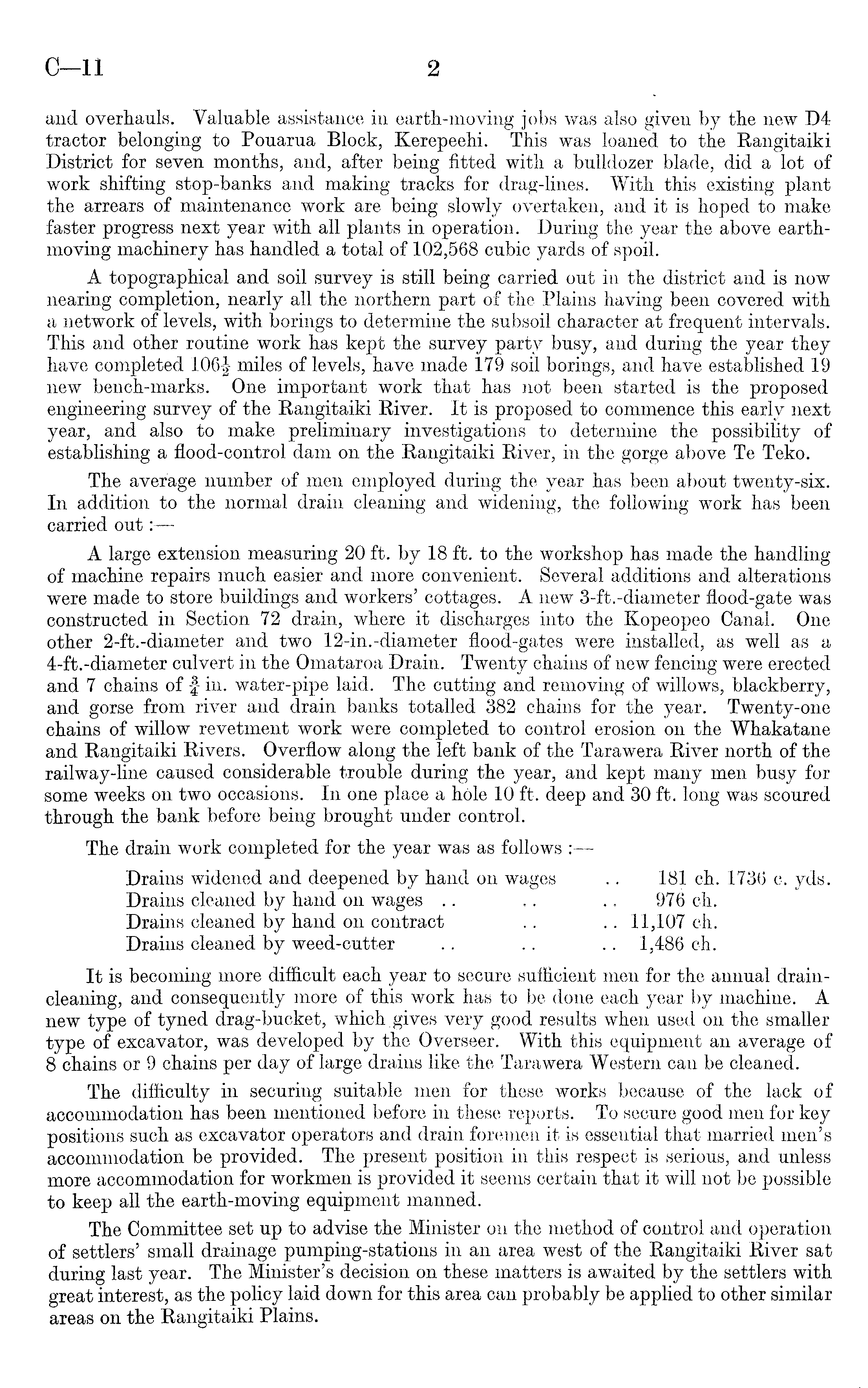 and overhauls. Valuable assistance in earth-moving jobs was also given by the new D 4 tractor belonging to Pouarua Block, Kerepeehi. This was loaned to the Rangitaiki District for seven months, and, after being fitted with a bulldozer blade, did a lot of work shifting stop-banks and making tracks for drag-lines. With this existing plant the arrears of maintenance work are being slowly overtaken, and it is hoped to make faster progress next year with all plants in operation. During the year the above earthmoving machinery has handled a total of 102,568 cubic yards of spoil. A topographical and soil survey is still being carried out in the district and is now nearing completion, nearly all the northern part of the Plains having been covered with a network of levels, with borings to determine the subsoil character at frequent intervals. This and other routine work has kept the survey party busy, and during the year they have completed miles of levels, have made 179 soil borings, and have established 19 new bench-marks. One important work that has not been started is the proposed engineering survey of the Rangitaiki River. It is proposed to commence this early next year, and also to make preliminary investigations to determine the possibility of establishing a flood-control dam on the Rangitaiki River, in the gorge above Te Teko. The average number of men employed during the year has been about twenty-six. In addition to the normal drain cleaning and widening, the following work has been carried out: — A large extension measuring 20 ft. by 18 ft. to the workshop has made the handling of machine repairs much easier and more convenient. Several additions and alterations were made to store buildings and workers' cottages. A new 3-ft.-diameter flood-gate was constructed in Section 72 drain, where it discharges into the Kopeopeo Canal. One other 2-ft.-diameter and two 12-in.-diameter flood-gates were installed, as well as a 4-ft.-diameter culvert in the Omataroa Drain. Twenty chains of new fencing were erected and 7 chains of fin. water-pipe laid. The cutting and removing of willows, blackberry, and gorse from river and drain banks totalled 382 chains for the year. Twenty-one chains of willow revetment work were completed to control erosion on the Whakatane and Rangitaiki Rivers. Overflow along the left bank of the Tarawera River north of the railway-line caused considerable trouble during the year, and kept many men busy for some weeks on two occasions. In one place a hole 10 ft. deep and 30 ft. long was scoured through the bank before being brought under control. The drain work completed for the year was as follows : Drains widened and deepened by hand on wages .. 181 ch. 1736 c. yds. Drains cleaned by hand on wages .. .. .. 976 ch. Drains cleaned by hand on contract .. .. 11,107 ch. Drains cleaned by weed-cutter .. .. .. 1,486 ch. It is becoming more difficult each year to secure sufficient men for the annual draincleaning, and consequently more of this work has to be done each year by machine. A new type of tyned drag-bucket, which, gives very good results when used on the smaller type of excavator, was developed by the Overseer. With this equipment an average of 8 chains or 9 chains per day of large drains like the Tarawera Western can be cleaned. The difficulty in securing suitable men for these works because of the lack of accommodation has been mentioned before in these reports. To secure good men for key positions such as excavator operators and drain foremen it is essential that married men's accommodation be provided. The present position in this respect is serious, and unless more accommodation for workmen is provided it seems certain that it will not be possible to keep all the earth-moving equipment manned. The Committee set up to advise the Minister on the method of control and operation of settlers' small drainage pumping-stations in an area west of the Rangitaiki River sat during last year. The Minister's decision on these matters is awaited by the settlers with great interest, as the policy laid down for this area can probably be applied to other similar areas on the Rangitaiki Plains.