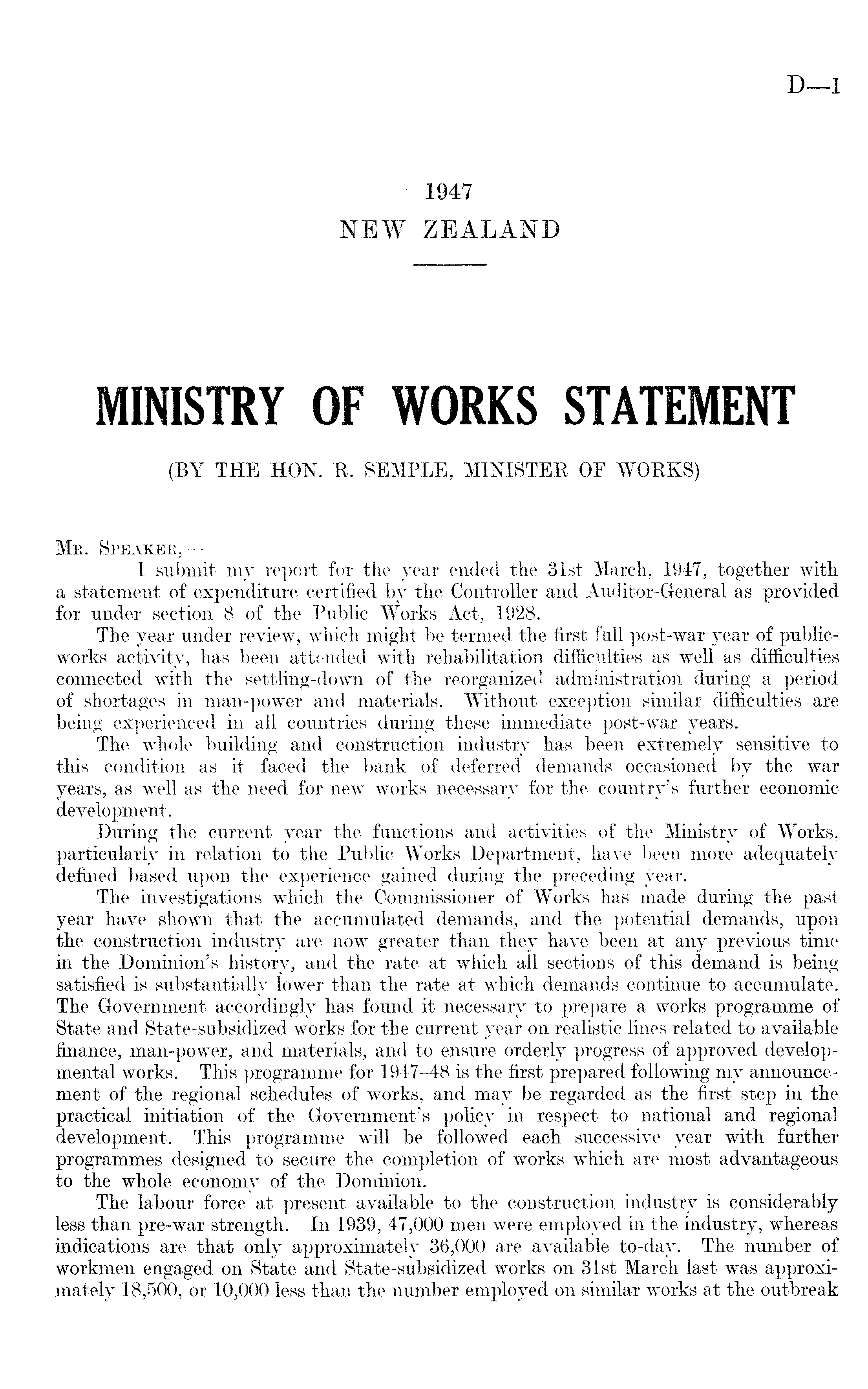 Mr. Speaker,— I submit my report for the year ended the 31st March, 1947, together with a statement of expenditure certified by the Controller and Auditor-General as provided for under section 8 of the Public Works Act, 1928. The year under review, which might be termed the first full post-war year of publicworks activity, has been attended with rehabilitation difficulties as well as difficulties connected with the settling-down of the reorganized administration during a period of shortages in man-power and materials. Without exception similar difficulties are being experienced in all countries during these immediate post-war years, The whole building and construction industry has been extremely sensitive to this condition as it faced the bank of deferred demands occasioned by the war years, as well as the need for new works necessary for the country's further economic development. During the current year the functions and activities of the Ministry of Works, particularly in relation to the Public Works Department, have been more adequately defined based upon the experience gained during the preceding year. The investigations which the Commissioner of Works has made during the past year have shown that the accumulated demands, and the potential demands, upon the construction industry are now greater than they have been at any previous time in the Dominion's history, and the rate at which all sections of this demand is being satisfied is substantially lower than the rate at which demands continue to accumulate. The Government accordingly has found it necessary to prepare a works programme of State and State-subsidized works for the current year on realistic lines related to available finance, man-power, and materials* and to ensure orderly progress of approved developmental works. This programme for 1947-48 is the first prepared following my announcement of the regional schedules of works, and may be regarded as the first step in the practical initiation of the Government's policy in respect to national and regional development. This programme will be followed each successive year with further programmes designed to secure the completion of works which are most advantageous to the, whole economy of the Dominion. The labour force at present available to the construction industry is considerably less than pre-war strength. In 1939, 47,000 men were employed in the.industry, whereas indications are that only approximately 36,000 are available to-day. The number of workmen engaged on State and State-subsidized works on 31st March last was approximately 18,500, or 10,000 less than the number employed on similar works at the outbreak