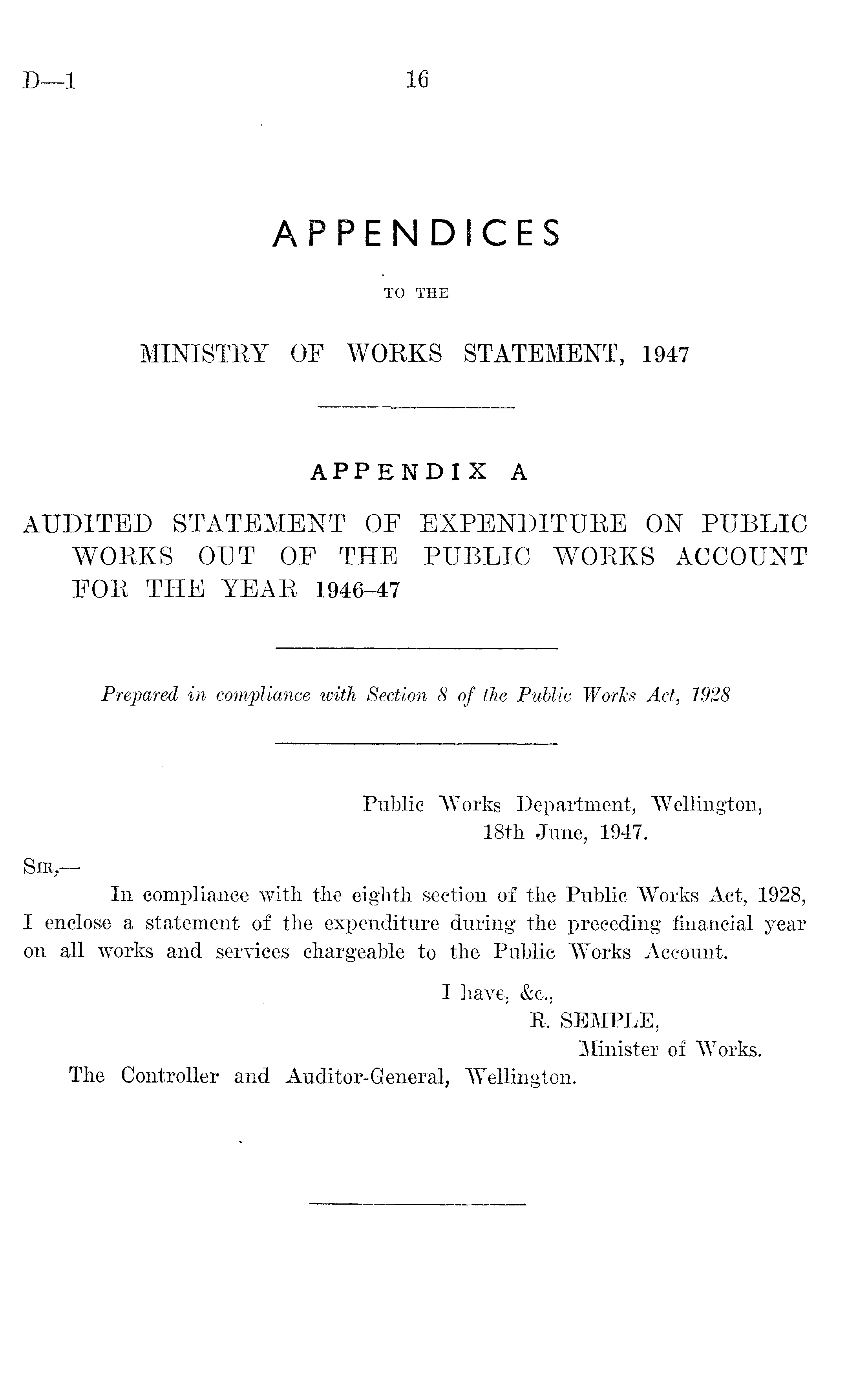 Public Works Department, Wellington, 18th June, 1947. Sir.— In compliance with the eighth section of the Public Works Act, 1928, I enclose a statement of the expenditure during the preceding financial year on all works and services chargeable to the Public Works Account. I have, &c.j R. SEMPLE. Minister oi Works. The Controller and Auditor-General, Wellington.