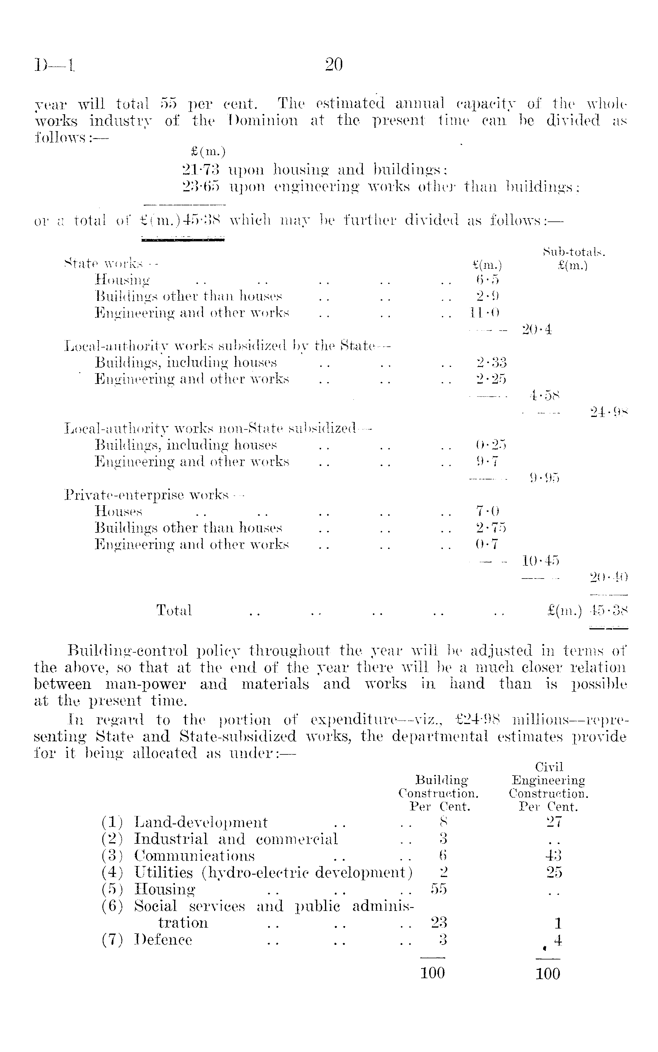 year will total 55 per cent. The estimated annual capacity of the whole works industry of the Dominion at the present time can be divided as follows: — £(m.) 21-73 upon housing and buildings; 23-65 upon engineering works other than buildings; or a. total of £(m.)45-38 which may be further divided as follows]— Sub-totals. State works — £(m.) £(m.) Housing .. .. .. .. .. 6-5 Buildings other than houses .. .. .. 2-9 Engineering and other works .. .. .. 11-0 2O-4 Local-authority works subsidized by the State —- Buildings, including houses .. .. .. 2-33 Engineering and other works .. .. .. 2-25 — 4-58 24-98 Local-authority works non-State subsidized— Buildings, including houses .. .. .. 0-25 Engineering and other works .. .. .. 9-7 9-95 Private-enterprise works — Houses .. .. .. .. .. 7-0 Buildings other than houses .. .. .. 2-75 Engineering and other works .. .. .. 0-7 lO-45 2O-40 Total .. .. .. .. .. £(m.) 45-38 Building-control policy throughout the year will be adjusted in terms of the above, so that at the end of the year there will be a much closer relation between man-power and materials and works in hand than is possible at the present time. In regard to the portion of expenditure—viz., £24-98 millions—representing State and State-subsidized works, the departmental estimates provide for it being allocated as under: — Civil Building Engineering Construction. Construction. Per Cent. Per Cent. (1) Land-development . . 8 27 (2) Industrial and commercial 3 (3) Communications . . 6 43 (4) Utilities (hydro-electric development) 2 25 (5) Housing . . .. . . 55 (6) Social services and public administration .. .. .. 23 1 (7) Defence .. .. 3 # 4 100 100