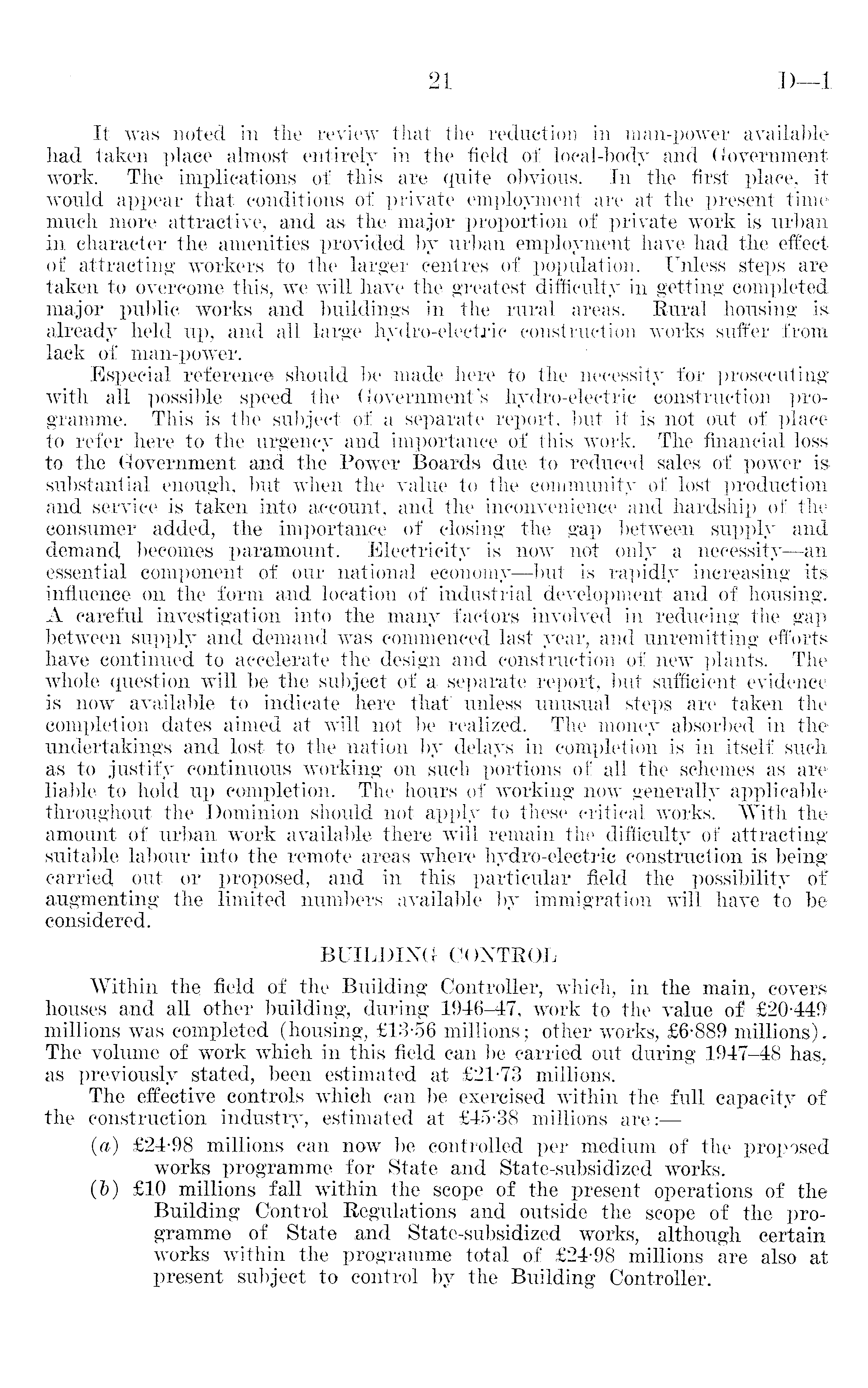 It was noted in the review that the reduction in man-power available had taken place almost entirely in the field of local-body and Government work. The implications of this are quite obvious. In the first place, it would appear that conditions of private employment are at the present time much more attractive, and as the major proportion of private work is urban in. character the amenities provided by urban employment have had the effect of attracting* workers to the larger centres of population. Unless steps are taken to overcome this, we will have the greatest difficulty in getting completed major public works and buildings in the rural areas. Rural housing is already held up, and all large hydro-electric construction works suffer from lack of man-power. Especial reference should be made here to the necessity for prosecuting with all possible speed the Government's hydro-electric construction programme. This is the subject of a separate report, but it is not out of place to refer here to the urgency and importance of this work. The financial loss to the Government and the Power Boards due to reduced sales of power is substantial enough, but when the value to the community of lost production and service is taken into account, and the inconvenience and hardship of the consumer added, the importance of closing the gap between supply and demand, becomes paramount. Electricity is now not only a necessity—an essential component of our national economy—but is rapidly increasing its influence on the form and location of industrial development and of housing, A careful investigation into the many factors involved in reducing the gap between supply and demand was commenced last year, and unremitting efforts have continued to accelerate the design and construction of new plants. The whole question will be the subject of a separate report, but sufficient evidence is now available to indicate here that unless unusual steps are taken the completion dates aimed at will not be realized. The money absorbed in the undertakings and lost to the nation by delays in completion is in itself such as to justify continuous working on such portions of all the schemes as are liable to hold up completion. The hours of working now generally applicable throughout the Dominion should not apply to these critical works. With the amount of urban work available there will remain the difficulty of attracting suitable labour into the remote areas where hydro-electric construction is being carried, out or proposed, and in this particular field the possibility of augmenting the limited numbers available by immigration will have to be considered. BUILDING CONTROL Within the. field of the Building Controller, which, in the main, covers houses and all other building, during 1946-47, work to the value of £2O-449 millions was completed (housing, £l3-56 millions; other works, £6-889 millions). The volume of work which in this field can be carried out during 1947-48 has. as previously stated, been estimated at £2l-73 millions. The effective controls which can be exercised within the full capacity of the construction industry, estimated at £45-38 millions are: — (a) £24-98 millions can now be controlled per medium of the proposed works programme for State and State-subsidized works. (b) £lO millions fall within the scope of the present operations of the Building Control Regulations and outside the scope of the programme of State and State-subsidized works, although certain works within the programme total of £24-98 millions are also at present subject to control by the Building Controller.