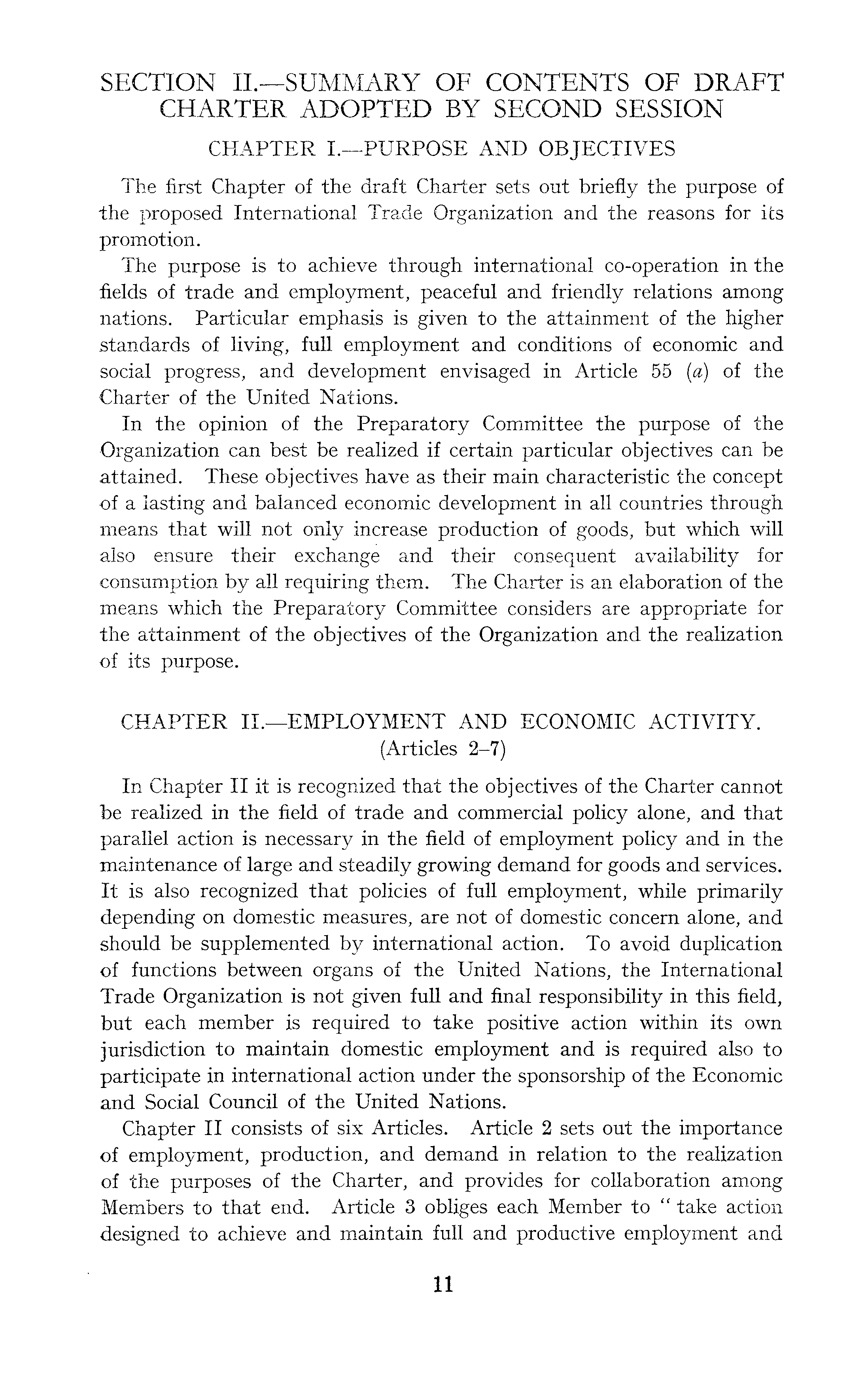 SECTION lI.—SUMMARY OF CONTENTS OF DRAFT CHARTER ADOPTED BY SECOND SESSION CHAPTER I.—PURPOSE AND OBJECTIVES The first Chapter of the draft Charter sets out briefly the purpose of the proposed International Trade Organization and the reasons for its promotion. The purpose is to achieve through international co-operation in the fields of trade and employment, peaceful and friendly relations among nations. Particular emphasis is given to the attainment of the higher standards of living, full employment and conditions of economic and social progress, and development envisaged in Article 55 (a) of the Charter of the United Nations. In the opinion of the Preparatory Committee the purpose of the Organization can best be realized if certain particular objectives can be attained. These objectives have as their main characteristic the concept of a lasting and balanced economic development in all countries through means that will not only increase production of goods, but which will also ensure their exchange and their consequent availability for consumption by all requiring them. The Charter is an elaboration of the means which the Preparatory Committee considers are appropriate for the attainment of the objectives of the Organization and the realization of its purpose. CHAPTER lI.—EMPLOYMENT AND ECONOMIC ACTIVITY. (Articles 2-7) In Chapter II it is recognized that the objectives of the Charter cannot be realized in the field of trade and commercial policy alone, and that parallel action is necessary in the field of employment policy and in the maintenance of large and steadily growing demand for goods and services. It is also recognized that policies of full employment, while primarily depending on domestic measures, are not of domestic concern alone, and should be supplemented by international action. To avoid duplication of functions between organs of the United Nations, the International Trade Organization is not given full and final responsibility in this field, but each member is required to take positive action within its own jurisdiction to maintain domestic employment and is required also to participate in international action under the sponsorship of the Economic and Social Council of the United Nations. Chapter II consists of six Articles. Article 2 sets out the importance of employment, production, and demand in relation to the realization of the purposes of the Charter, and provides for collaboration among Members to that end. Article 3 obliges each Member to " take action designed to achieve and maintain full and productive employment and