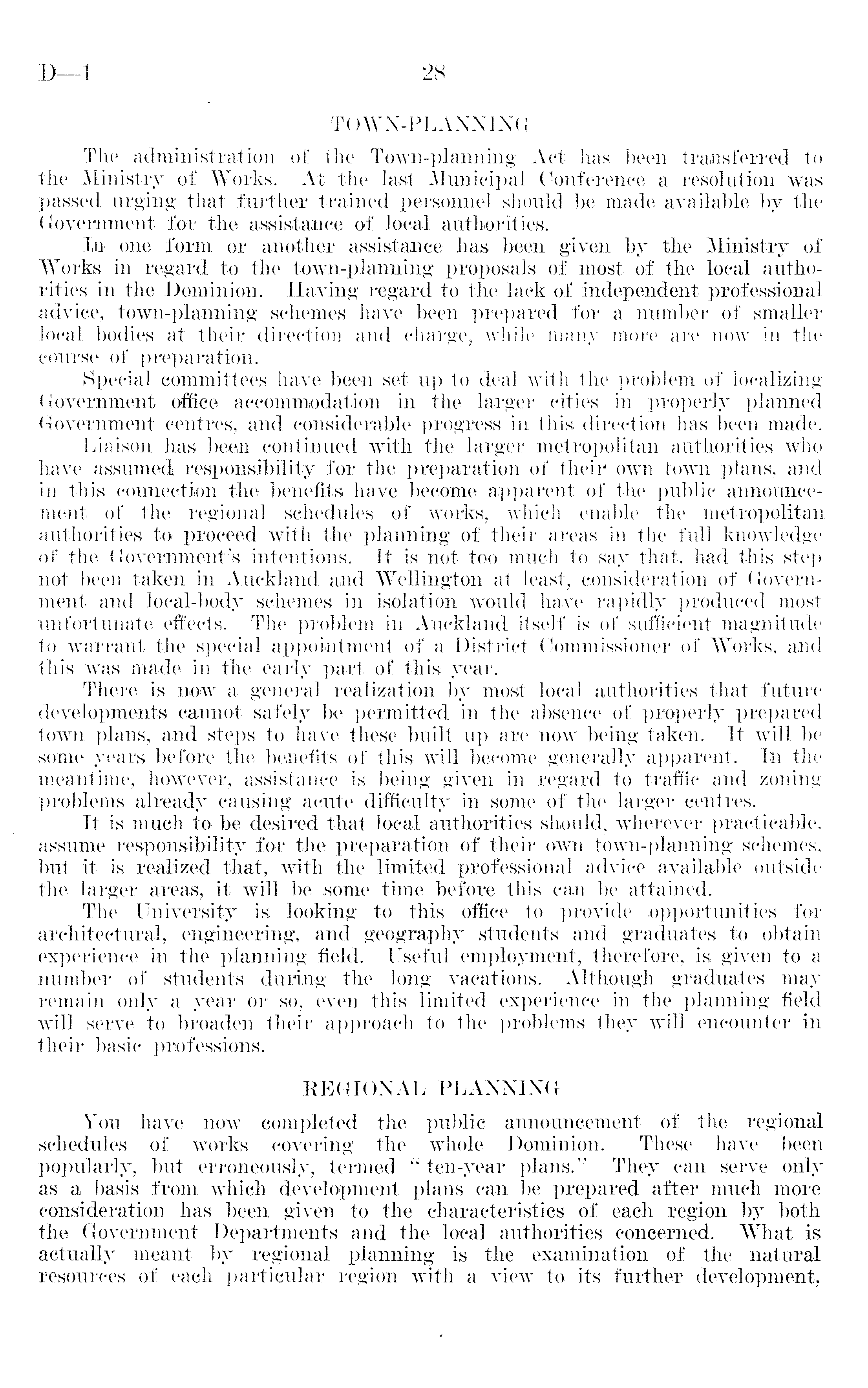 TOWN-PLANNING The administration of the Town-planning Act has been transferred to the Ministry of Works. At the last Municipal Conference a resolution was passed urging that further trained personnel should be made available by the •Government for the assistance of local authorities. In one form or another assistance has been given by the Ministry of Works in regard to the town-planning proposals of most of the local authorities in the Dominion. Having regard to the lack of independent professional advice, town-planning schemes have been prepared for a number of smaller local bodies at their direction and charge, while many more are now in the course of preparation. Special committees have been set up to deal with the problem of localizing Government office accommodation in the larger cities in properly planned Government centres, and considerable progress in this direction has been made. Liaison has been continued with the larger metropolitan authorities who have assumed responsibility for the preparation of their own town plans, and in this connection the benefits have become apparent of the public announcement of the regional schedules of works, which, enable the metropolitan authorities to proceed with the planning of their areas in the full knowledge of the Government's intentions. It is not too much to say that, had this step not been taken in Auckland and Wellington at least, consideration of Government and local-body schemes in isolation would have rapidly produced most unfortunate effects. The problem in Auckland itself is of sufficient magnitude to warrant the special appointment of a District Commissioner, of Works, and this was made in the early part of this year. There is now a general realization by most local authorities that future developments cannot safely be permitted in the absence of properly prepared town plans, and steps to have these built up are now being taken. It will be some years before the benefits of this will become generally apparent. Eh. the meantime, however, assistance is being given in regard to traffic and zoning problems already causing acute difficulty in some of the larger centres. It is much to be desired that local authorities should, wherever practicable, assume responsibility for the preparation of their own town-planning schemes, but it is realized that, with the limited professional advice available outside the larger areas, it will be some time before this can be attained. The University is looking to this office to provide opportunities for architectural, engineering, and geography students and graduates to obtain experience in the planning field. Useful employment, therefore, is given to a number of students during the long vacations. Although graduates may remain only a year or so, even this limited experience in the planning field will serve to broaden their approach to the problems they will encounter in their basic professions. REGIONAL PLANNING You have now completed the public announcement of the regional schedules of . works covering the whole Dominion. These have been popularly, but erroneously, termed " ten-year plans." They can serve only as a basis from which development plans can be prepared after much more consideration has been given to the characteristics of each region by both the Government Departments and the local authorities concerned. What is actually meant by regional planning is the examination of the natural resources of each particular region with a view to its further development,