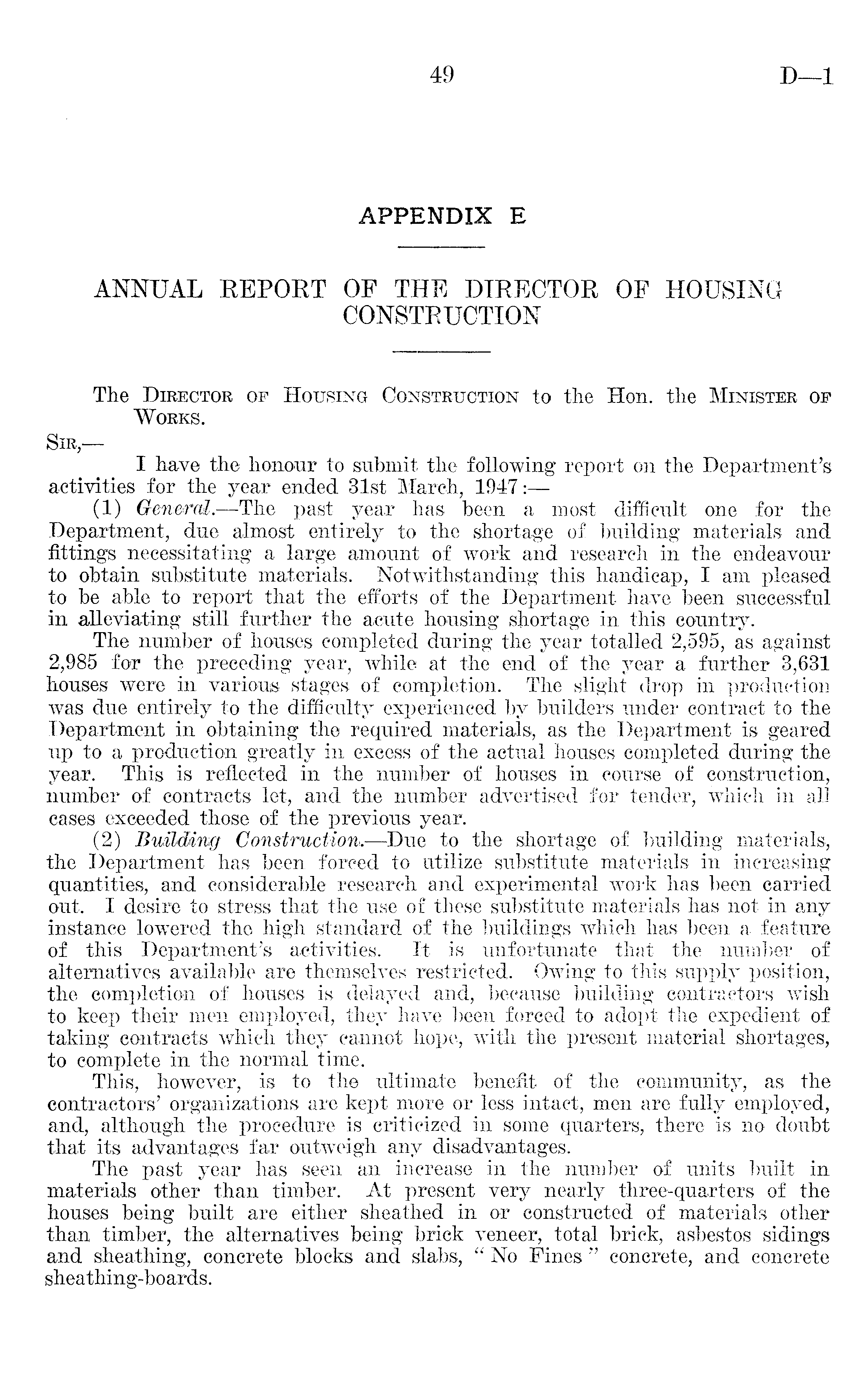 APPENDIX E ANNUAL REPORT OF THE DIRECTOR OF HOUSING CONSTRUCTION The Director of Housing Construction to the Hon. the Minister of Works. Sir, — I have the honour to submit- the following report on the Department's activities for the year ended 31st March, 1947: (1) General. —The past year has been a most difficult one for the Department, due almost entirely to the shortage of building materials and fittings necessitating a large amount of work and research in the endeavour to obtain substitute materials. Notwithstanding this handicap, I am pleased to be able to report that the efforts of the Department have been successful in alleviating still further the acute housing shortage in this country. The number of houses completed during the year totalled 2,595, as against 2,985 for the preceding year, while at the end of the year a further 3,631 houses were in various stages of completion. The slight drop in production was due entirely to the difficulty experienced by builders under contract to the Department in obtaining the required materials, as the Department is geared up to a production greatly in excess of the actual houses completed during the year. This is reflected in the number of houses in course of construction, number of contracts let, and the number advertised for tender, which in all cases exceeded those of the previous year. (2) Building Construction.—Due to the shortage of building materials, the Department has been forced to utilize substitute materials in increasing quantities, and considerable research and experimental work has been carried out. I desire to stress that the use of these substitute materials has not in any instance lowered the high standard of the buildings which has been a. feature of this Department's activities. It is unfortunate that the number of alternatives available are themselves restricted. Owing to this supply position, the completion of houses is delayed and, because building contractors wish to keep their men employed, they have been forced to adopt the expedient of taking contracts which they cannot hope, with the present material shortages, to complete in the normal time. This, however, is to the ultimate benefit of the community, as the contractors' organizations are kept more or less intact, men are fully employed, and, although the procedure is criticized in some quarters, there is no doubt that its advantages far outweigh any disadvantages. The past year has seen an increase in the number of units built in materials other than timber. At present very nearly three-quarters of the houses being built are either sheathed in or constructed of materials other than timber, the alternatives being brick veneer, total brick, asbestos sidings and sheathing, concrete blocks and slabs, " No Fines " concrete, and concrete sheathing-boards.