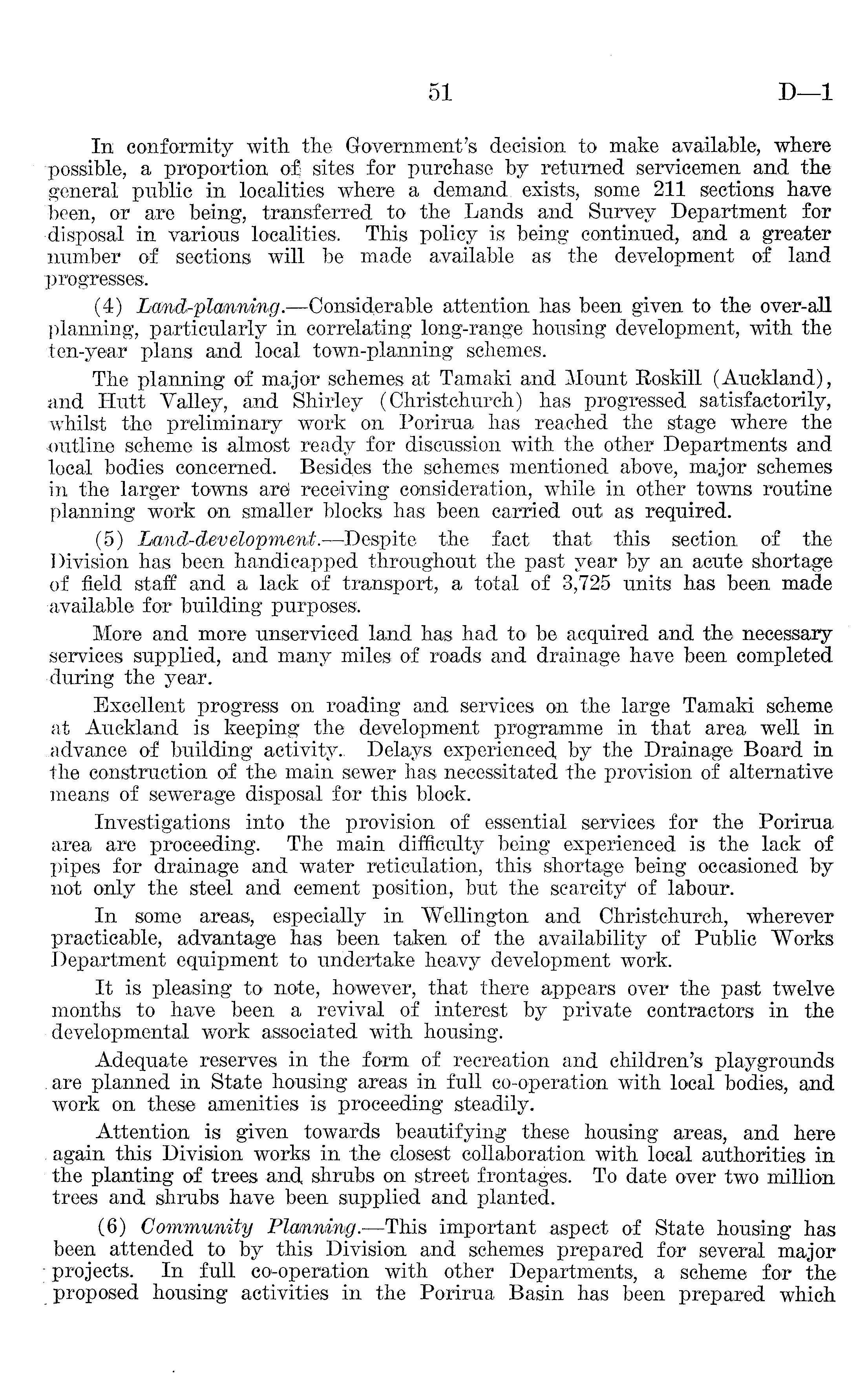 In conformity with the Government's decision to make available, where possible, a proportion of sites for purchase by returned servicemen and the general public in localities where a demand exists, some 211 sections have been, or are being, transferred to the Lands and Survey Department for disposal in various localities. This policy is being continued, and a greater number of sections will be made available as the development of land progresses. (4) Lomd-plamming.—Considerable attention has been given to the over-all planning, particularly in correlating long-range housing development, with the ten-year plans and local town-planning schemes. The planning of major schemes at Tamaki and Mount Boskill (Auckland), and Hutt Valley, and Shirley (Christchurch) has progressed satisfactorily, whilst the preliminary work on Porirua has reached the stage where the outline scheme is almost ready for discussion with the other Departments and local bodies concerned. Besides the schemes mentioned above, major schemes in the larger towns are receiving consideration, while in other towns routine planning work on smaller blocks has been carried out as required. (5) the fact that this section of the Division has been handicapped throughout the past year by an acute shortage of field staff and a lack of transport, a total of 3,725 units has been made available for building purposes. More and more unservieed land has had to be acquired and the necessary services supplied, and many miles of roads and drainage have been completed -during the year. Excellent progress on reading and services on the large Tamaki scheme at Auckland is keeping the development programme in that area well in .advance of building activity.. Delays experienced, by the Drainage Board in the construction of the main sewer has necessitated the provision of alternative means of sewerage disposal for this block. Investigations into the provision of essential services for the Porirua area are proceeding. The main difficulty being experienced is the lack of pipes for drainage and water reticulation, this shortage being occasioned by not only the steel and cement position, but the scarcity of labour. In some areas, especially in "Wellington and Christchurch, wherever practicable, advantage has been taken of the availability of Public Works Department equipment to undertake heavy development work. It is pleasing to note, however, that there appears over the past twelve months to have been a revival of interest by private contractors in the developmental work associated with housing. Adequate reserves in the form of recreation and children's playgrounds are planned in State housing areas in full co-operation with local bodies, and work on these amenities is proceeding steadily. Attention is given towards beautifying these housing areas, and here . again this Division works in the closest collaboration with local authorities in the planting of trees and, shrubs on street frontages. To date over two million trees and shrubs have been supplied and planted. (6) Community Planning.—This important aspect of State housing has been attended to by this Division and schemes prepared for several major projects. In full co-operation with other Departments, a scheme for the proposed housing activities in the Porirua Basin has been prepared which