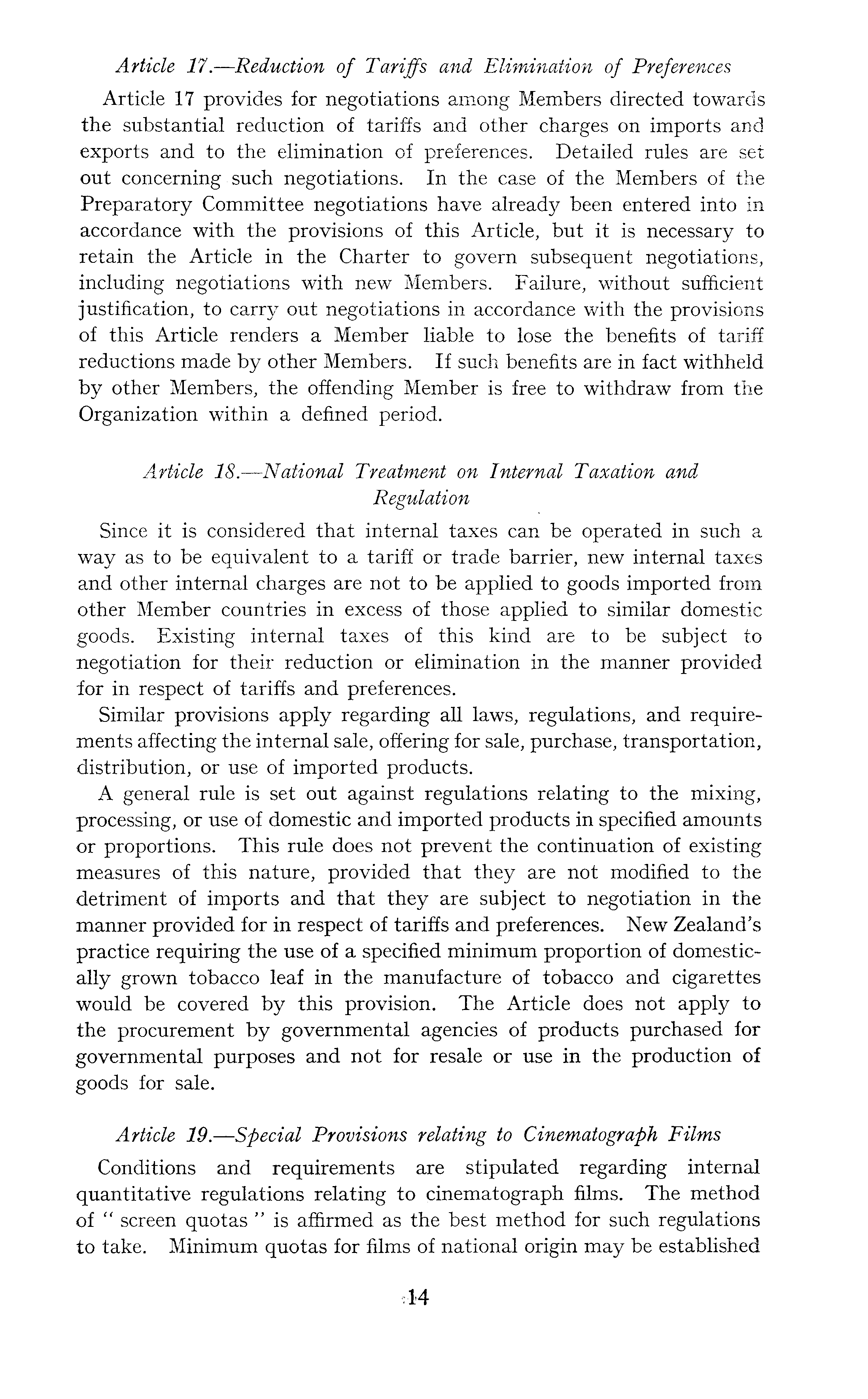 Article 17. —Reduction of Tariffs and Elimination of Preferences Article 17 provides for negotiations among Members directed towards the substantial reduction of tariffs and other charges on imports and exports and to the elimination of preferences. Detailed rules are set out concerning such negotiations. In the case of the Members of the Preparatory Committee negotiations have already been entered into in accordance with the provisions of this Article, but it is necessary to retain the Article in the Charter to govern subsequent negotiations, including negotiations with new Members. Failure, without sufficient justification, to carry out negotiations in accordance with the provisions of this Article renders a Member liable to lose the benefits of tariff reductions made by other Members. If such benefits are in fact withheld by other Members, the offending Member is free to withdraw from the Organization within a defined period. Article 18. —National Treatment on Internal Taxation and Regulation Since it is considered that internal taxes can be operated in such a way as to be equivalent to a tariff or trade barrier, new internal taxes and other internal charges are not to be applied to goods imported from other Member countries in excess of those applied to similar domestic goods. Existing internal taxes of this kind are to be subject to negotiation for their reduction or elimination in the manner provided for in respect of tariffs and preferences. Similar provisions apply regarding all laws, regulations, and requirements affecting the internal sale, offering for sale, purchase, transportation, distribution, or use of imported products. A general rule is set out against regulations relating to the mixing, processing, or use of domestic and imported products in specified amounts or proportions. This rule does not prevent the continuation of existing measures of this nature, provided that they are not modified to the detriment of imports and that they are subject to negotiation in the manner provided for in respect of tariffs and preferences. New Zealand's practice requiring the use of a specified minimum proportion of domestically grown tobacco leaf in the manufacture of tobacco and cigarettes would be covered by this provision. The Article does not apply to the procurement by governmental agencies of products purchased for governmental purposes and not for resale or use in the production of goods for sale. Article 19. —Special Provisions relating to Cinematograph Films Conditions and requirements are stipulated regarding internal quantitative regulations relating to cinematograph films. The method of " screen quotas " is affirmed as the best method for such regulations to take. Minimum quotas for films of national origin may be established