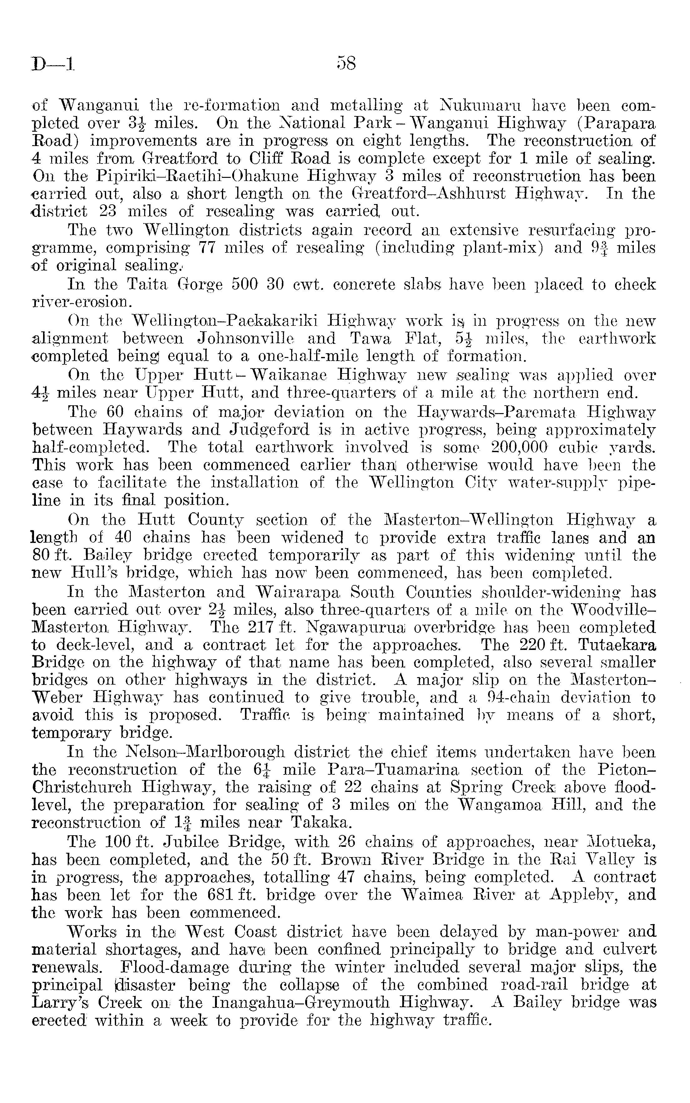 of Wan.ga.nni the re-formation and metalling at Nukumara have been completed over 3£ miles. On the National Park-Wanganui Highway (Parapara Road) improvements are in progress on eight lengths. The reconstruction of 4 miles from Greatford to Cliff Road is complete except for 1 mile of sealing. On the Pipirika-Raetihi-Ohakune Highway 3 miles of reconstruction has been carried out, also a short length on the Greatford-Ashhurst Highway. In the ■district 23 miles of resealing was carried, out. The two Wellington districts again record an extensive resurfacing programme, comprising 77 miles of resealing (including plant-mix) and 9f miles of original sealing.. In the Taita Gorge 500 30 cwt. concrete slabs have been placed to check river-erosion. On the Wellington-Paekakariki Highway work isj in progress on the new alignment between Johnsonville and Tawa Flat, 5| miles, the earthwork completed being equal to a one-half-mile length of formation. On the Upper Hutt l -Waikanae Highway new sealing was applied over 4\ miles near Upper Hutt, and three-quarters of a mile at the northern end. The 60 chains of major deviation on the Hayw ar d Sr-P ar em at a Highway between Hay wards and Judgeford is in active progress, being approximately half-completed. The total earthwork involved is some 200,000 cubic yards. This work has been commenced earlier thanj otherwise would have been the case to facilitate the installation of the Wellington City water-supply pipeline in its final position. On the Hutt County section of the Masterton-Wellington Highway a length of 40 chains has been widened to provide extra traffic lanes and an 80 ft. Bailey bridge erected temporarily as part of this widening until the new HulPs bridge, which has now been commenced, has been completed. In the Masterton and Wairarapa South Counties shoulder-widening has been carried out over 2| miles, also three-quarters of a mile on the WoodvilleMasterton Highway. The 217 ft. Ngawapuruai overbridge has been completed to deck-level, and a contract let for the approaches. The 220 ft. Tutaekara Bridge on the highway of that name has been completed, also several smaller bridges on other highways in the district. A major slip on the MastertonWeber Highway has continued to give trouble, and a 94-chain deviation to avoid this is proposed. Traffic is being' maintained by means of a short, temporary bridge. In the Nelson-Marlborough district the chief items undertaken have been the reconstruction of the 6-J mile Para-Tuamarina section of the PictonChristchurch Highway, the raising of 22 chains at Spring Creek; above floodlevel, the preparation for sealing of 3 miles on the Wangamoa Hill, and the reconstruction of If miles near Takaka. The 100 ft. Jubilee Bridge, with 26 chains of approaches, near Motueka, has been completed, and the 50 ft. Brown River Bridge in the Rai Valley is in progress, the approaches, totalling 47 chains, being completed. A contract has been let for the 681 ft. bridge over the Waimea River at Appleby, and the work has been commenced. Works in the West Coast district have been delayed by man-power and material shortages, and have been confined principally to bridge and culvert renewals. Flood-damage during the winter included several major slips, the principal (disaster being the collapse of the combined road-rail bridge at Larry's Creek on the Inangahua-Greymouth Highway. A Bailey bridge was erected within a week to provide for the highway traffic.