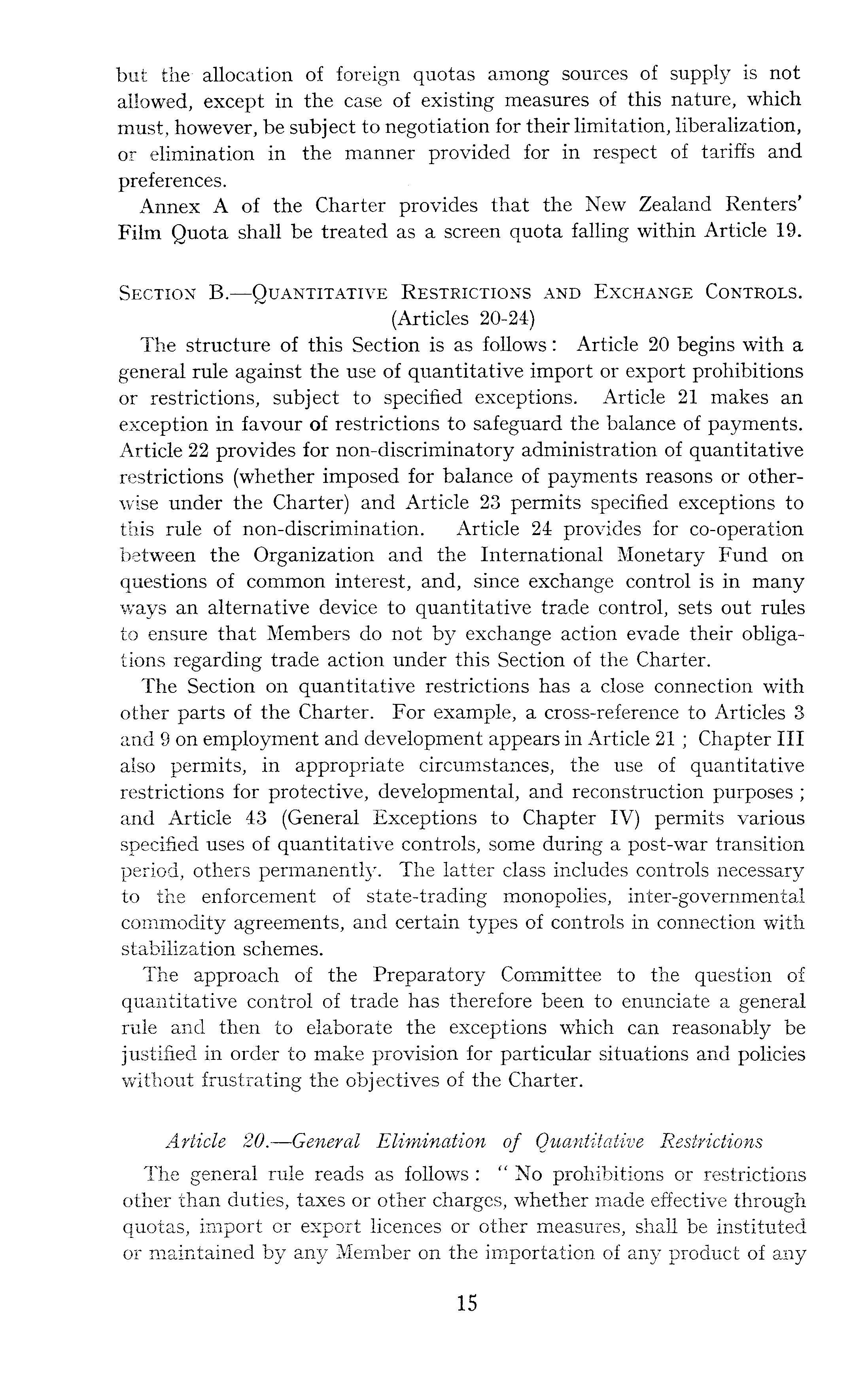 but the allocation of foreign quotas among sources of supply is not allowed, except in the case of existing measures of this nature, which must, however, be subject to negotiation for their limitation, liberalization, or elimination in the manner provided for in respect of tariffs and preferences. Annex A of the Charter provides that the New Zealand Renters' Film Quota shall be treated as a screen quota falling within Article 19. Section B. —Quantitative Restrictions and Exchange Controls. (Articles 20-24) The structure of this Section is as follows: Article 20 begins with a general rule against the use of quantitative import or export prohibitions or restrictions, subject to specified exceptions. Article 21 makes an exception in favour of restrictions to safeguard the balance of payments. Article 22 provides for non-discriminatory administration of quantitative restrictions (whether imposed for balance of payments reasons or otherwise under the Charter) and Article 23 permits specified exceptions to this rule of non-discrimination. Article 24 provides for co-operation between the Organization and the International Monetary Fund on questions of common interest, and, since exchange control is in many ways an alternative device to quantitative trade control, sets out rules to ensure that Members do not by exchange action evade their obligations regarding trade action under this Section of the Charter. The Section on quantitative restrictions has a close connection with other parts of the Charter. For example, a cross-reference to Articles 3 and 9 on employment and development appears in Article 21 ; Chapter 111 also permits, in appropriate circumstances, the use of quantitative restrictions for protective, developmental, and reconstruction purposes ; and Article 43 (General Exceptions to Chapter IV) permits various specified uses of quantitative controls, some during a post-war transition period, others permanently. The latter class includes controls necessary to the enforcement of state-trading monopolies, inter-governmental commodity agreements, and certain types of controls in connection with stabilization schemes. The approach of the Preparatory Committee to the question of quantitative control of trade has therefore been to enunciate a general rule and then to elaborate the exceptions which can reasonably be justified in order to make provision for particular situations and policies without frustrating the objectives of the Charter. Article 20. —General Elimination of Quantitative Restrictions The general rule reads as follows : "No prohibitions or restrictions other than duties, taxes or other charges, whether made effective through quotas, import or export licences or other measures, shall be instituted or maintained by any Member on the importation of any product of any