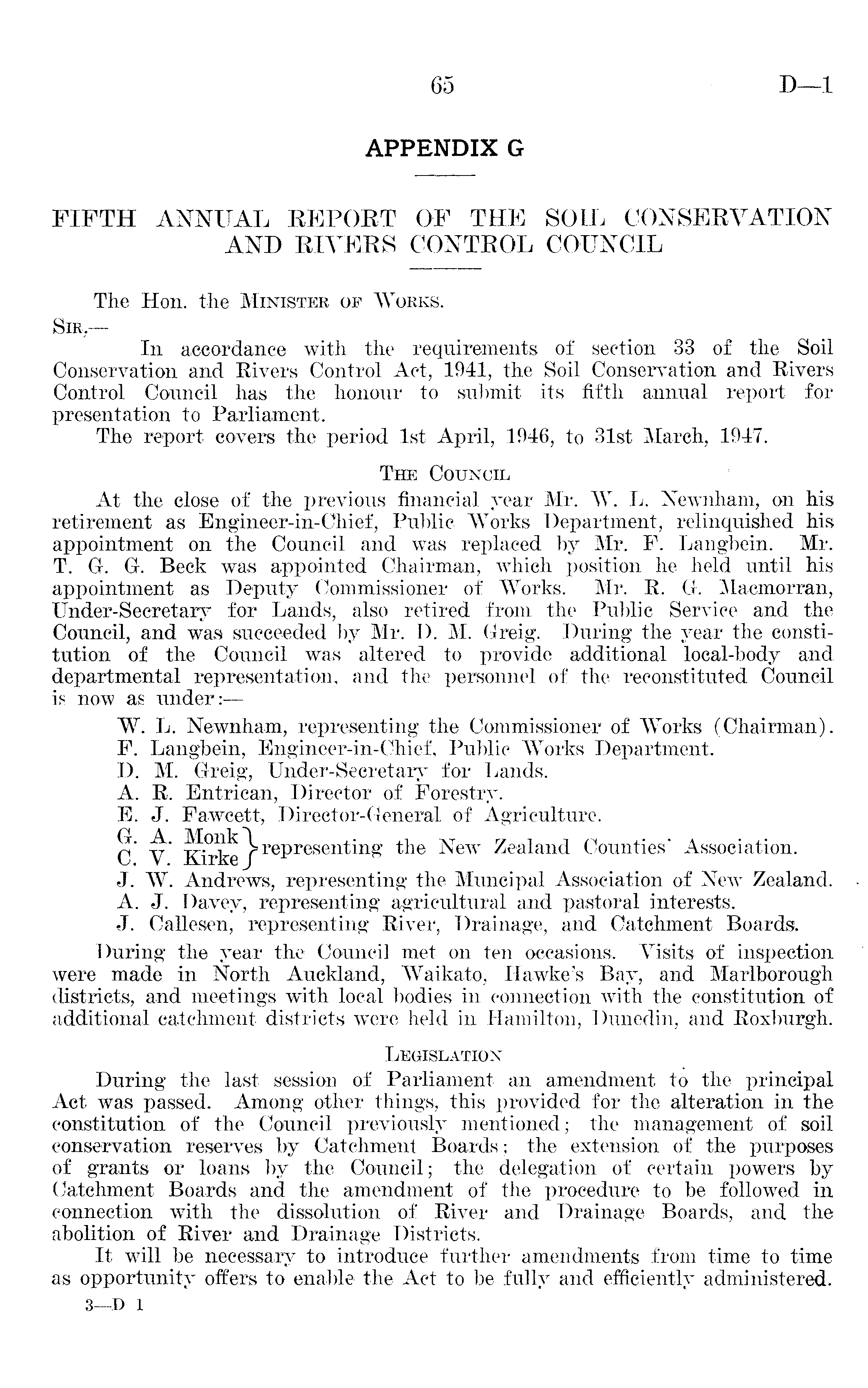 APPENDIX G FIFTH ANNUAL REPORT OF THE SOIL CONSERVATION AND RIVERS CONTROL COUNCIL The Hon. the Minister of "Works. Sir In accordance with the requirements of section 33 of the Soil Conservation and Rivers Control Act, 1941, the Soil Conservation and Rivers Control Council has the honour to submit its fifth annual report for presentation to Parliament. The report covers the period Ist April, 1946, to 31st March, 1947. The Council At the close of the previous financial year Mr. W. L. Newnham, on his retirement as Engineer-in-Chief, Public Works Department, relinquished his appointment on the Council and was replaced by Mr. F. Langbein. Mr. T. G. G. Beck was appointed Chairman, which position he held until his appointment as Deputy Commissioner of Works. Mr. R. Gr. Macmorran, Under-Secretary for Lands, also retired from the Public Service and the Council, and was succeeded by Mr. I). M. Greig. During the year the constitution of the Council was altered to provide additional local-body and departmental representation, and the personnel of the reconstituted Council is now as under:— W. L. Newnham, representing the Commissioner of Works (Chairman). F. Langbein, Engineer-in-Chief, Public Works Department. D. M. Greig, Under-Secretary for Lands. A. R. Entrican, Director of Forestry. E. J. Fawcett, Director-General of Agriculture. C V Kirke / re P reseir^n £ the New Zealand Counties' Association. J. W. Andrews, representing the Muncipal Association of New Zealand. A. J. Davey, representing agricultural and pastoral interests. J. Callesen, representing River, Drainage, and Catchment Boards. During the year the Council met on ten occasions. Visits of inspection were made in North Auckland, Waikato, Hawke's Bay, and Marlborough districts, and meetings with local bodies in connection with the constitution of additional catchment districts were held in Hamilton, Dunedin, and Roxburgh. Legislation During the last session of Parliament an amendment to the principal Act was passed. Among other things, this provided for the alteration in the constitution of the Council previously mentioned; the management of soil conservation reserves by Catchment Boards; the extension of the purposes of grants or loans by the Council; the delegation of certain powers by Catchment Boards and the amendment of the procedure to be followed in connection with the dissolution of River and Drainage Boards, and the abolition of River and Drainage Districts. It will be necessary to introduce further amendments from time to time as opportunity offers to enable the Act to be fully and efficiently administered.