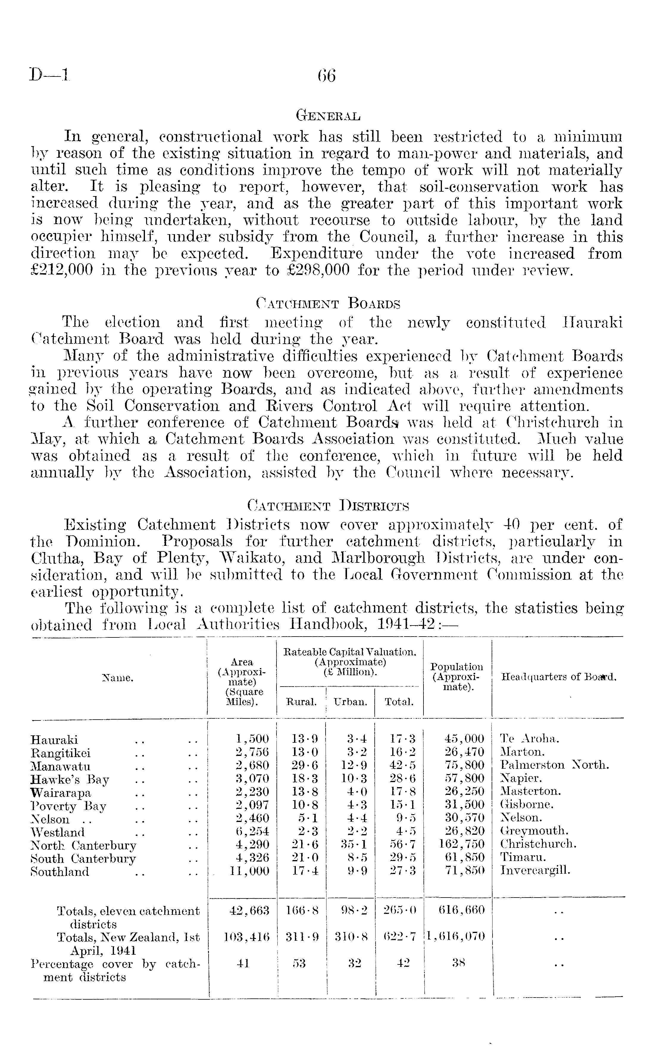 General, In general, constructional work has still been restricted to a minimum by reason.of the existing situation in regard to man-power and materials, and until such time as conditions improve the tempo of work will not materially alter. It is pleasing to report, however, that soil-conservation work has increased during the year, and as the greater part of this important work is now being undertaken, without recourse to outside labour, by the land occupier himself, under subsidy from the Council, a further increase in this direction may be expected. Expenditure under the vote increased from £212,000 in the previous year to £298,000 for the period under review. Catchment Boards The election and first meeting of the newly constituted Hauraki Catchment Board was held during the year. Many of the administrative difficulties experienced by Catchment Boards in previous years have now been overcome, but as a result of experience gained by the operating Boards, and as indicated above, further amendments to the Soil Conservation and Rivers Control Act will require attention. A. further conference of Catchment Boardsi was held at Christchurcb in May, at which a Catchment Boards Association was constituted. Much value was obtained as a result of the conference, which in future will be held annually by the Association, assisted by the Council where necessary. Catchment Districts Existing Catchment Districts now cover approximately 40 per cent, of the Dominion. Proposals for further catchment districts, particularly in Clutha, Bay of Plenty, Waikato, and Marlborough Districts, are under consideration, and will be submitted to the Local Government Commission at the earliest opportunity.