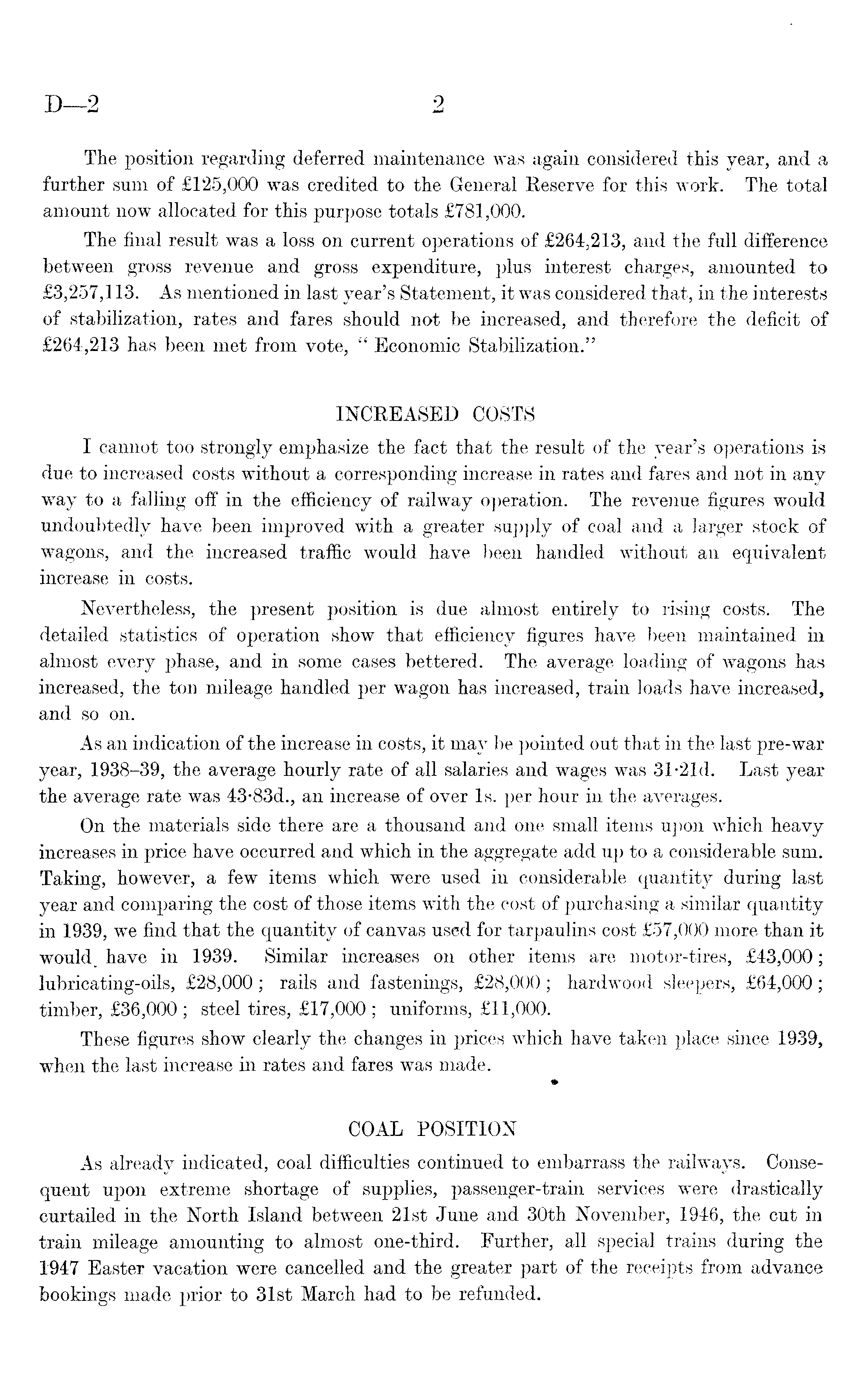 The position regarding deferred maintenance was again considered this year, and a further sum of £125,000 was credited to the General Reserve for this work. The total amount now allocated for this purpose totals £781,000. The final result was a loss on current operations of £264,213, and the full difference between gross revenue and gross expenditure, plus interest charges, amounted to £3,257,113. As mentioned in last year's Statement, it was considered that, in the interests of stabilization, rates and fares should not be increased, and therefore the deficit of £264,213 has been met from vote, " Economic Stabilization." INCREASED COSTS I cannot too strongly emphasize the fact that the result of the year's operations is due to increased costs without a corresponding increase in rates and fares and not in any way to a falling off in the efficiency of railway operation. The revenue figures would undoubtedly have been improved with a greater supply of coal and a larger stock of wagons, and the increased traffic would have been handled without an equivalent increase in costs. Nevertheless, the present position is due almost entirely to rising costs. The detailed statistics of operation show that efficiency figures have been maintained in almost every phase, and in some cases bettered. The average loading of wagons has increased, the ton mileage handled per wagon has increased, train loads have increased, and so on. As an indication of the increase in costs, it may be pointed out that in the last pre-war year, 1938-39, the average hourly rate of all salaries and wages was 31-21 d. Last year the average rate was 43-83 d., an increase of over Is. per hour in the averages. On the materials side there are a thousand and one small items upon which heavy increases in price have occurred and which in the aggregate add up to a considerable sum. Taking, however, a few items which were used in considerable quantity during last year and comparing the cost of those items with the cost of purchasing a similar quantity in 1939, we find that the quantity of canvas used for tarpaulins cost £57,000 more than it would have in 1939. Similar increases on other items are motor-tires, £43,000; lubricating-oils, £28,000; rails and fastenings, £28,000; hardwood sleepers, £64,000; timber, £36,000 ; steel tires, £17,000 ; uniforms, £ll,OOO. These figures show clearly the changes in prices which have taken place since 1939, when the last increase in rates and fares was made. ♦ COAL POSITION As already indicated, coal difficulties continued to embarrass the railways. Consequent upon extreme shortage of supplies, passenger-train services were drastically curtailed in the North Island between 21st June and 30th November, 1946, the cut in train mileage amounting to almost one-third. Further, all special trains during the 1947 Easter vacation were cancelled and the greater part of the receipts from advance bookings made prior to 31st March had to be refunded.