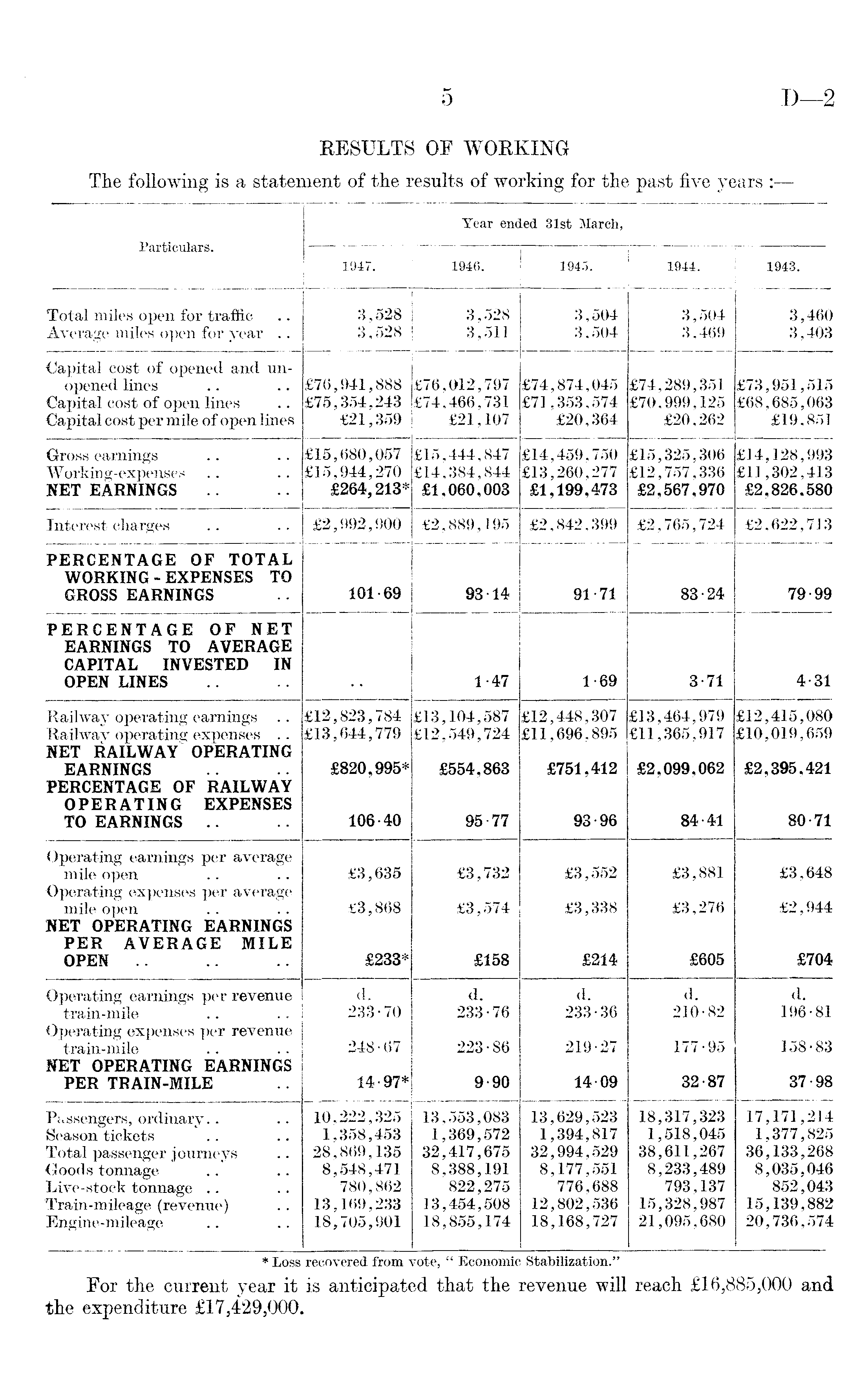 Year ended 31st March, Particulars. i 1947. 1946. 1945. 1944. 1943. Total miles open for traffic 3,528 3,528 3,504 3,504 3,460 Average miles open for year .. 3,528 3,511 3,504 3,469 3,403 Capital cost of opened and unopened lines £76,941,888 £76,012,797 £74,874,045 £74,289,351 £73,951,515 Capital cost of open lines £75,354,243 £74,466,731 £71,353,574 £70,999,125 £68,685,063 Capital cost per mile of open lines £21,359 £21,107 £20,364 £20,262 £19.851 Gross earnings £15,680,057 £15,444,847 £14,459,750 £15,325,306 £14,128,993 Working-expenses £15,944,270 £14,384,844 £13,260,277 £12,757,336 £11,302,413 NET EARNINGS £264,213* £1,060,003 £1,199,473 £2,567,970 £2,826,580 Interest charges £2,992,900 £2,889,195 £2,842,399 £2,765,724 £2,622,713 PERCENTAGE OF TOTAL WORKING - EXPENSES TO GROSS EARNINGS 101 69 93 14 91-71 83-24 79-99 PERCENTAGE OF NET EARNINGS TO AVERAGE CAPITAL INVESTED IN OPEN LINES 1-47 1-69 3-71 4-31 Railway operating earnings .. £12,823,784 £13,104,587 £12,448,307 £13,464,979 £12,415,080 Railway operating expenses .. £13,644,779 £12,549,724 £11,696,895 £11,365,917 £10,019,659 NET RAILWAY OPERATING EARNINGS £820,995* £554,863 £751,412 £2,099,062 £2,395,421 PERCENTAGE OF RAILWAY OPERATING EXPENSES TO EARNINGS 106-40 95-77 93-96 84-41 80-71 Operating earnings per average mile open £3,635 £3,732 £3,552 £3,881 £3,648 Operating expenses per average mile open £3,868 £3,574 £3,338 £3,276 £2,944 NET OPERATING EARNINGS PER AVERAGE MILE OPEN £233* £158 £214 £605 £704 Operating earnings per revenue d. d. d. d. d. train-mile 233-70 233-76 233-36 210-82 196-81 Operating expenses per revenue train-mile 248-67 223-86 219-27 177-95 158-83 NET OPERATING EARNINGS PER TRAIN-MILE 14-97* 9-90 14 09 32-87 37-98 Passengers, ordinary.. 10,222,325 13,553,083 13,629,523 18,317,323 17,171,214 Season tickets 1,358,453 1,369,572 1,394,817 1,518,045 1,377,825 Total passenger journeys 28,869,135 32,417,675 32,994,529 38,611,267 36,133,268 Goods tonnage 8,548,471 8,388,191 8,177,551 8,233,489 8,035,046 Live-stock tonnage 780,862 822,275 776,688 793,137 852,043 Train-mileage (revenue) 13,169,233 13,454,508 12,802,536 15,328,987 15,139,882 Engine-mileage 18,705,901 18,855,174 18,168,727 21,095,680 20,736,574 *Loss recovered from ' rote, " Economic Stabilization."