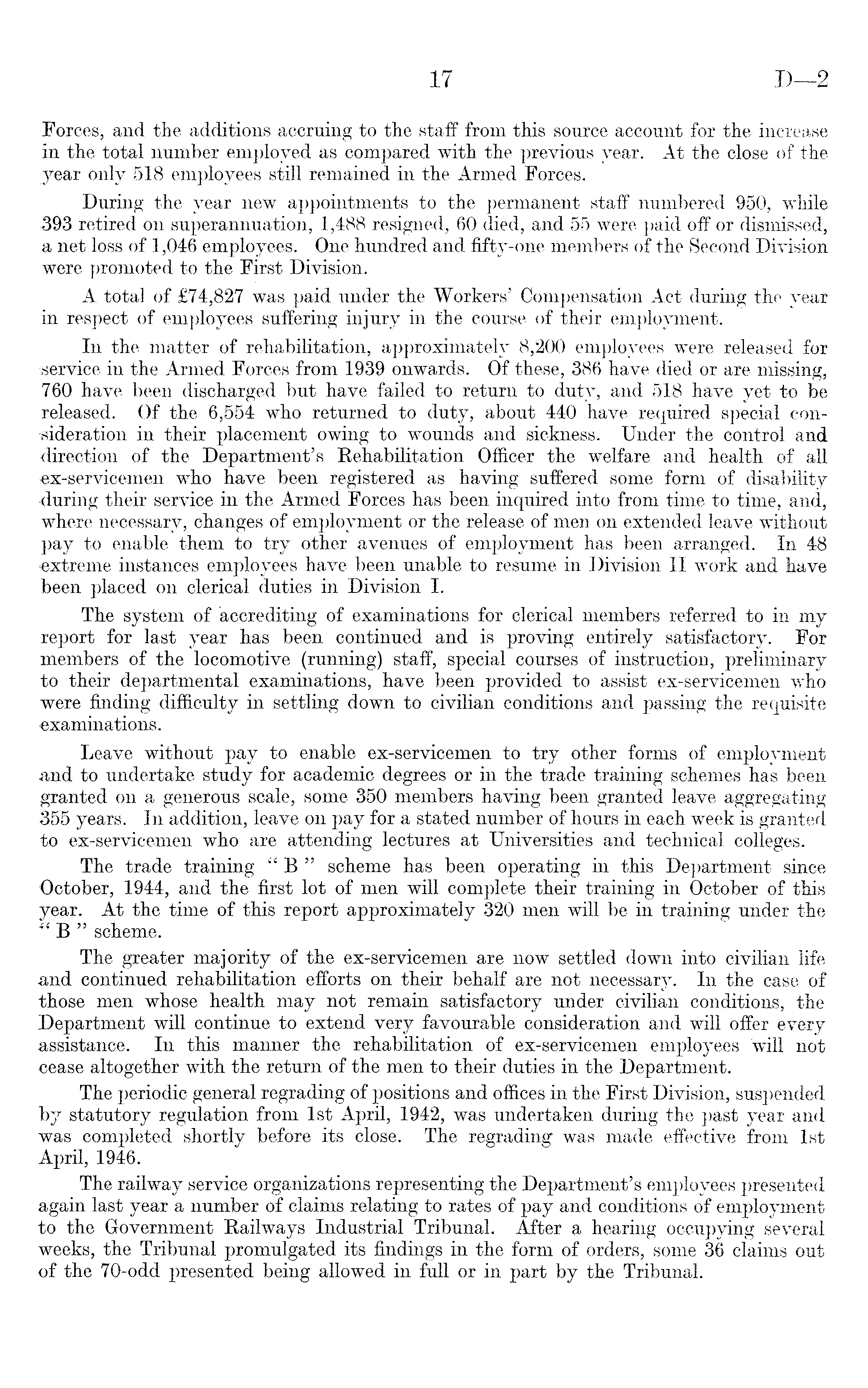 Forces, and the additions accruing to the staff from this source account for the increase in the total number employed as compared with the previous year. At the close of the year only 518 employees still remained in the Armed Forces. During the year new appointments to the permanent staff numbered 950, while 393 retired on superannuation, 1,488 resigned, 60 died, and 55 were paid off or dismissed, a net loss of 1,046 employees. One hundred and fifty-one members of the Second Division were promoted to the First Division. A total of £74,827 was paid under the Workers' Compensation Act during the year in respect of employees suffering injury in the course of their employment. In the matter of rehabilitation, approximately 8,200 employees were released for service in the Armed Forces from 1939 onwards. Of these, 386 have died or are missing, 760 have been discharged but have failed to return to duty, and 518 have yet to be released. Of the 6,554 who returned to duty, about 440 have required special consideration in their placement owing to wounds and sickness. Under the control and direction of the Department's Rehabilitation Officer the welfare and health of all ex-servicemen who have been registered as having suffered some form of disability during their service in the Armed Forces has been inquired into from time to time, and, where necessary, changes of employment or the release of men on extended leave without pay to enable them to try other avenues of employment has been arranged. In 48 extreme instances employees have been unable to resume in Division II work and have been placed on clerical duties in Division I. The system of accrediting of examinations for clerical members referred to in my report for last year has been continued and is proving entirely satisfactory. For members of the locomotive (running) staff, special courses of instruction, preliminary to their departmental examinations, have been provided to assist ex-servicemen who were finding difficulty in settling down to civilian conditions and passing the requisite examinations. Leave without pay to enable ex-servicemen to try other forms of employment and to undertake study for academic degrees or in the trade training schemes has been granted on a generous scale, some 350 members having been granted leave aggregating 355 years. In addition, leave on pay for a stated number of hours in each week is granted to ex-servicemen who are attending lectures at Universities and technical colleges. The trade training " B " scheme has been operating in this Department since October, 1944, and the first lot of men will complete their training in October of this year. At the time of this report approximately 320 men will be in training under the " B " scheme. The greater majority of the ex-servicemen are now settled down into civilian life and continued rehabilitation efforts on their behalf are not necessary. In the case of those men whose health may not remain satisfactory under civilian conditions, the Department will continue to extend very favourable consideration and will offer every assistance. In this manner the rehabilitation of ex-servicemen employees will not cease altogether with the return of the men to their duties in the Department. The periodic general regrading of positions and offices in the First Division, suspended by statutory regulation from Ist April, 1942, was undertaken during the past year and was completed shortly before its close. The regrading was made effective from Ist April, 1946. The railway service organizations representing the Department's employees presented again last year a number of claims relating to rates of pay and conditions of employment to the Government Railways Industrial Tribunal. After a hearing occupying several weeks, the Tribunal promulgated its findings in the form of orders, some 36 claims out of the 70-odd presented being allowed in full or in part by the Tribunal.