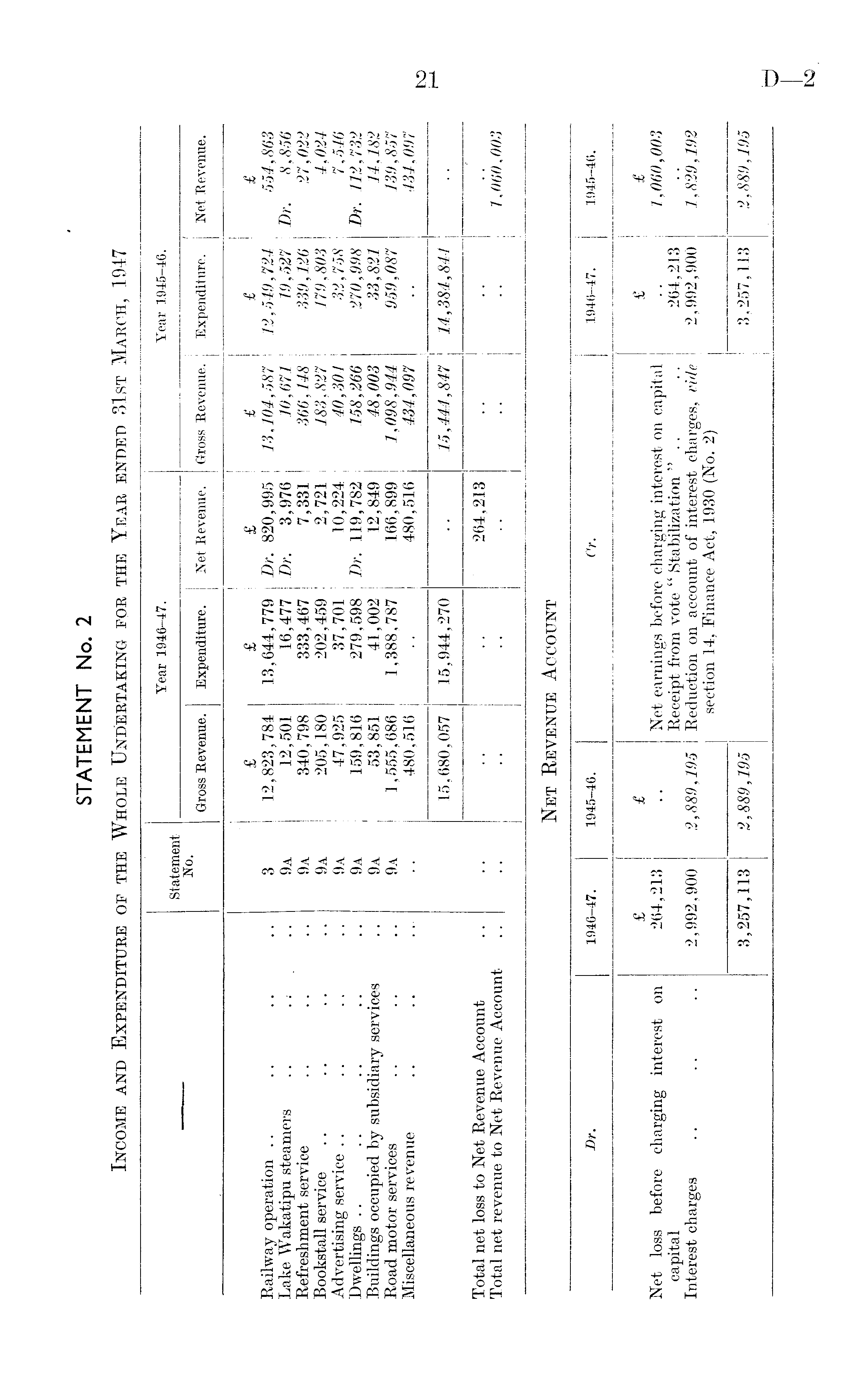 Year 1946-47. Year 1945-46. Statement No. Gross Revenue. Expenditure. Net Revenue. Gross Revenue. Expenditure. Net Revenue. £ £ £ £ £ £ Railway operation 3 12,823,784 13,644,779 Dr. 820,995 13,104,587 12,549,724 554,863 Lake Wakatipu steamers .. . j 9a 12,501 16,477 Dr. 3,976 10,671 19,527 Dr. 8,856 Refreshment service 9a 340,798 333,467 7,331 366,148 339,126 27,022 Bookstall service 9a 205,180 202,459 2,721 183,827 179,803 4,024 Advertising service 9a 47,925 37,701 10,224 40,304 32,758 7,546 Dwellings 9a 159,816 279,598 Dr. 119,782 158,266 270,998 Dr. 112,732 Buildings occupied by subsidiary services 9a 53,851 41,002 12,849 48,003 33,821 14,182 Road motor services 9a 1,555,686 1,388,787 166,899 1,098,944 959,087 139,857 Miscellaneous revenue - 480,516 480,516 434,097 434,097 15,680,057 15,944,270 15,444,847 14,384,844 Total net loss to Net Revenue Account 264,213 Total net revenue to Net Revenue Account 1,060,003