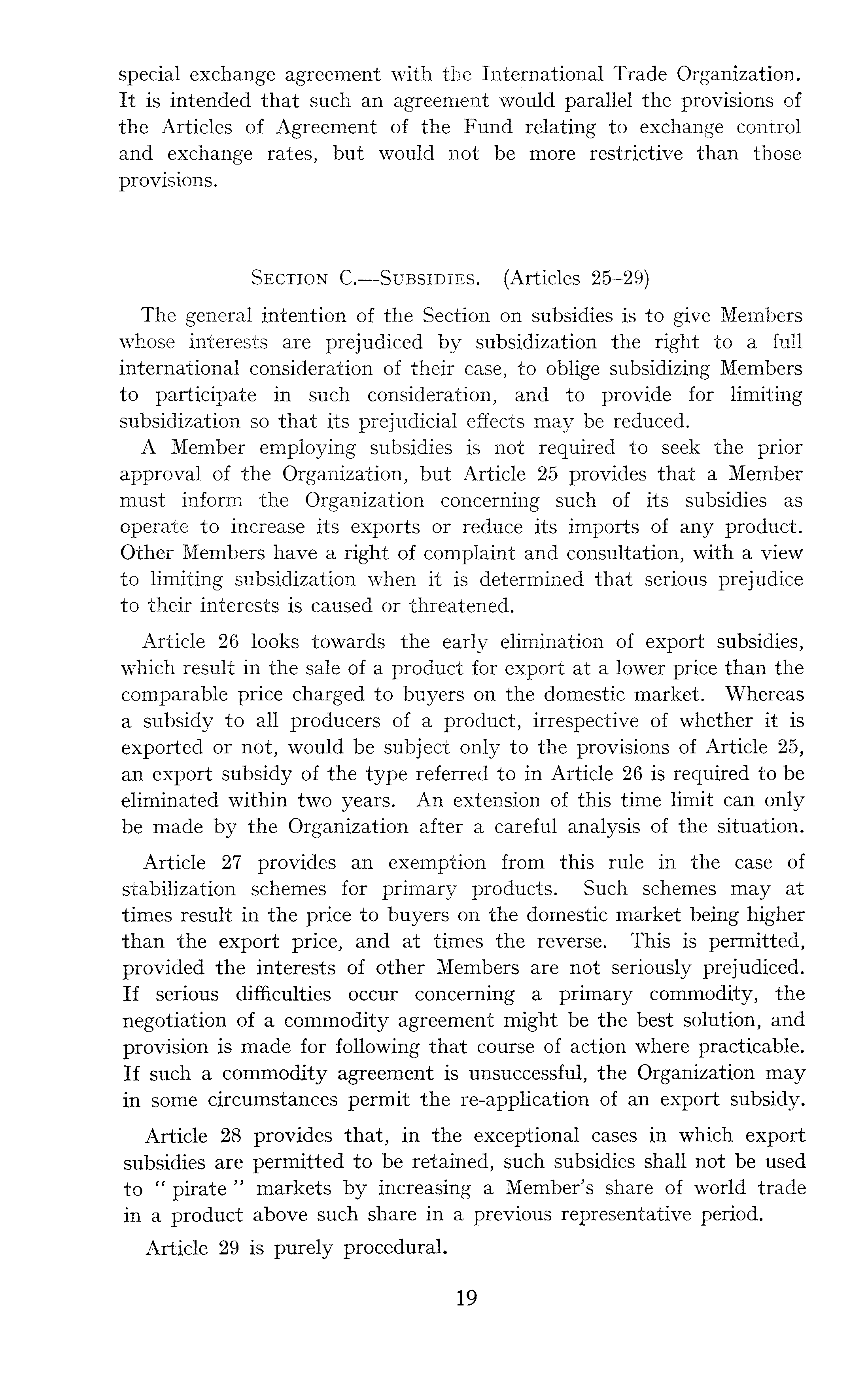 special exchange agreement with the International Trade Organization. It is intended that such an agreement would parallel the provisions of the Articles of Agreement of the Fund relating to exchange control and exchange rates, but would not be more restrictive than those provisions. Section C.—Subsidies. (Articles 25-29) The general intention of the Section on subsidies is to give Members whose interests are prejudiced by subsidization the right to a full international consideration of their case, to oblige subsidizing Members to participate in such consideration, and to provide for limiting subsidization so that its prejudicial effects may be reduced. A Member employing subsidies is not required to seek the prior approval of the Organization, but Article 25 provides that a Member must inform the Organization concerning such of its subsidies as operate to increase its exports or reduce its imports of any product. Other Members have a right of complaint and consultation, with a view to limiting subsidization when it is determined that serious prejudice to their interests is caused or threatened. Article 26 looks towards the early elimination of export subsidies, which result in the sale of a product for export at a lower price than the comparable price charged to buyers on the domestic market. Whereas a subsidy to all producers of a product, irrespective of whether it is exported or not, would be subject only to the provisions of Article 25, an export subsidy of the type referred to in Article 26 is required to be eliminated within two years. An extension of this time limit can only be made by the Organization after a careful analysis of the situation. Article 27 provides an exemption from this rule in the case of stabilization schemes for primary products. Such schemes may at times result in the price to buyers on the domestic market being higher than the export price, and at times the reverse. This is permitted, provided the interests of other Members are not seriously prejudiced. If serious difficulties occur concerning a primary commodity, the negotiation of a commodity agreement might be the best solution, and provision is made for following that course of action where practicable. If such a commodity agreement is unsuccessful, the Organization may in some circumstances permit the re-application of an export subsidy. Article 28 provides that, in the exceptional cases in which export subsidies are permitted to be retained, such subsidies shall not be used to " pirate " markets by increasing a Member's share of world trade in a product above such share in a previous representative period. Article 29 is purely procedural.